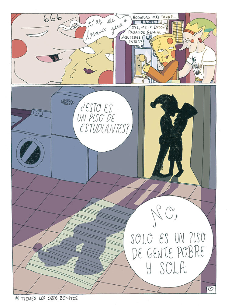 A su vez, también queda claro en el cómic que las dos grandes coordenadas generacionales son el amor y la amistad… Pero el amor aparece jodido si las únicas opciones son Papanazzi y Lobo Tommy, ¿no? Jajaja. A ver, eso es un poco el movidote que estaba sucediendo a medida que hacía el cómic. POR FAVOR, no es ninguna guía para la vida, y no le recomiendo a nadie que se meta por esos lares. Hablad siempre las cosas primero y os ahorraréis mucho drama. Aunque, ¿qué mejor manera de evadirse de 42 horas a la semana de trabajo precario que un buen drama?