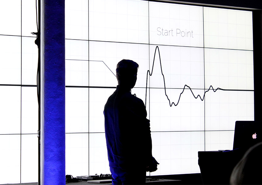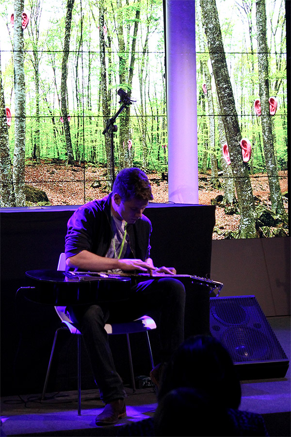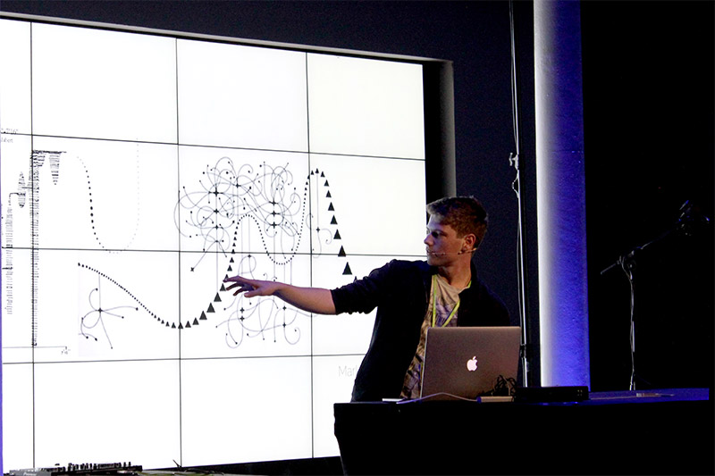 El proyecto que le ha llevado a participar en Sónar +D, sin embargo, es «Contact: Augmented Acoustics«, una instalación que permite convertir cualquier superficie táctil en un instrumento musical. Gracias a micrófonos y análisis de ondas de reconocimiento de golpes sobre una superficie, la instalación crea sonidos en respuesta a esos golpes. Es este un proyecto que explora el sentido del tacto y el oído uniendo lo analógico y lo digital, una interacción entre hombre y tecnología para crear sonidos que se pueden ver y tocar. Músico, arquitecto y coder creativo, Faire explora el movimiento de las ondas sonoras en el espacio utilizando el tacto, con el que genera sonidos nuevos a través de la resonancia de los mismos. Estos sonidos amplificados crean imágenes que representan el baile de esas ondas. Con ello, hace tangible la belleza de lo intangible, representando gráficamente algo tan etéreo como la música. [FOTOS: AnTruan]