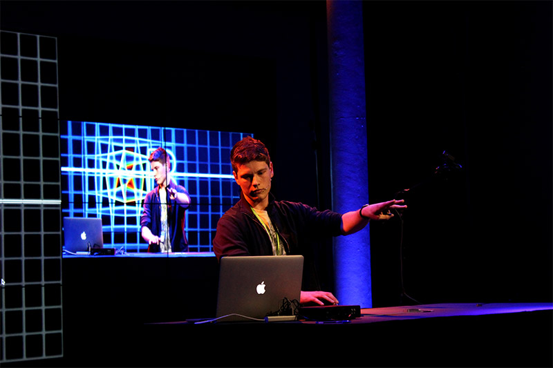 El primero de estos live shows se celebró el pasado jueves 5 de marzo en el recién estrenado Espacio Mazda del barrio del Born de Barcelona, en el que pudimos ver en directo a Felix Faire, joven británico considerado como uno de los 7 Diseñadores del Futuro según el Design Council de Londres. Desde pequeño, Faire ha tenido una relación muy estrecha con el mundo de la música, ya que con siete años tocaba el piano y más tarde se interesó por la guitarra. El artista quiso aunar dos de sus pasiones, arquitectura y música, investigando las maneras gráficas de describir la música a lo largo de la historia. Se encontró entonces con la obra de Oskar Fischinger, quien realizó la primera pieza de la historia utilizando música e ilustración en movimiento. Investigando en este campo, Faire también se dio cuenta de que podemos manipular sonidos con el movimiento de nuestra mano o de nuestro cuerpo: cuando nuestra mano se balancea con fuerza en el aire crea un sonido, que puede ser más o menos intenso dependiendo de la fuerza con la que la balancees. Esto dio lugar a su investigación “Music aided design: The foundation of spatial music”.