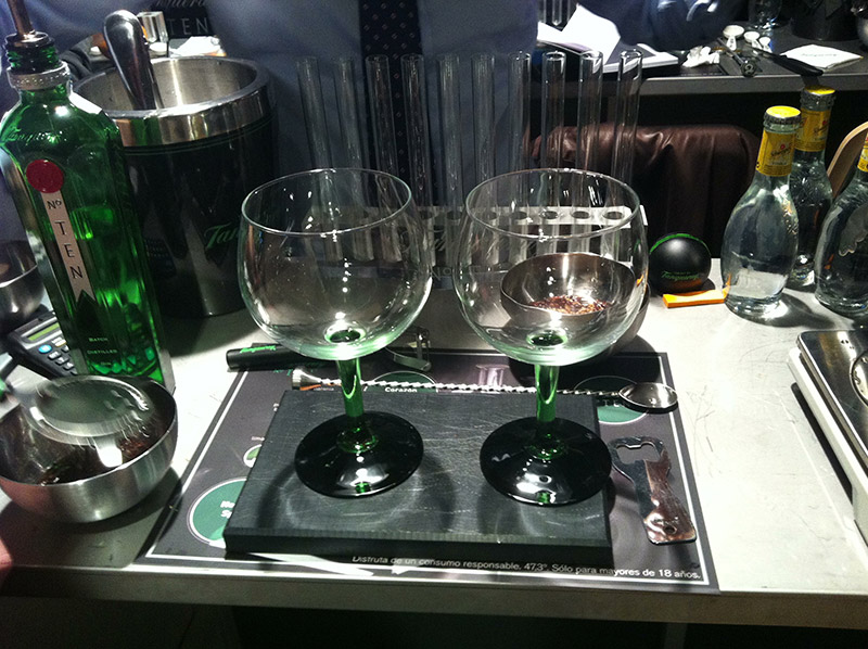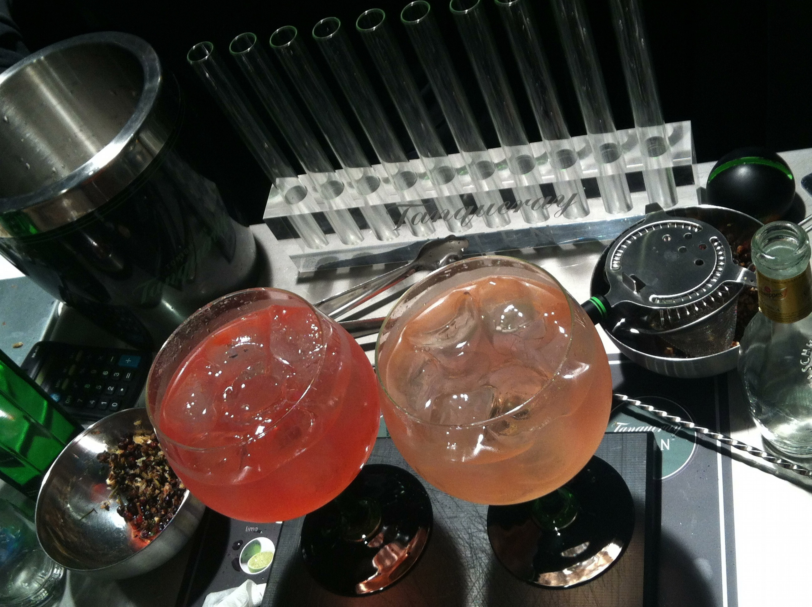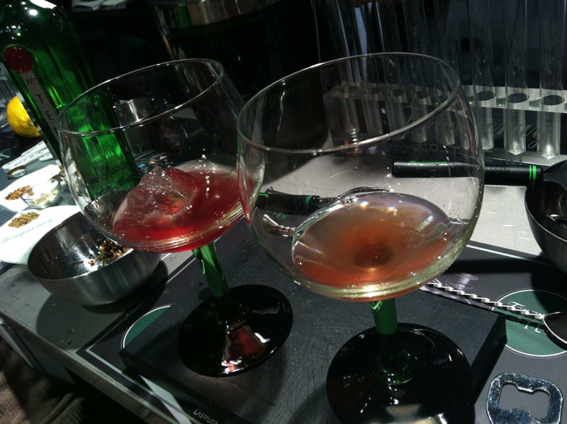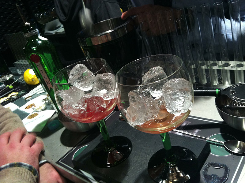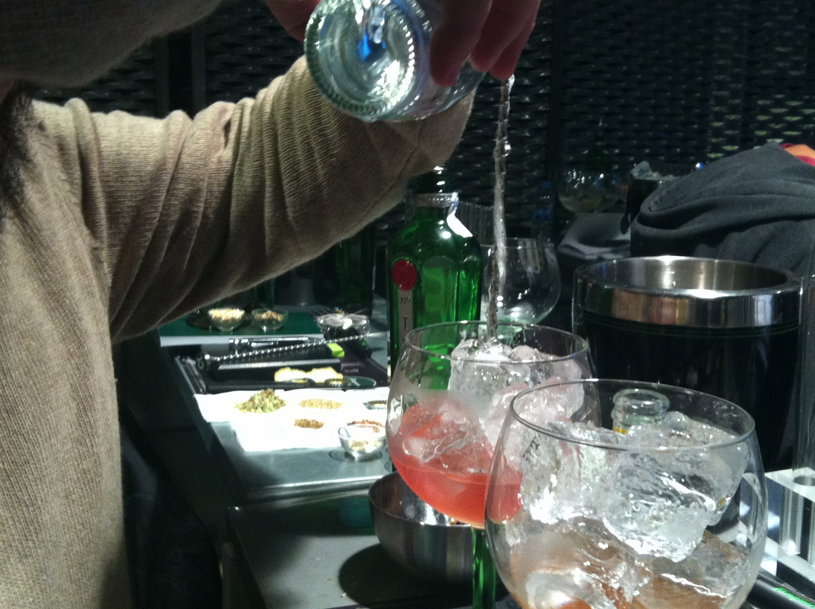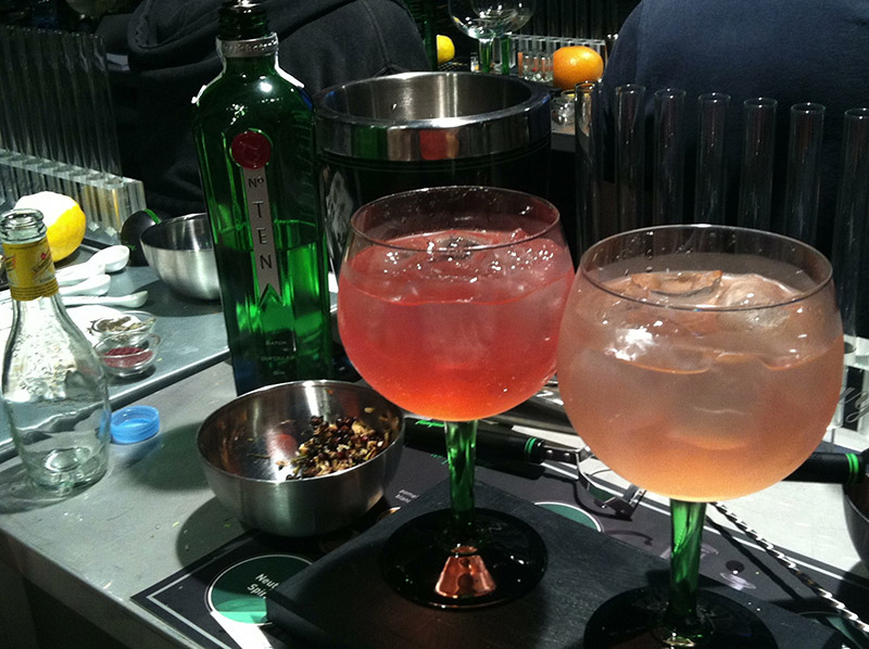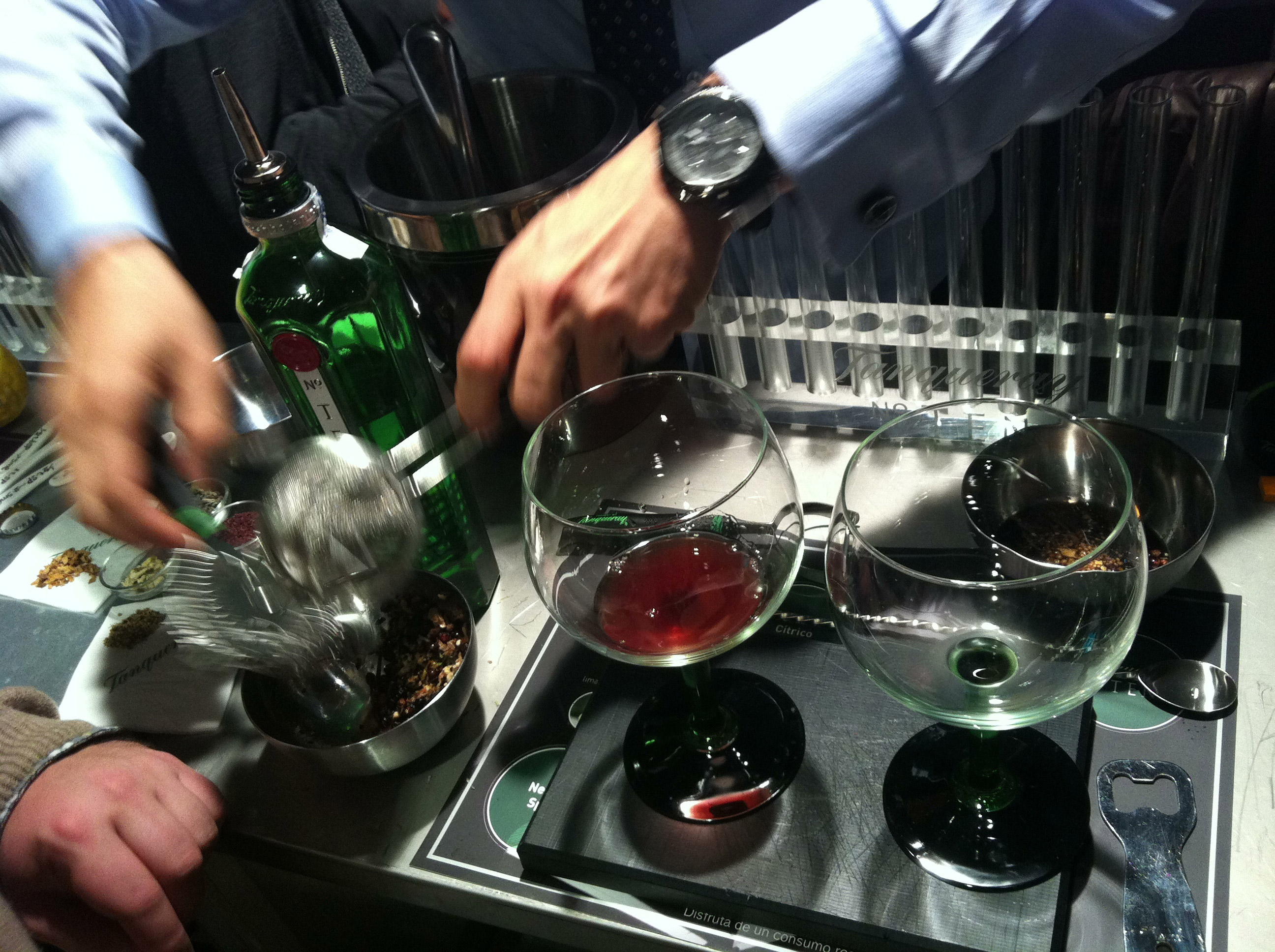 Los cocteleros a nuestro alrededor parecían realmente científicos locos, pesando sus ingredientes, mezclándolos, viendo cómo reaccionaban con la ginebra. Nosotros, por el contrario, éramos algo así como niños jugando con el Quimicefa. Tras hacer nuestra mezcla de botánicos y tenerla un rato en un cuenco con nuestra ginebra Tanqueray NªTEN, procedimos a ponerla en la copa con hielo abundante y a regarla con una buena tónica servida como Dios manda: con la cucharilla en espiral. ¿El resultado? Podéis verlo en las fotos: a uno lo bautizamos con el nombre de Angelica Houston (por llevar una buena razón de raíz de angélica) y al otro como El Salmón (debido a su ¿sugerente? color)… Ahora bien, os podemos asegurar que el sabor era excepcional, es por eso por lo que, después de que nos dejaran meter nuestra mezcla en una bonita caja de metal y llevárnosla a casa, le hemos estado dando caña religiosamente cada tarde a las 5. Nosotros en la redacción no tenemos hora del té: tenemos hora del Tea Tonic de Tanqueray NªTEN.
