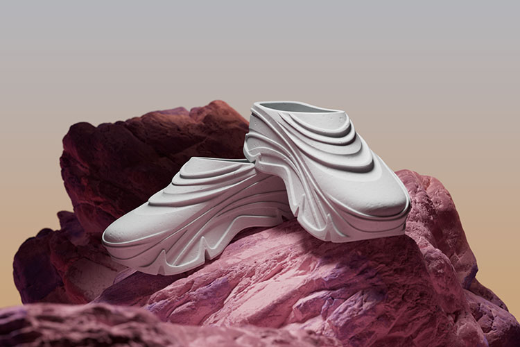 Tal cual: este zueco parece haber sido tallado a mano en un bloque de piedra. Lo que no deja de tener su gracia, si tenemos en cuenta que es una prenda extremadamente ligera gracias al diseño de XL Extralight (que también ha aportado el uso del compuesto Susteinable+, una tecnología compuesta por un 51% de residuos industriales). La suma de todas las partes implicadas solo puede arrojar un resultado: la fractura de las barreras del mundo digital para dejar que la estética del metaverso fluya libre hacia nuestra realidad.