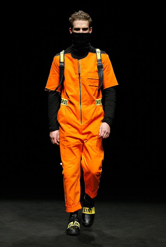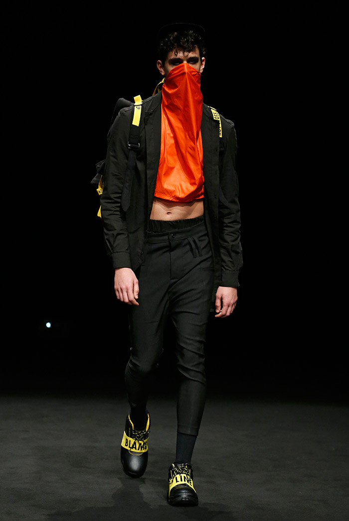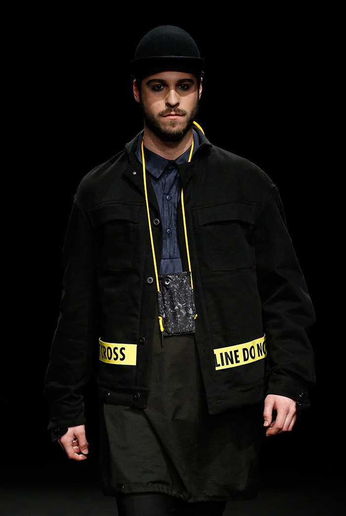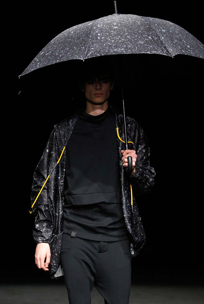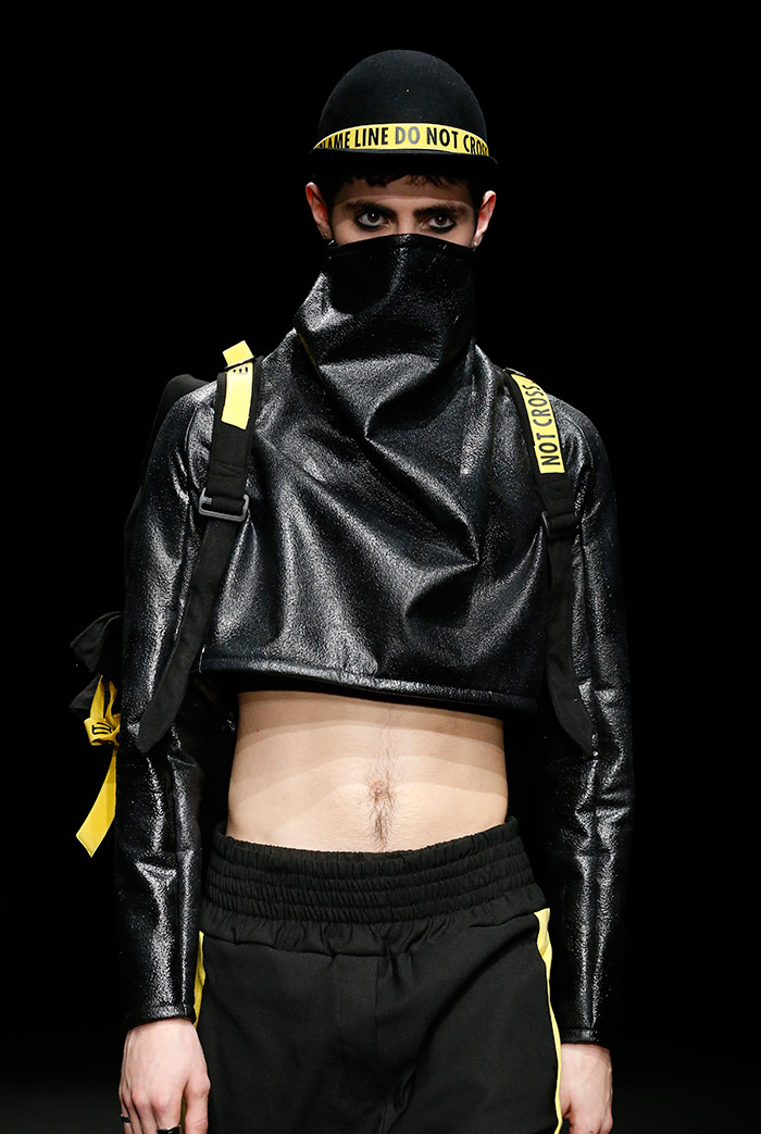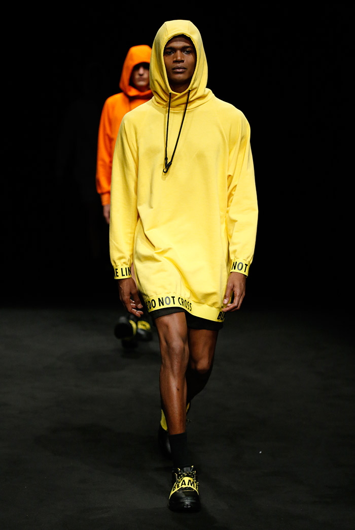Lo primero que llama la atención en esta colección es cómo, en vez de haber sido ideada «hacia fuera», parece más bien pensada «hacia dentro». Abundan las capuchas y las piezas que tapan parte de la cara, preservando así la intimidad y el derecho al anonimato de quien las viste. Y, por si esto fuera poco, la colección al completo parece articularse en torno al uso de unas cintas amarillas que recuerdan poderosamente a los cordones policiales de «prohibido el paso», otra referencia más a preservar nuestro propio espacio íntimo. Lo mejor de todo es que este discurso crítico se entrelaza a la perfección con el ADN propio de la firma de Pablo Puig Gomar y sus volúmenes amplios, su visión estilizadísima del sport, sus colores en bloque (con preferencia por los tonos oscuros) y su sugerente desdén por las simetrías y por los patrones preestablecidos.