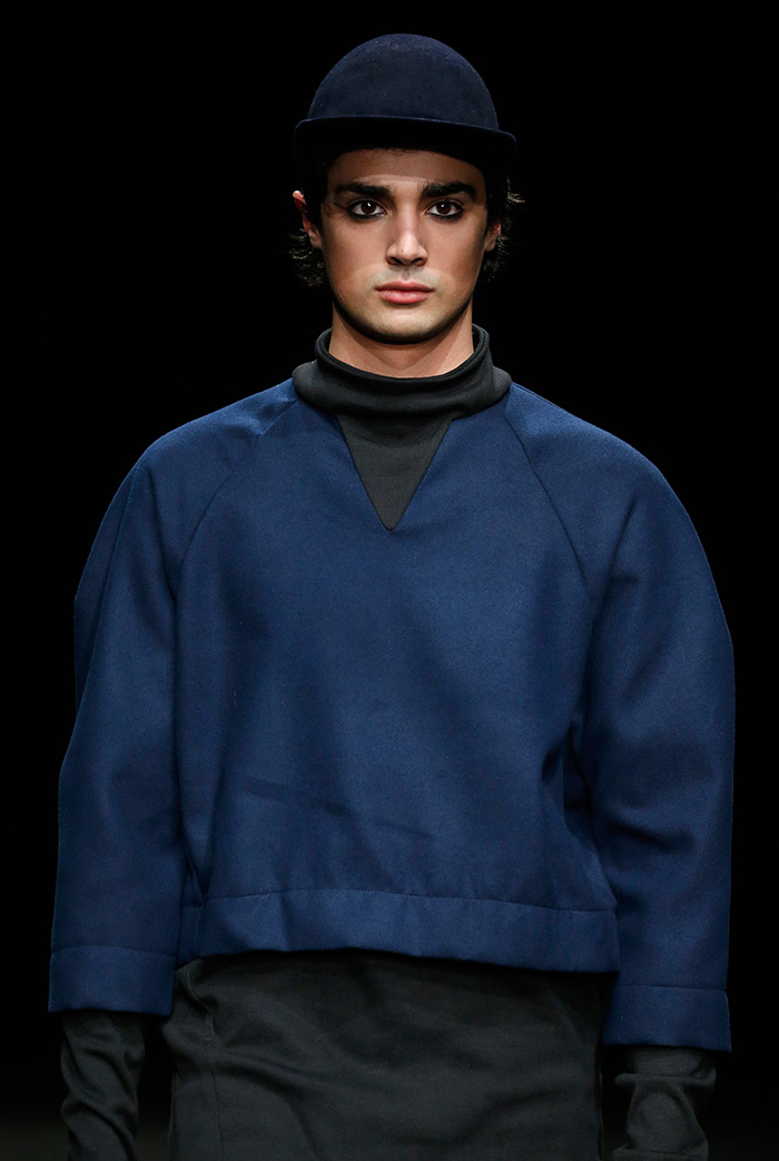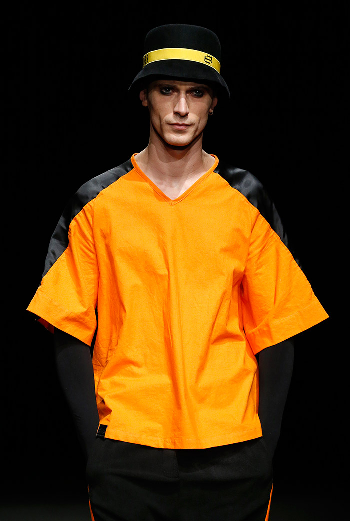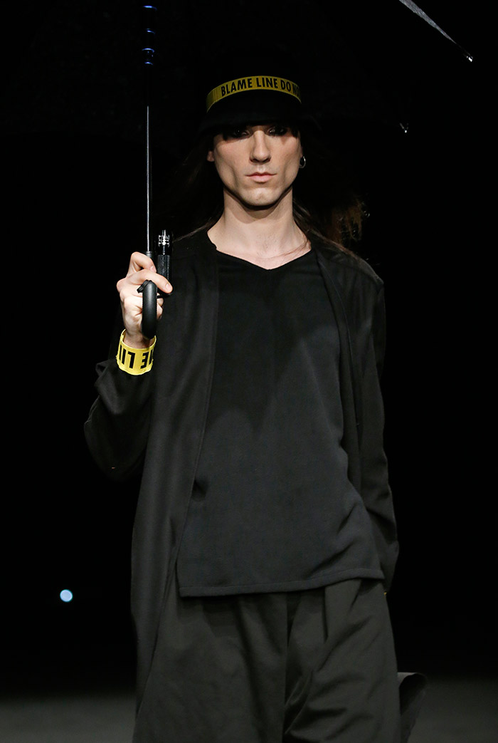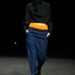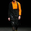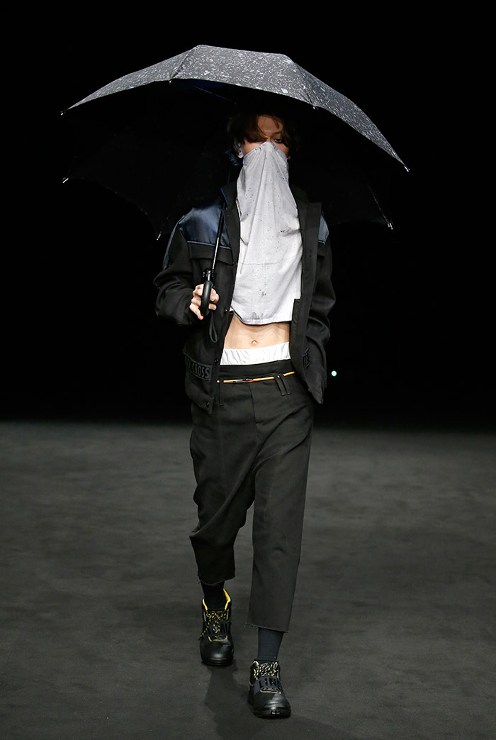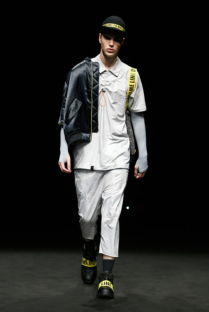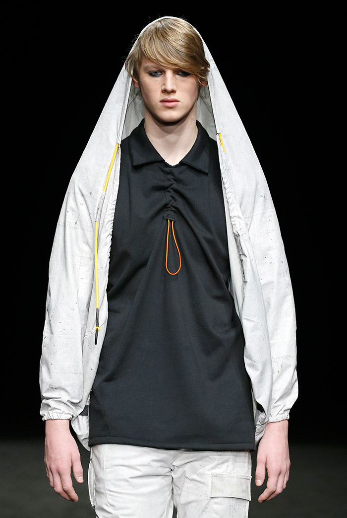 Lo primero que llama la atención en esta colección es cómo, en vez de haber sido ideada «hacia fuera», parece más bien pensada «hacia dentro». Abundan las capuchas y las piezas que tapan parte de la cara, preservando así la intimidad y el derecho al anonimato de quien las viste. Y, por si esto fuera poco, la colección al completo parece articularse en torno al uso de unas cintas amarillas que recuerdan poderosamente a los cordones policiales de «prohibido el paso», otra referencia más a preservar nuestro propio espacio íntimo. Lo mejor de todo es que este discurso crítico se entrelaza a la perfección con el ADN propio de la firma de Pablo Puig Gomar y sus volúmenes amplios, su visión estilizadísima del sport, sus colores en bloque (con preferencia por los tonos oscuros) y su sugerente desdén por las simetrías y por los patrones preestablecidos.