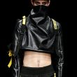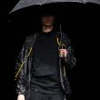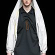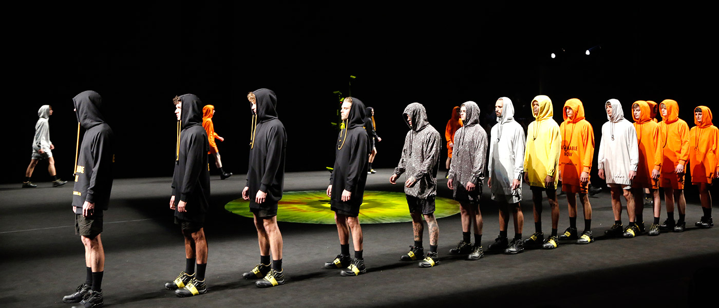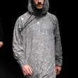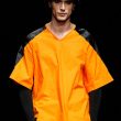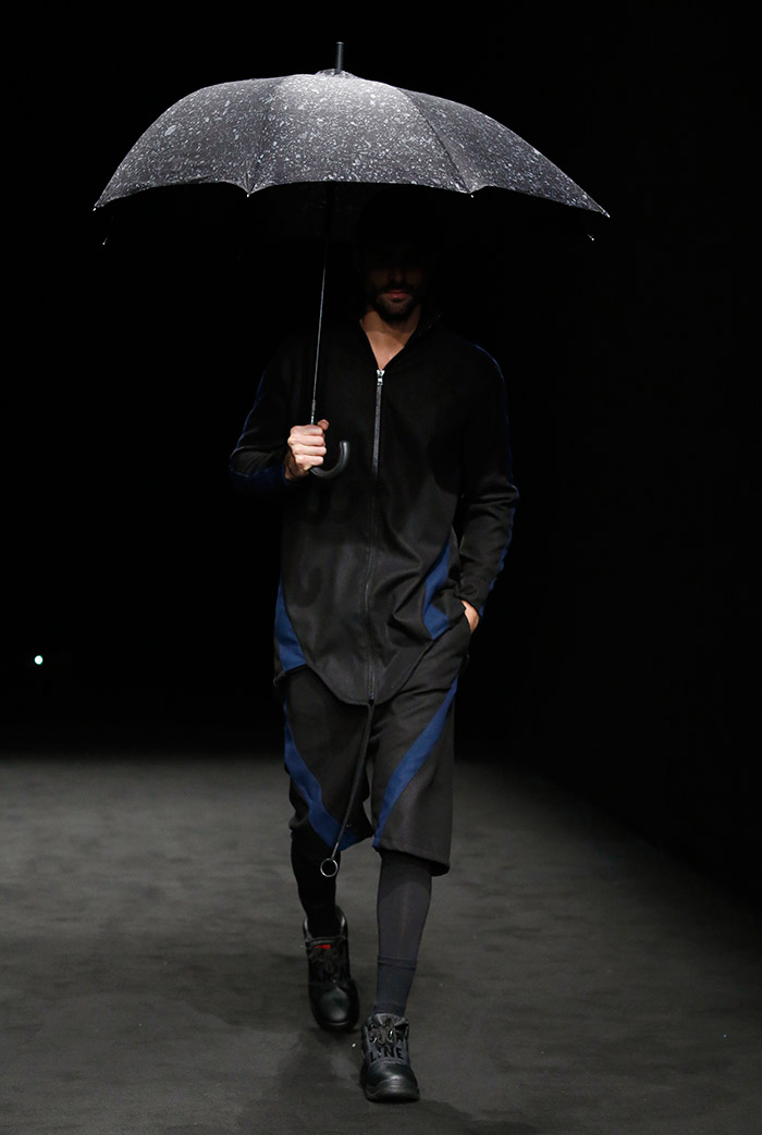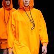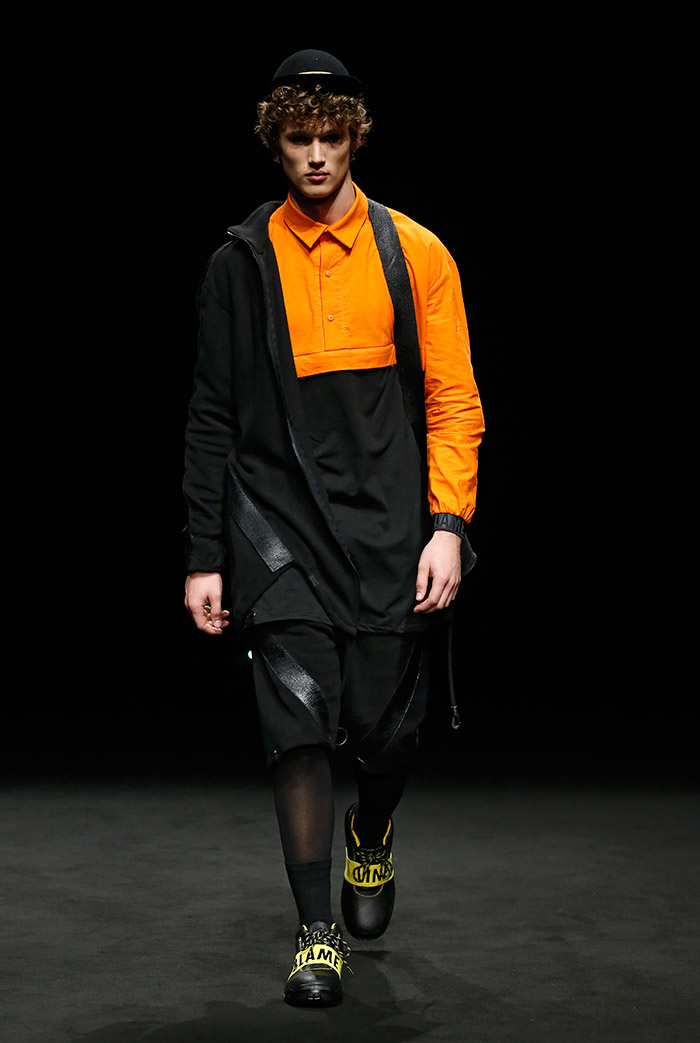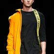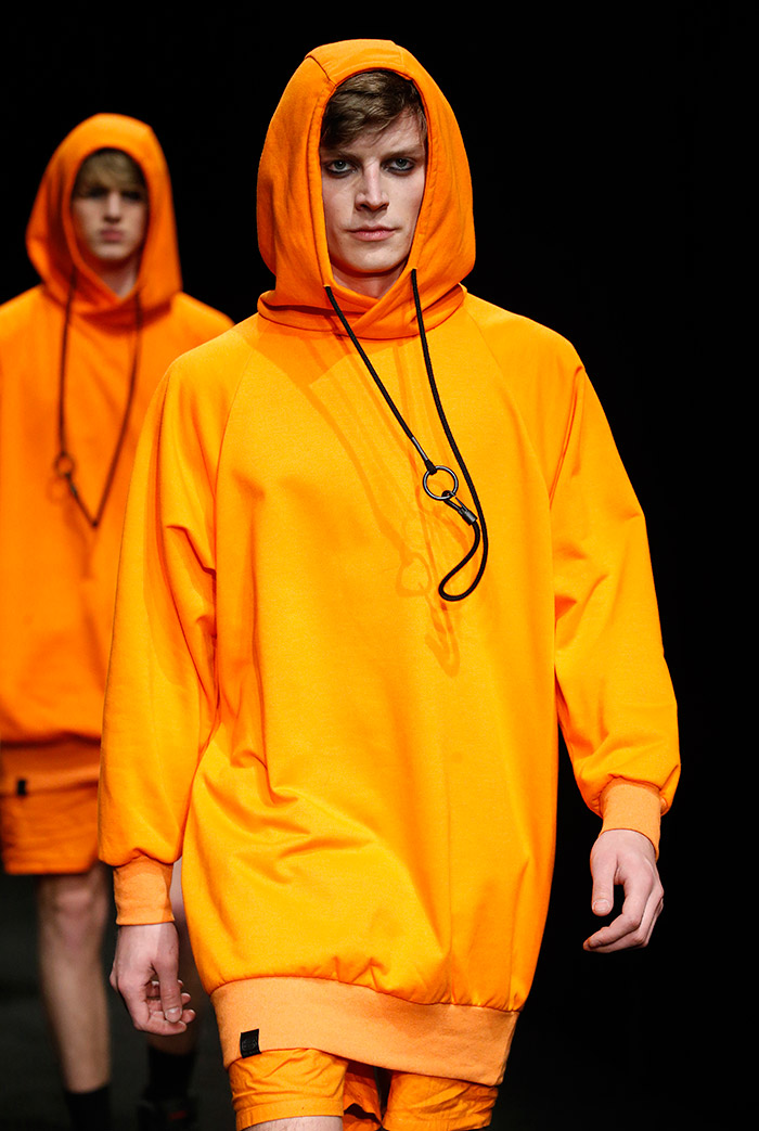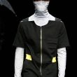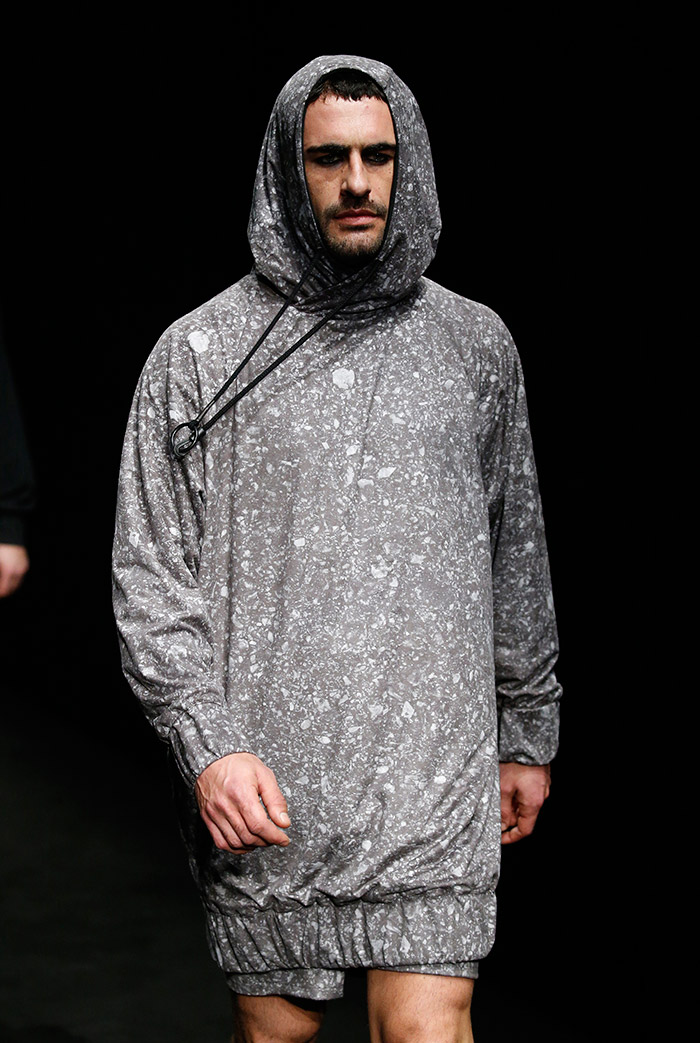 Lo primero que llama la atención en esta colección es cómo, en vez de haber sido ideada «hacia fuera», parece más bien pensada «hacia dentro». Abundan las capuchas y las piezas que tapan parte de la cara, preservando así la intimidad y el derecho al anonimato de quien las viste. Y, por si esto fuera poco, la colección al completo parece articularse en torno al uso de unas cintas amarillas que recuerdan poderosamente a los cordones policiales de «prohibido el paso», otra referencia más a preservar nuestro propio espacio íntimo. Lo mejor de todo es que este discurso crítico se entrelaza a la perfección con el ADN propio de la firma de Pablo Puig Gomar y sus volúmenes amplios, su visión estilizadísima del sport, sus colores en bloque (con preferencia por los tonos oscuros) y su sugerente desdén por las simetrías y por los patrones preestablecidos.