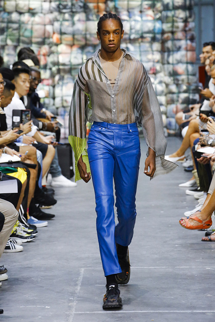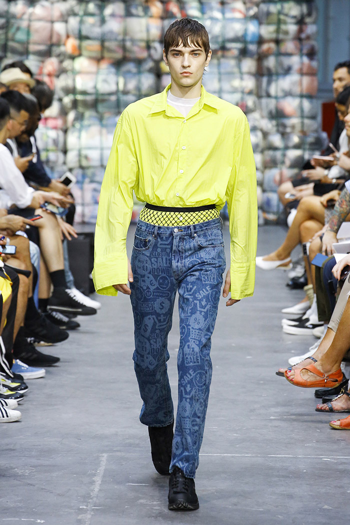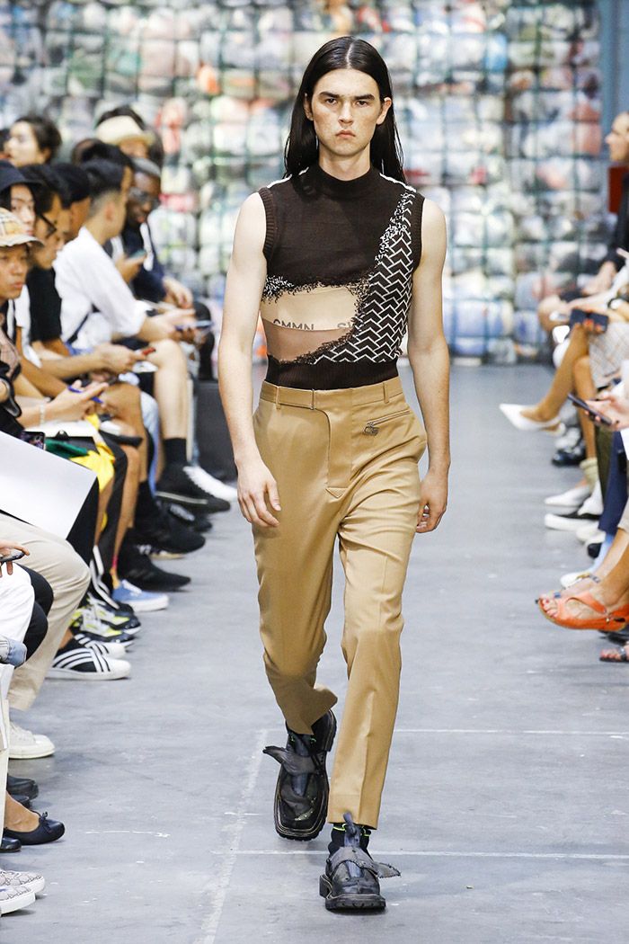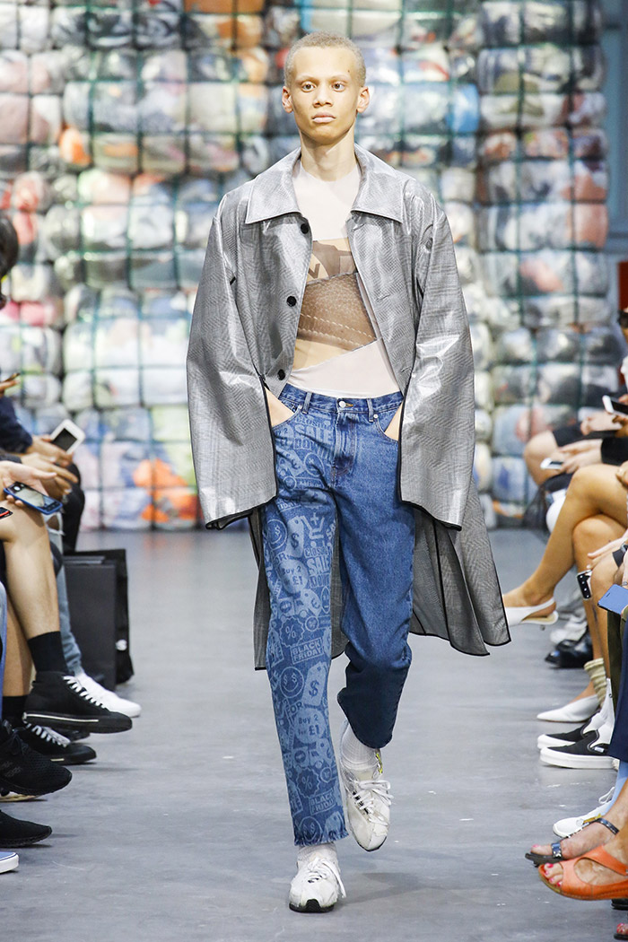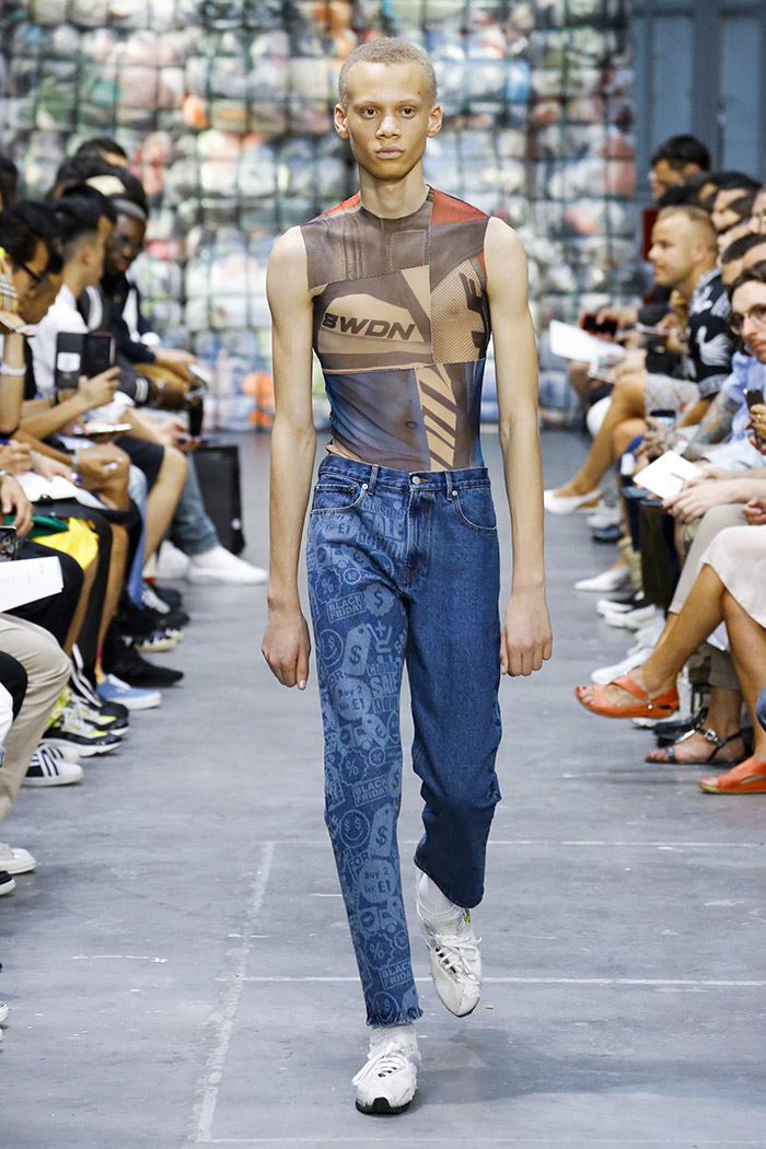Es por eso también que «It’s a Jumble Out There» es una colección que remite a colecciones pasadas de Bakir y Hedlund: muchas de las prendas están confeccionadas a partir de piezas de colecciones pasadas de CMMN SWDN. E incluso los zapatos, una de las partes más fascinantes del desfile, son creaciones de Helen Kirkum partiendo de sneakers «chunky» de otras temporadas de la firma. El resultado es una colección Frankenstein que apuesta por la reutilización y que bascula a medio camino, como siempre ha ocurrido en CMMN SWDN, entre el ready-to-wear más accesible y las extravaganzas de última generación a lo Demna o Gosha. Poco oversize y mucha piel a la vista, poco chandaleo y bastante office core en una colección que funciona como un quilt gigantesco en el que las prendas son la suma de pasado y presente, con concesiones tan exhibicionistas como los jeans sobre los que se han grabado con láser anuncios de «oferta».