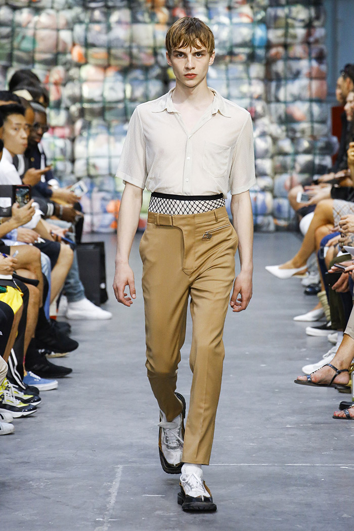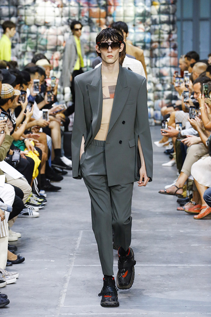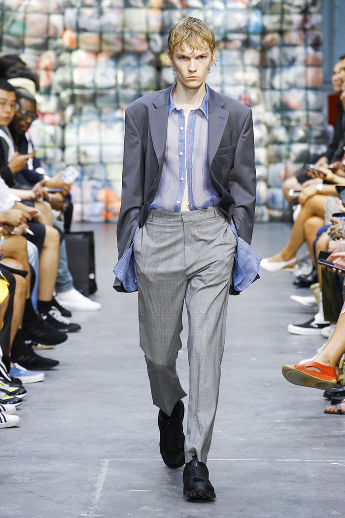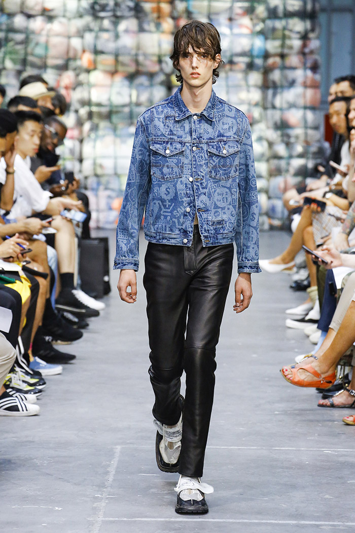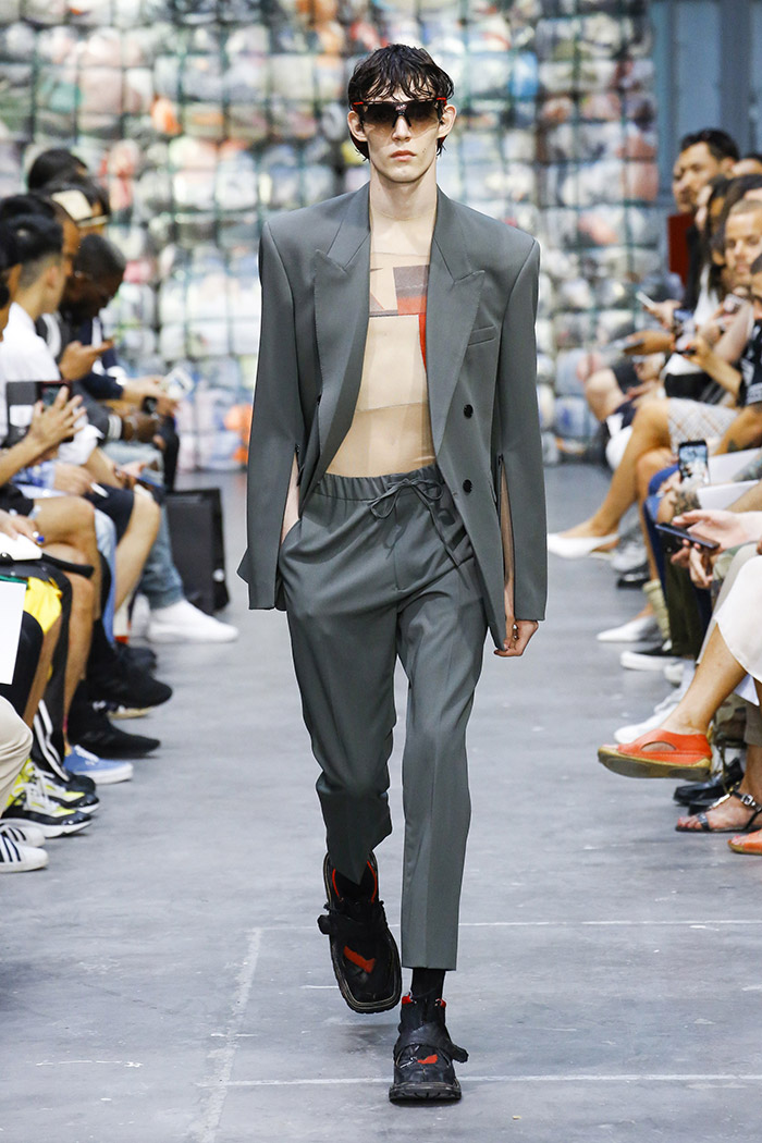 Es por eso también que «It’s a Jumble Out There» es una colección que remite a colecciones pasadas de Bakir y Hedlund: muchas de las prendas están confeccionadas a partir de piezas de colecciones pasadas de CMMN SWDN. E incluso los zapatos, una de las partes más fascinantes del desfile, son creaciones de Helen Kirkum partiendo de sneakers «chunky» de otras temporadas de la firma. El resultado es una colección Frankenstein que apuesta por la reutilización y que bascula a medio camino, como siempre ha ocurrido en CMMN SWDN, entre el ready-to-wear más accesible y las extravaganzas de última generación a lo Demna o Gosha. Poco oversize y mucha piel a la vista, poco chandaleo y bastante office core en una colección que funciona como un quilt gigantesco en el que las prendas son la suma de pasado y presente, con concesiones tan exhibicionistas como los jeans sobre los que se han grabado con láser anuncios de «oferta».
