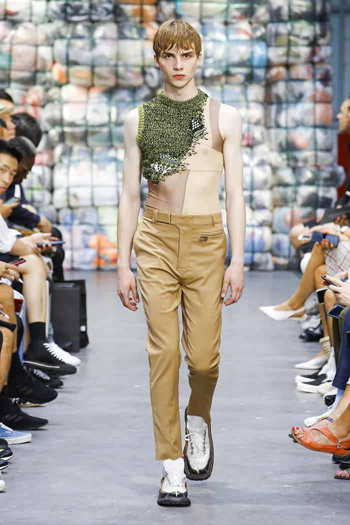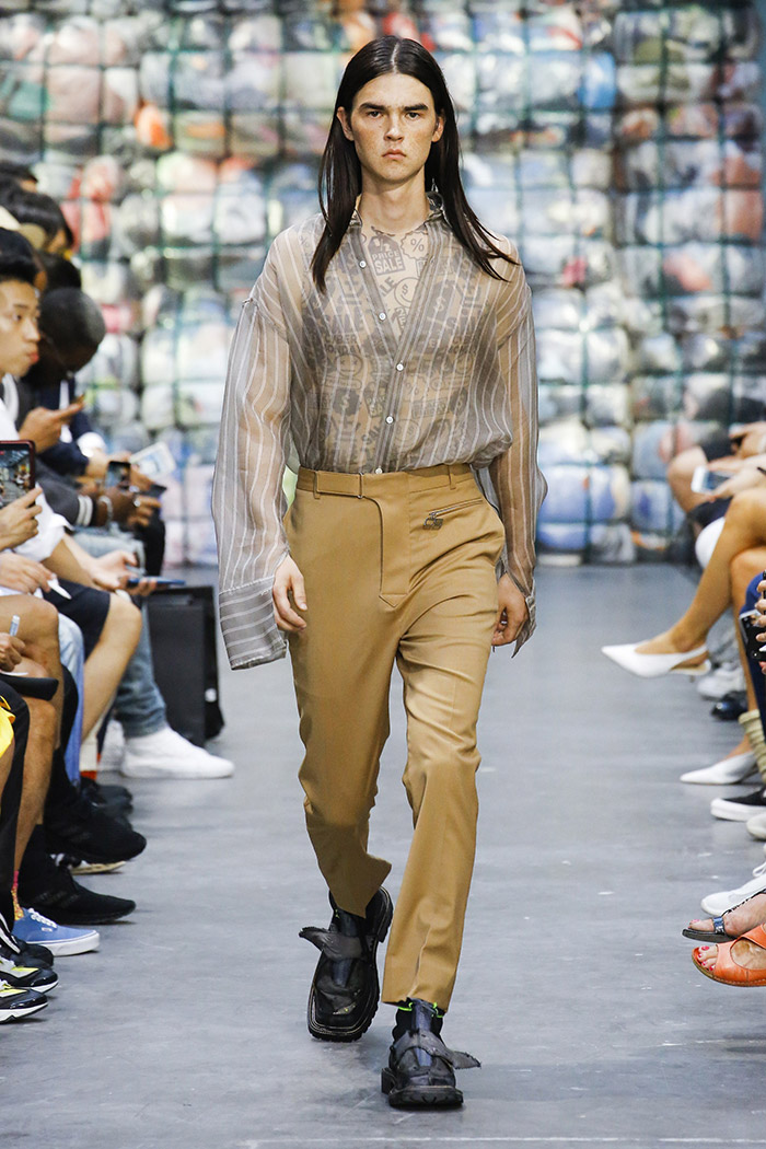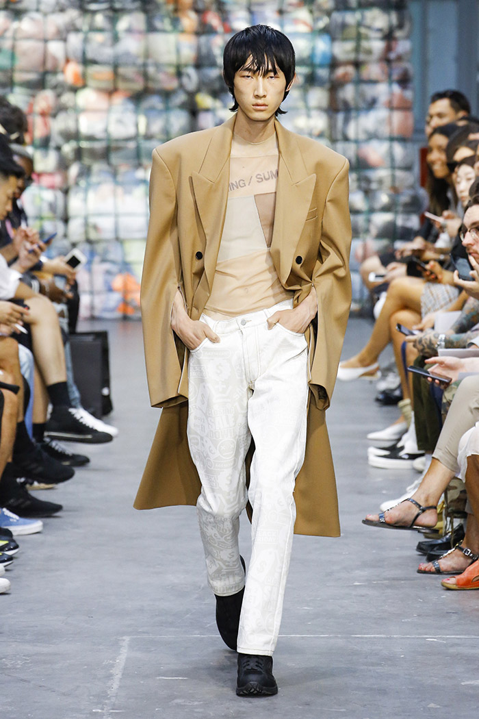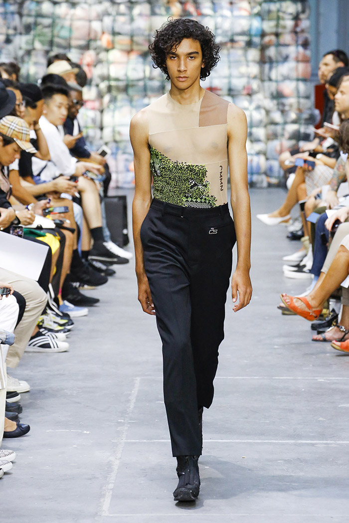 CMMN SWDN es la firma de Saif Bakir y Emma Hedlund que ya hace varias temporadas que tiene proyección internacional… Pero nada parecido a la que les está granjeando su nueva colección bajo el título de «It’s a Jumble Out There» («jumble», por cierto, significa «revoltijo»). Y es que no todos los días llega uno a una pasarela y se la encuentra bloqueada por montañas de ropa. La temática de denuncia quedaba clara así desde el principio: CMMN SWDN quieren poner el dedo en la llaga del consumo masivo y el fast fashion tan poco sostenible y tan dañino para el medio ambiente.