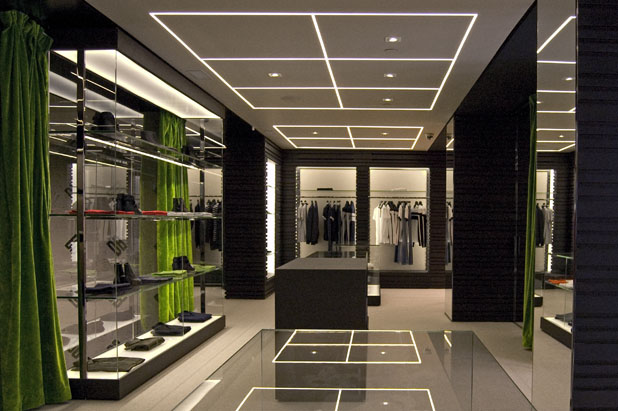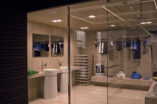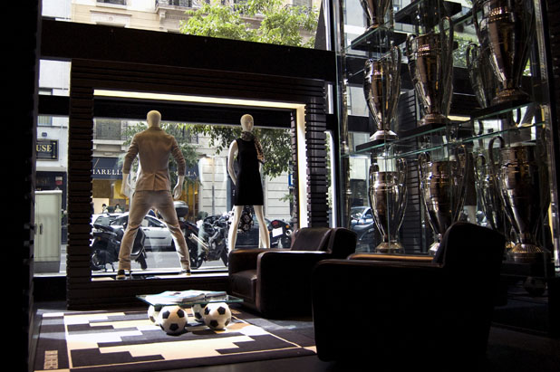 Entre los anaqueles destinados a la exposición del producto también encuentran espacio también los objetos personales, fotos, recuerdos, juegos y libros, pero incluso tapetes, trofeos, muebles antiguos y otros objetos valiosos. El resultado es un conjunto lujoso para expresar el estilo de vida del atleta que vive en la maison y que desde siempre ha representado a la firma. Esta tienda llama la atención porque el mobiliario está de acuerdo con el de la flagship store de Milán, inaugurada en 2009: hay paredes en travertino decoradas con elegantes logotipos de metal, pavimentos en valiosa madera wengè, mesas de cristal que se apoyan sobre balones de fútbol de mármol y cortinajes en un riguroso verde prado, lo que hace de la visita a la nueva tienda toda una nueva experiencia que, evidentemente, hay que vivir.