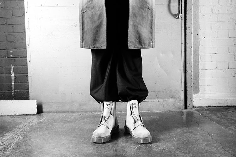 En esta ocasión, la colabo consta de tres siluetas: un zapato 1461 negro, un zapato blanco monocromo 1461 y una bota 1460. Todos los modelos se ven elevados por la archiconocida suela Bex de doble altura, y en los tres diseños destacan la presencias de regias estructuras sin ojales y la substitución de los cordones por cremalleras frontales. La sutilidad hace acto de presencia en detalles como los remaches de bronce, el cuero en relieve y algunos elementos 100% Dr. Martens, como la trabilla de talón AirWair en negro y amarillo y el pespunte amarillo.