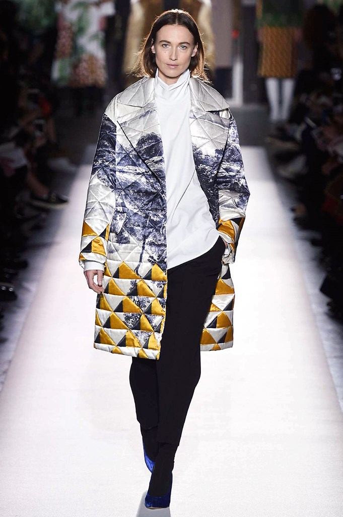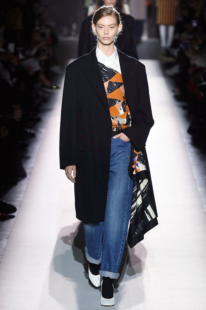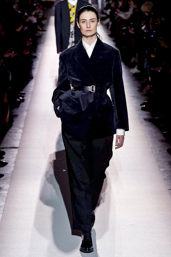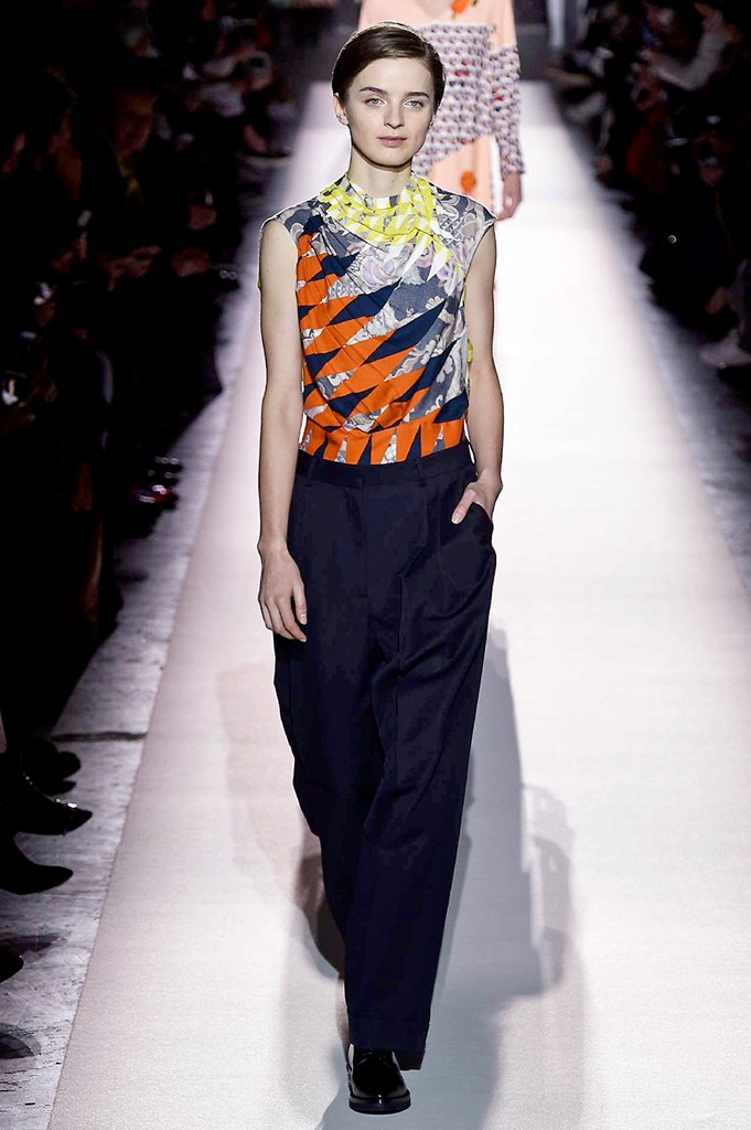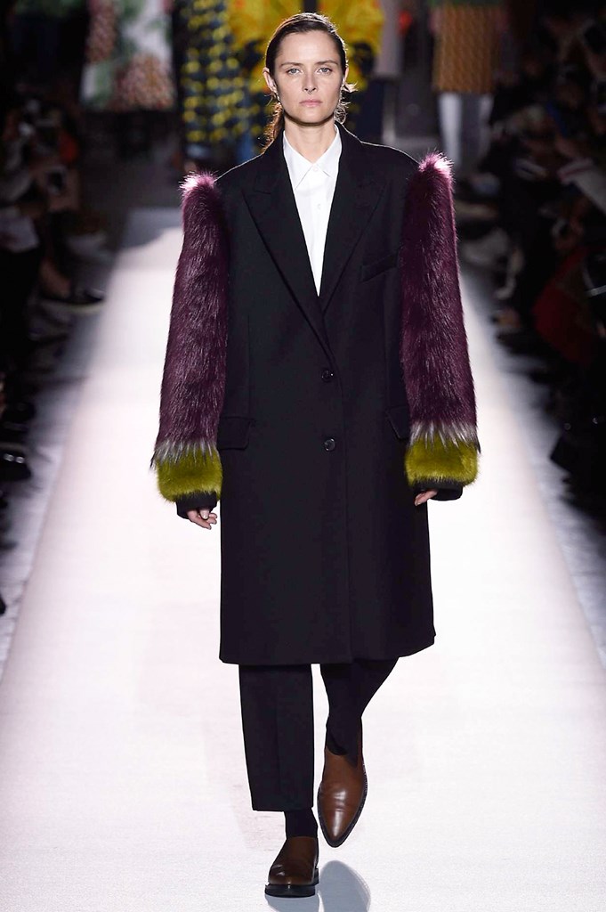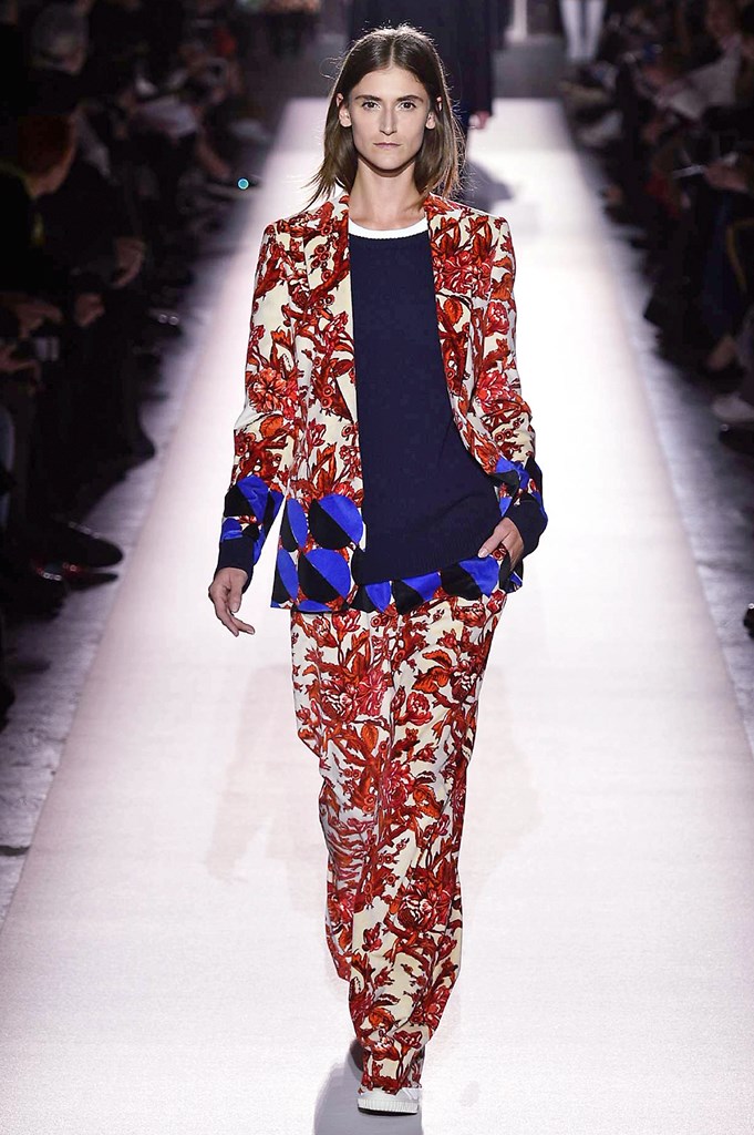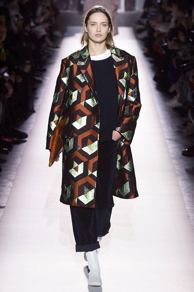 Ahora bien, la protagonista del desfile fue la que tenía que ser: la moda. Más en concreto, la moda de Dries van Noten. Por mucho que el diseñador se empeñara en esa austeridad que le es tan conocida, hay que reconocer que esta colección número 100 para el próximo otoño / invierno encapsula todas las constantes de la historia de van Noten: el minimalismo, la flexibilidad en el concepto de feminidad, la cerebralidad aparentemente fría, los estampados matemáticos, los coloridos calculados, las siluetas masculinas, los materiales técnicos… Todo estaba aquí para quien necesite refrescar la memoria y, sobre todo, para aquellos recién llegados que necesiten una lección de moda exprés. [Más información en la web de Dries Van Noten]