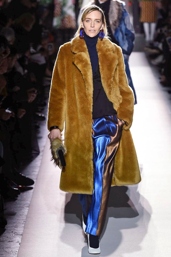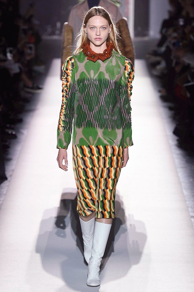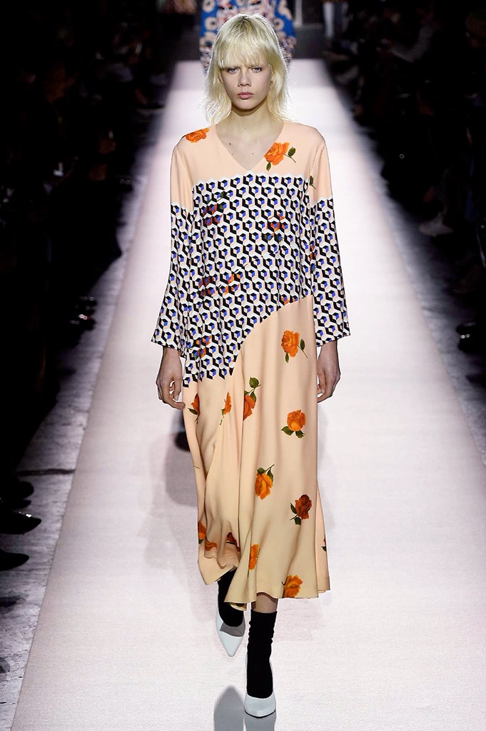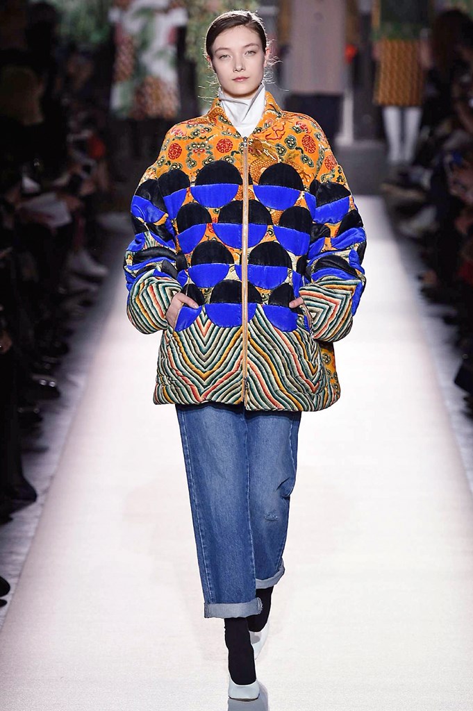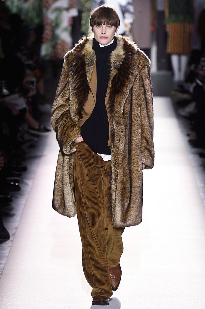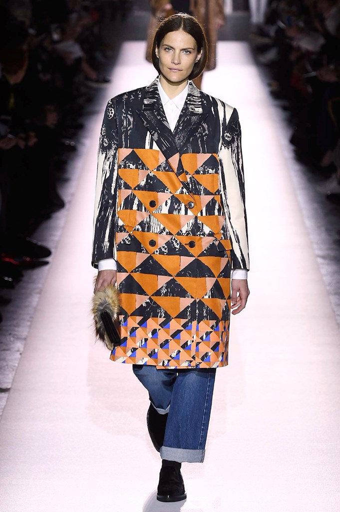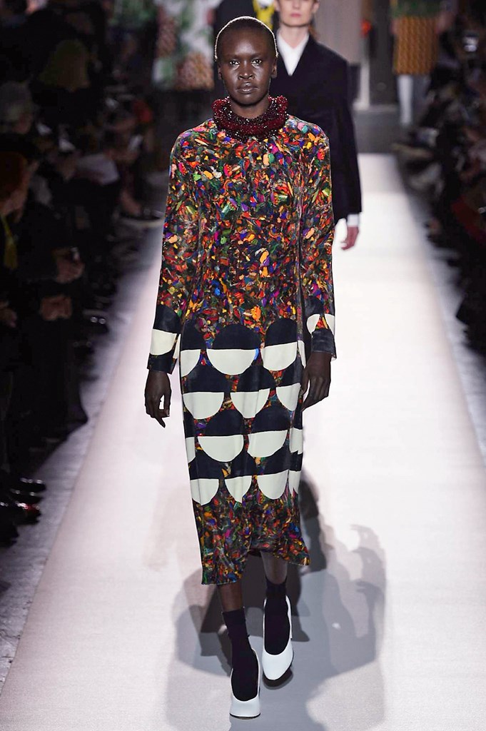 Ahora bien, la protagonista del desfile fue la que tenía que ser: la moda. Más en concreto, la moda de Dries van Noten. Por mucho que el diseñador se empeñara en esa austeridad que le es tan conocida, hay que reconocer que esta colección número 100 para el próximo otoño / invierno encapsula todas las constantes de la historia de van Noten: el minimalismo, la flexibilidad en el concepto de feminidad, la cerebralidad aparentemente fría, los estampados matemáticos, los coloridos calculados, las siluetas masculinas, los materiales técnicos… Todo estaba aquí para quien necesite refrescar la memoria y, sobre todo, para aquellos recién llegados que necesiten una lección de moda exprés. [Más información en la web de Dries Van Noten]