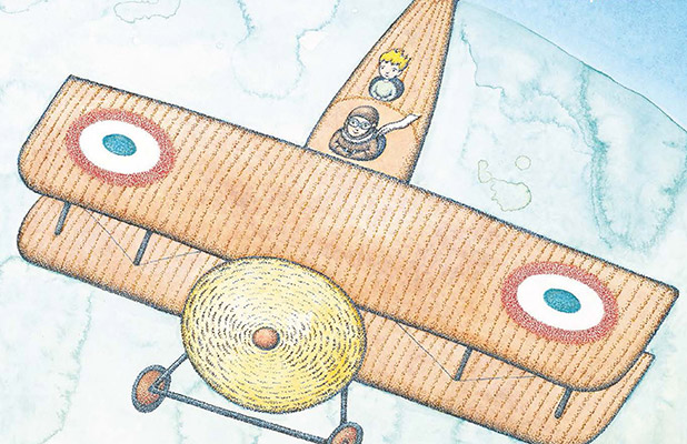 Al reflejar la época en que Saint-Exupéry estuvo asignado a la estación de correo en el Cabo Juby en el Sáhara español, donde “le encantaba la soledad y estar bajo millones de estrellas”, Sís emplea una paleta sobria, casi monocromática. Se alternan azul cielo y marrón tierra para colorear las hazañas menos conocidas: rescatar aviones varados y negociar con nómadas hostiles, lo que le procuró el sobrenombre de “Capitán de los Pájaros”.