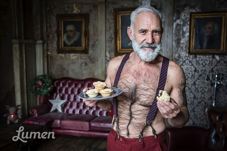 Lumen, por cierto, es una app británica de ligoteo para mayores de 50 años. Y, por lo tanto, ya debería haberte quedado claro que entiende un buen rato de cómo son los señores a día de hoy. Por eso mismo resulta tan maravilloso que hayan cogido al actor Paul Orchard y lo hayan convertido en un Santa Claus buenorrísimo que huye de los clichés habituales y que aparece no solo en traje de tres piezas (conservando los colores de Papá Noel, eso sí), sino que también se muestra vestido de leñador transportando un árbol de Navidad o bien ligerito de ropa interactuando con los habituales mince pie y los crackers navideños.