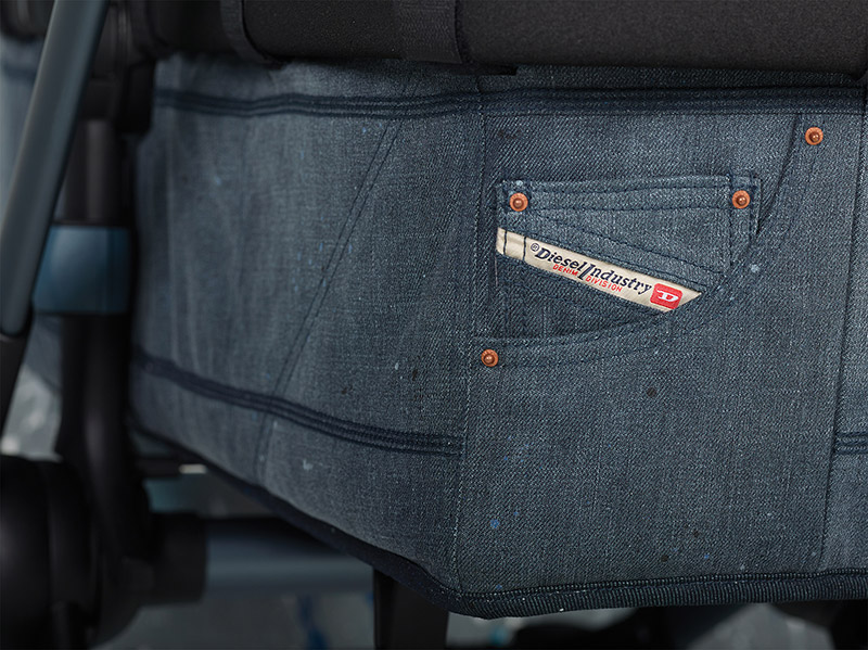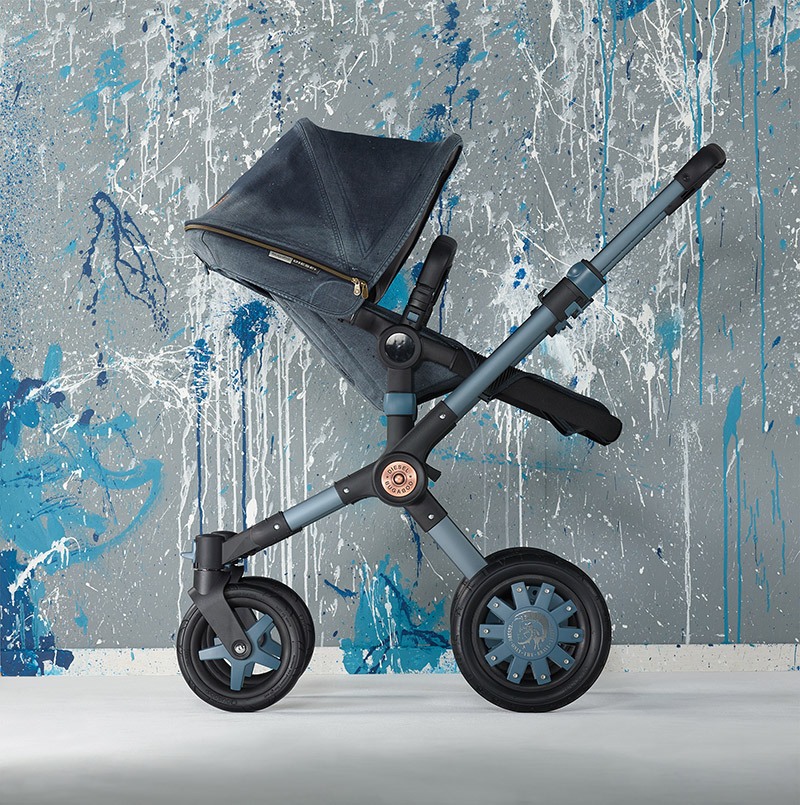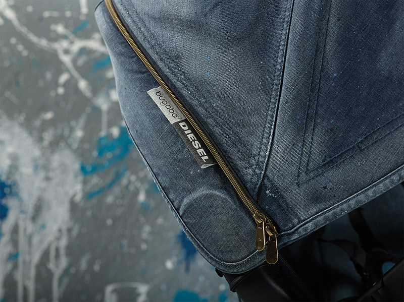 La nueva locura de estas dos firmas se centra en dos de los cochecitos estrellas de Bugaboo: el todoterreno Bugaboo Buffalo (al que se le ha aplicado un cambio de imagen total) y el convertible Bugaboo Donkey (que se lanza con un Pack de Fundas Adicionales). La estrella indiscutible es, sin lugar a dudas, el Bugaboo Buffalo con su chasis anodizado en color azul y con la capota, el capazo y la silla en tejido denim lavado. También incluye otros detalles igualmente loquis como el embellecedor del eje central de cochecito inspirado en los remaches de los tejanos Diesel o las llantas de las ruedas teñidas de azul para conseguir el total look denim.
