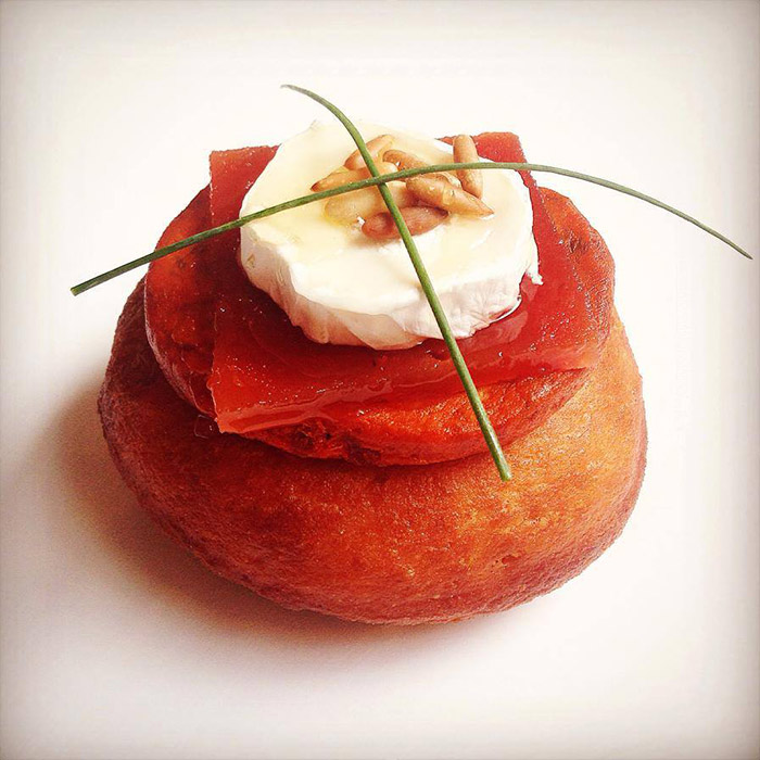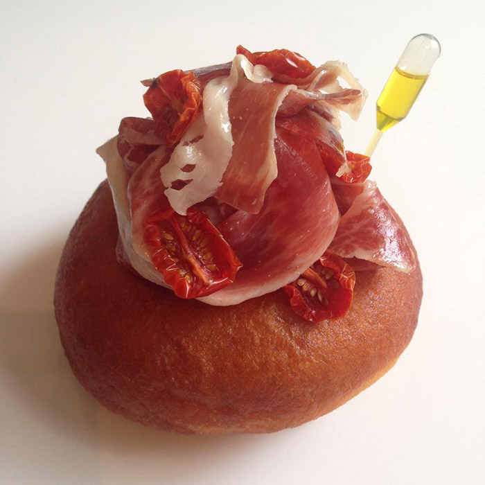 Ahora que lo pienso, voy a retractarme: lo primero que sorprende al entrar en La Donutería no es el propio local, sino el chef que lo dirige. Si por casualidad Richard Bies está a la vista (ya que, evidentemente, no es él quien suele atender a los clientes, aunque el hecho de que la cocina esté completamente descubierta hace que normalmente se le vea mientras cocina), lo primero que vas a hacer es sentir una sana envidia hacia su barba si eres un hombre o te vas a derretir un poco si eres una adoradora de las barbas (¿hay alguna que no lo sea a estas alturas?). Pero no permitas que los árboles te impidan ver el bosque o que, en este caso, la barba te impida ver al chef: el norteamericano Bies fue jefe de pastelería en Escrivà y, desde hace unos meses, está empeñado en demostrar que en España puede que comamos muy bien, pero que de pastelería sofisticada no tenemos ni repajolera idea.
