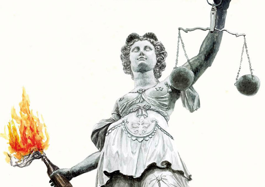 El fuego como componente purificador, alimento de espíritus rebeldes y combustible de revoluciones tanto pacíficas como estruendosas. Este carácter metafórico de dicho elemento de la naturaleza aparecía muy vivo en la portada del anterior EP de Grupo de Expertos Solynieve, “Colinas Bermejas” (El Segell del Primavera, 2014), y vuelve a mostrarse con claridad en la de su nueva referencia en corto, “Lucro Cesante” (El Segell del Primavera, 2015), como parte de un amenazante cóctel molotov sujeto por una recreación de Temis, diosa de la justicia, que se quita la venda para abrir bien los ojos y comenzar a poner orden y concierto en nuestro jodido mundo. De acuerdo, tal alegoría puede resultar manida y tópica, pero en este caso se revela absolutamente necesaria por su potente simbolismo, que se relaciona sin ambages con las sentencias (y, quién sabe, presagios) que trufan de irritación y mala baba este EP.
