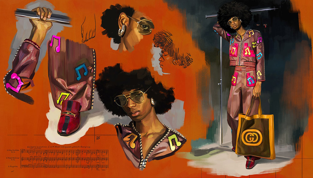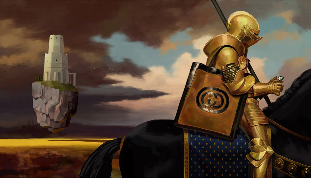 Así las cosas, si Michele quería llevar la «fantasía» un nivel más allá, solo quedaba una salida: renegar de la realidad y recurrir a un pintor para que formalizara sus mundos fantásticos sobre el lienzo. El elegido ha sido precisamente un español: el pintor Ignasi Monreal, que para la ocasión se ha marcado todo un conjunto de retablos pictóricos hiperrealistas poblados de bellos modelos vestidos con ropa de Gucci, claro… Pero, ojo, porque son seres que pueden no ser humanos, sino caballeros andantes y princesas, meninas y sirenas o incluso híbridos con cuerpo de león y cabeza de mujer. Ahí queda eso.