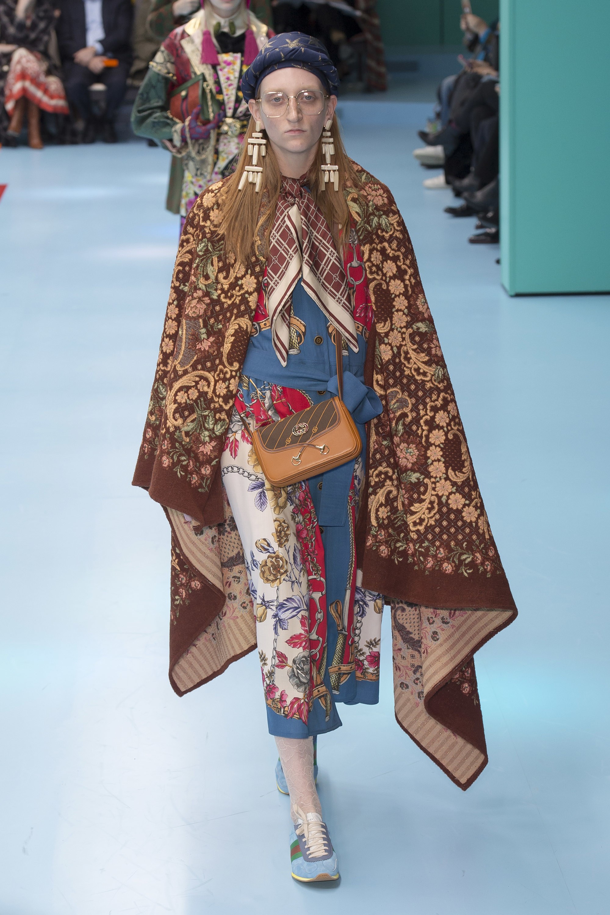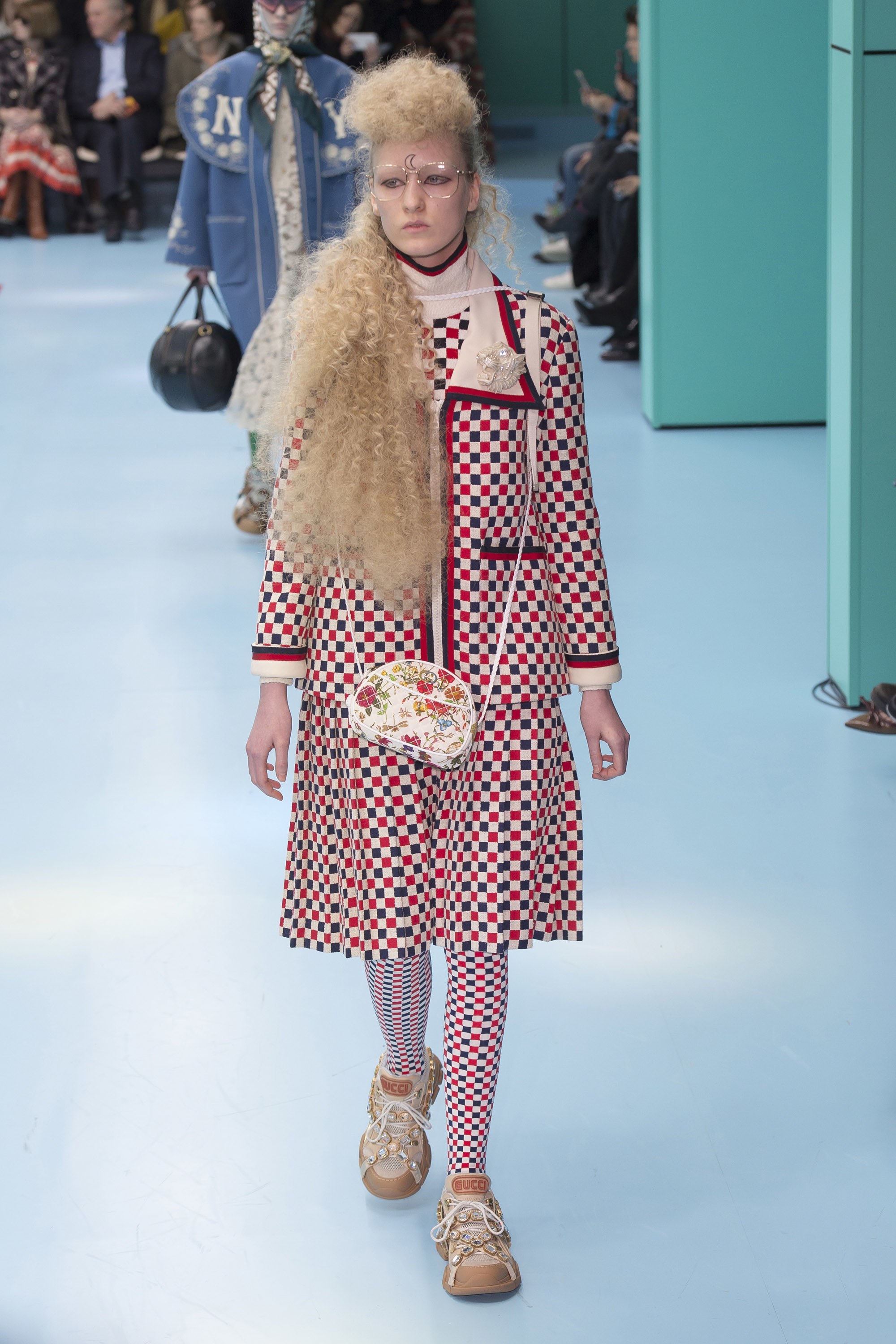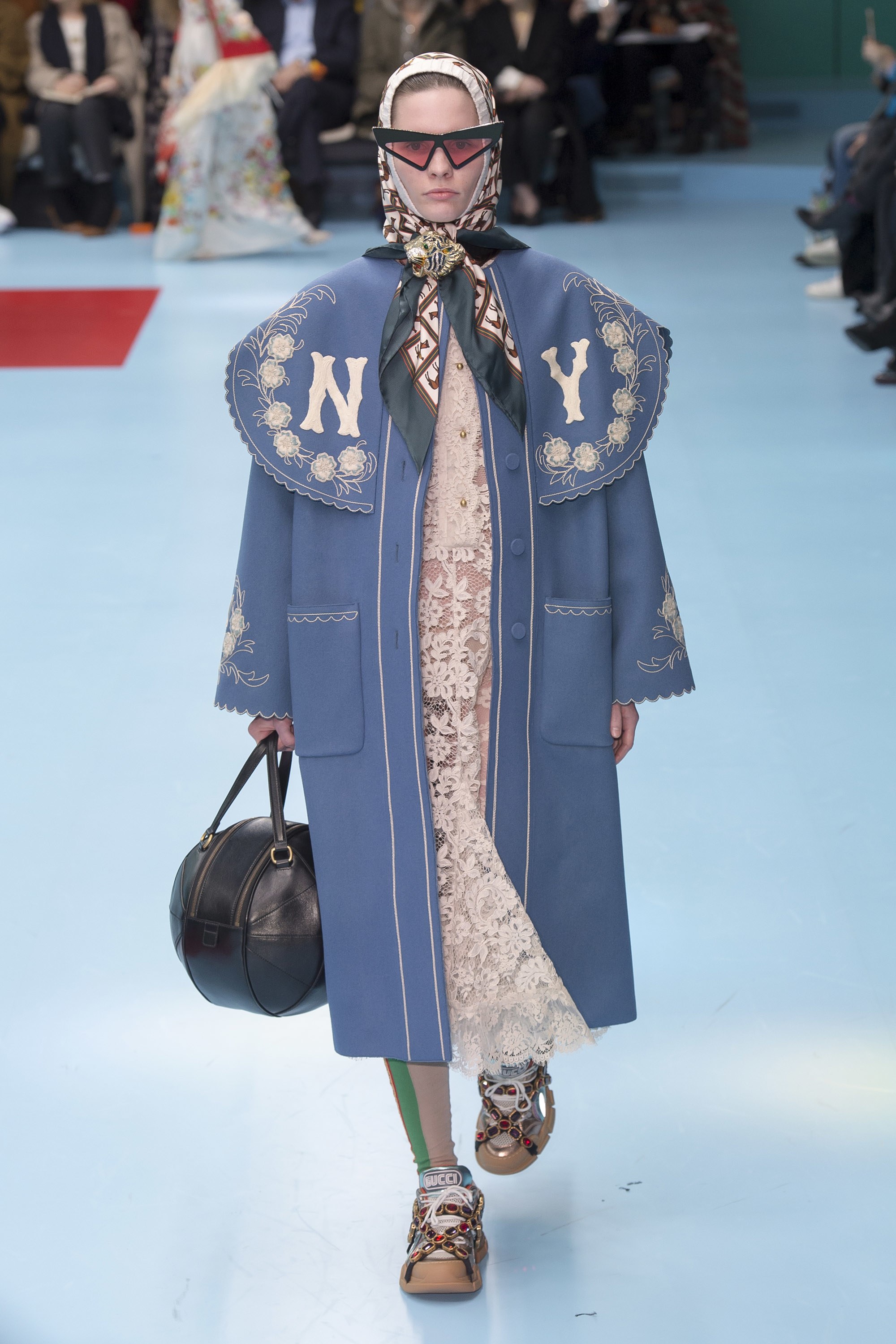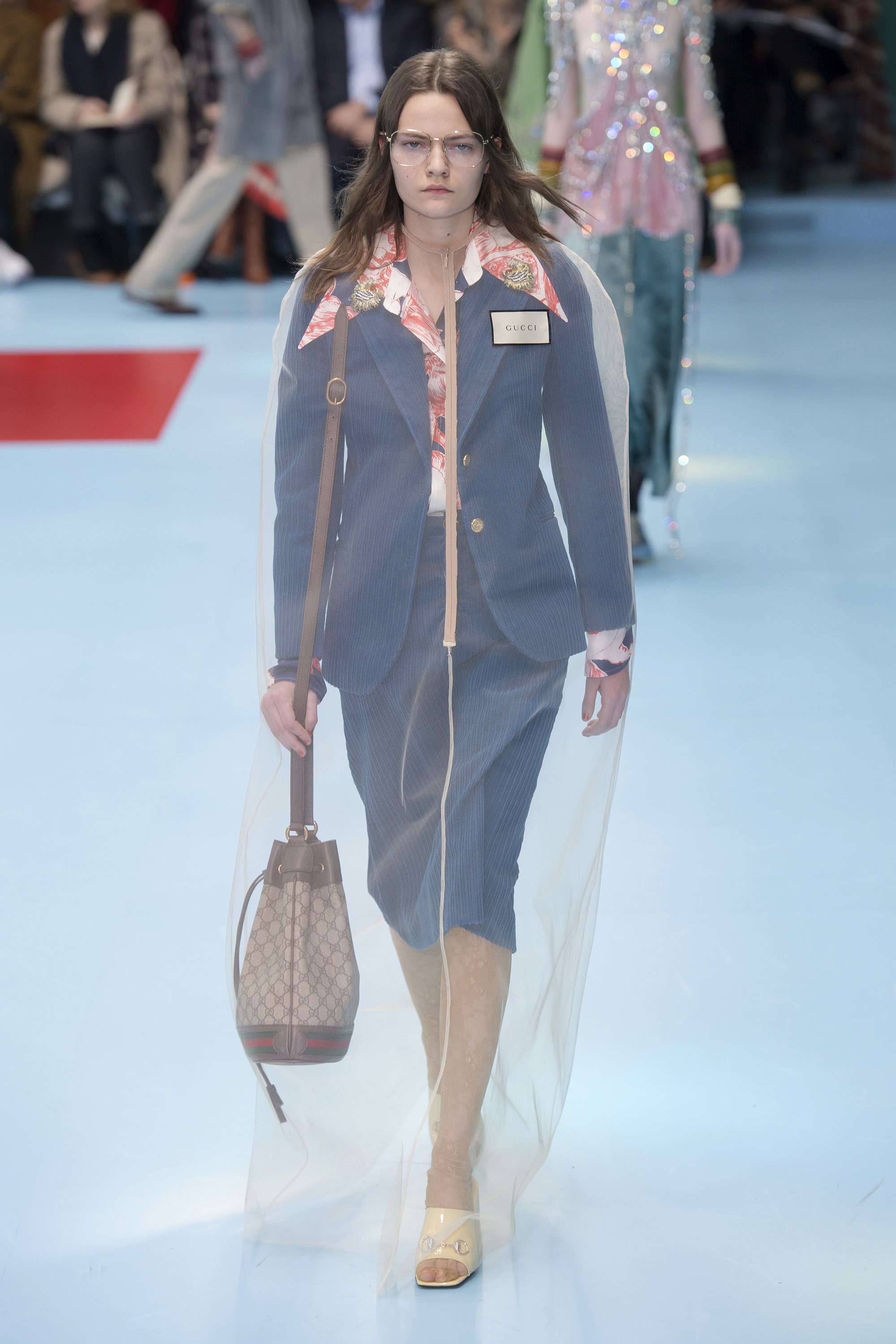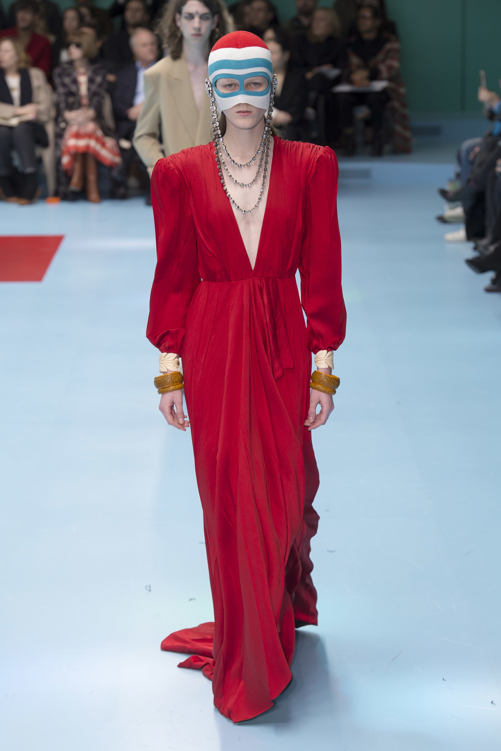 Y luego están, claro, los efectos especiales, que es de lo que está hablado todo el mundo: varios modelos desfilaron con réplicas de sus propias cabezas bajo el brazo, otros llevaban animales exóticos y una modelo incluso paseó a una cría de dragón… Todo ello por cortesía de la empresa romana Makinarium. Así que la gente se ha empezado a preguntar: ¿era esto necesario o es otra fardada más de Michele al frente de Gucci? Pues aquí sí que no admitimos duda alguna: esta decisión de borrar los límites de la realidad y la fantasía es una maravilla que viene a reforzar el imaginario de las últimas temporadas de Gucci.