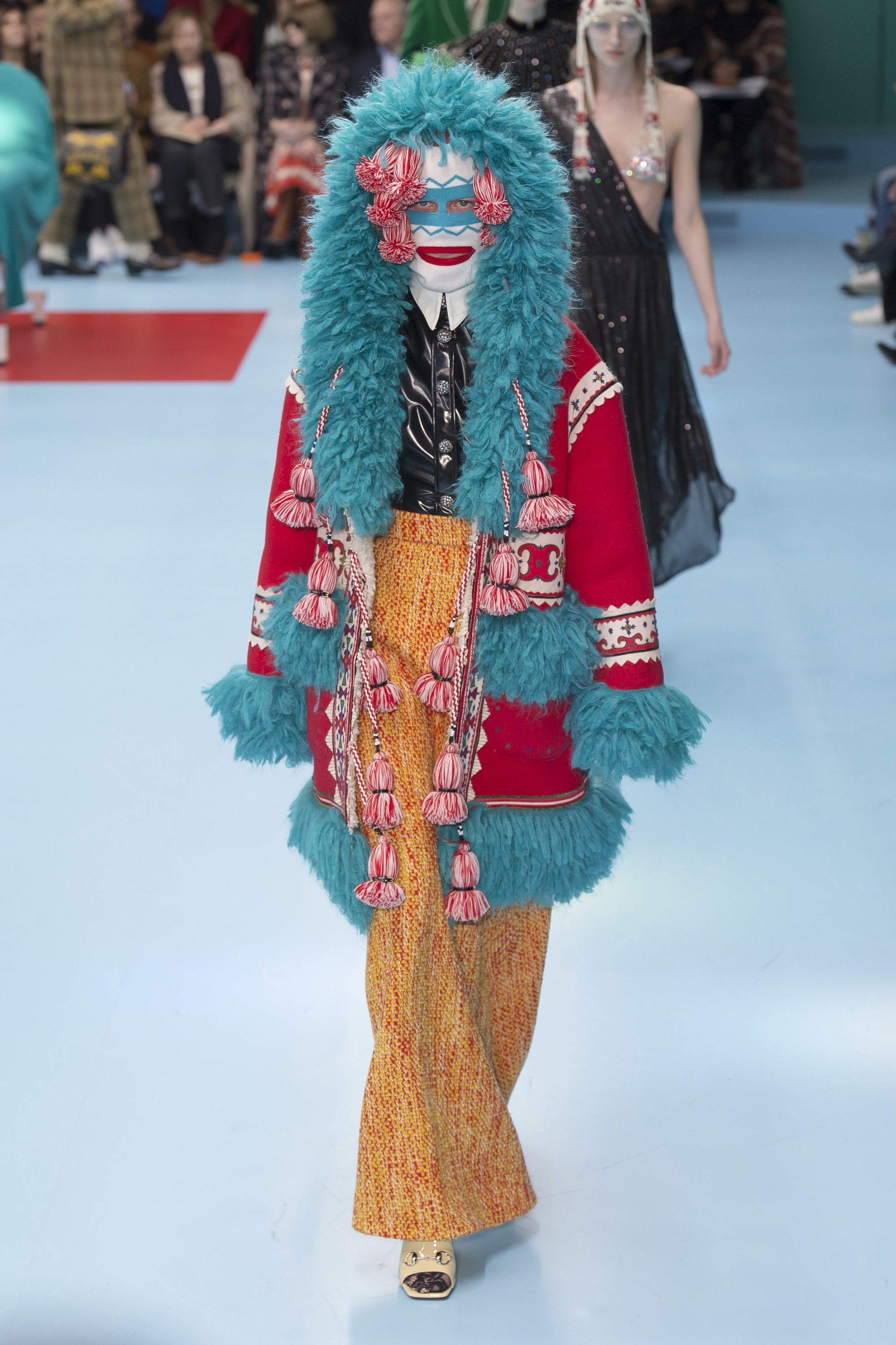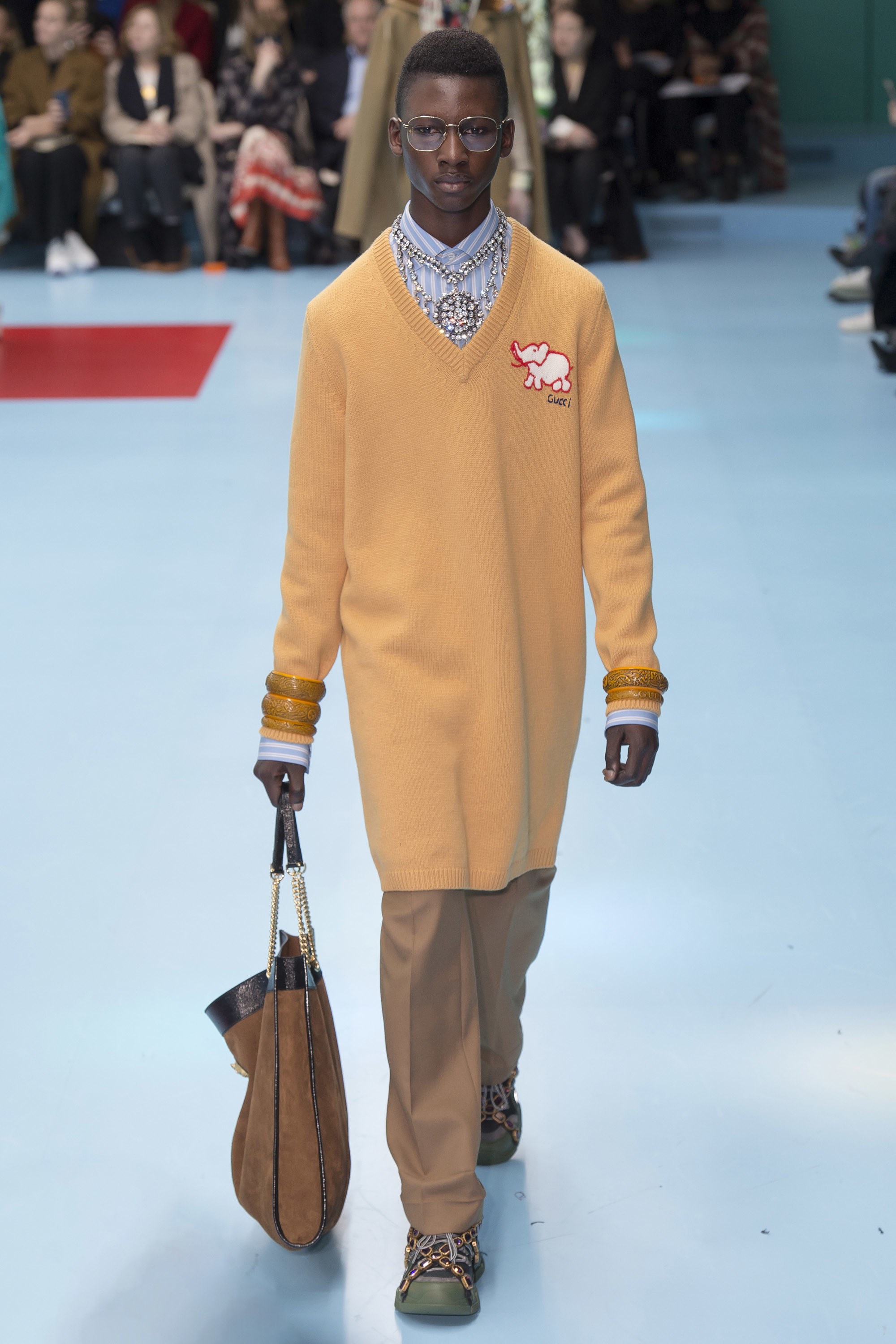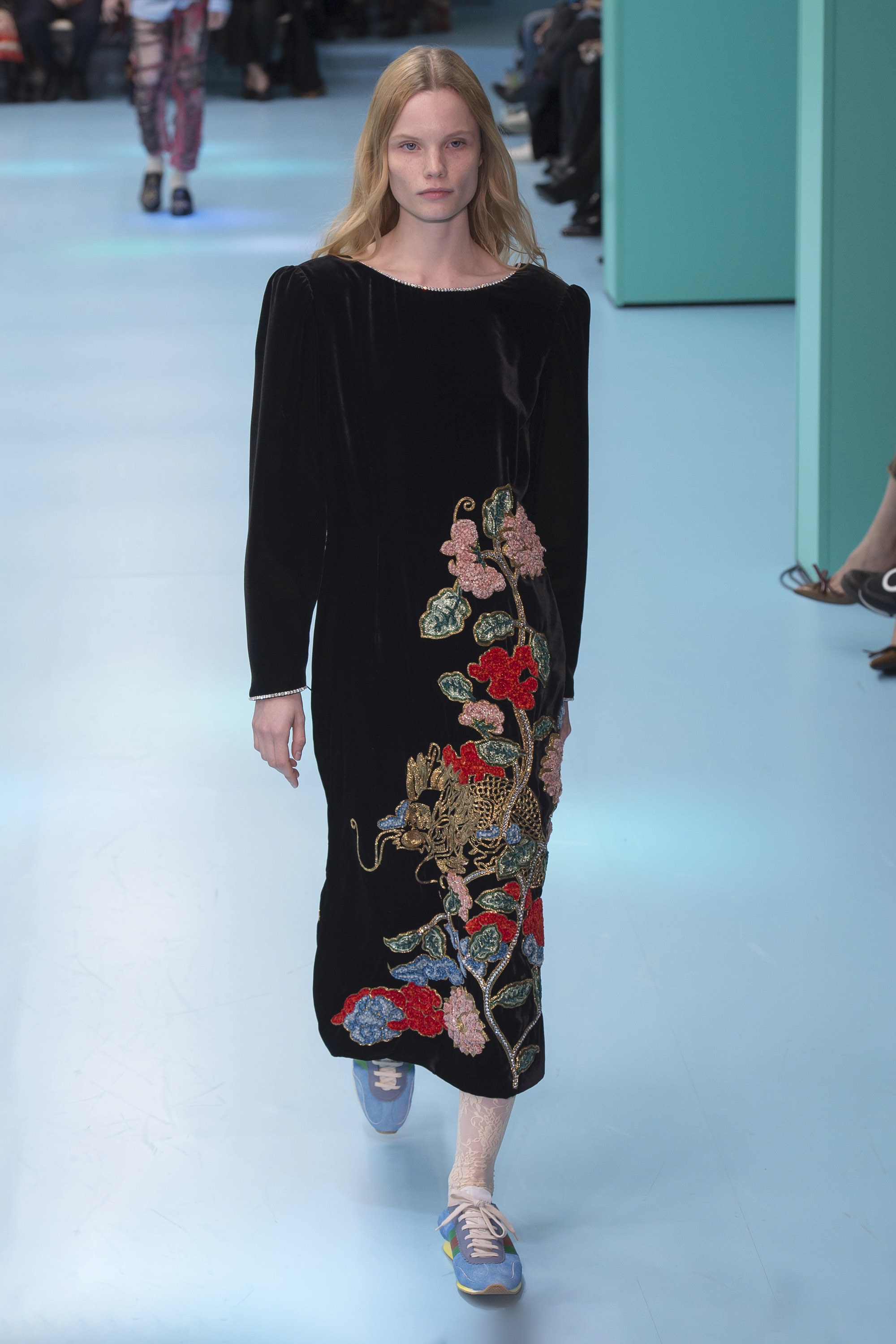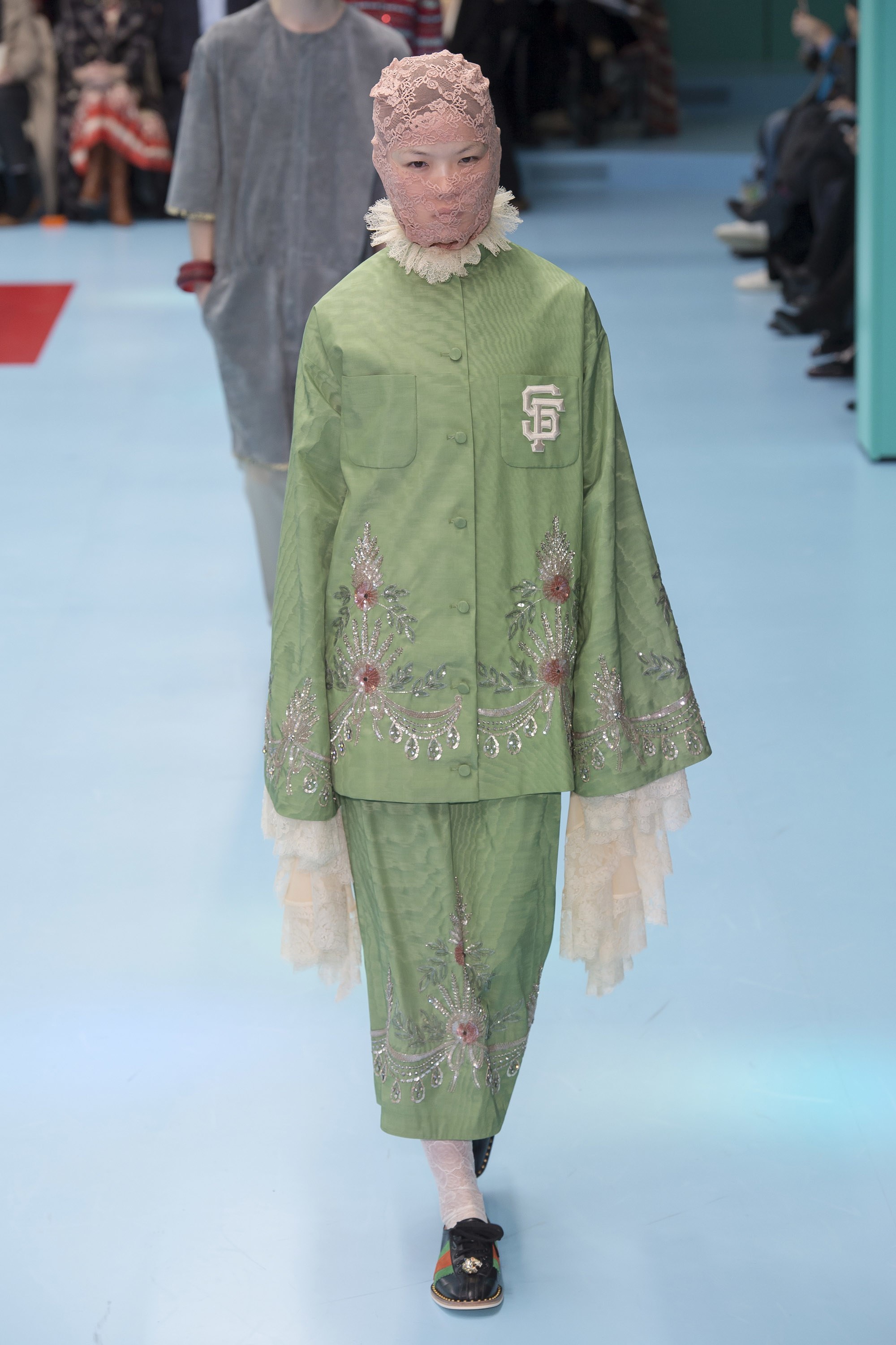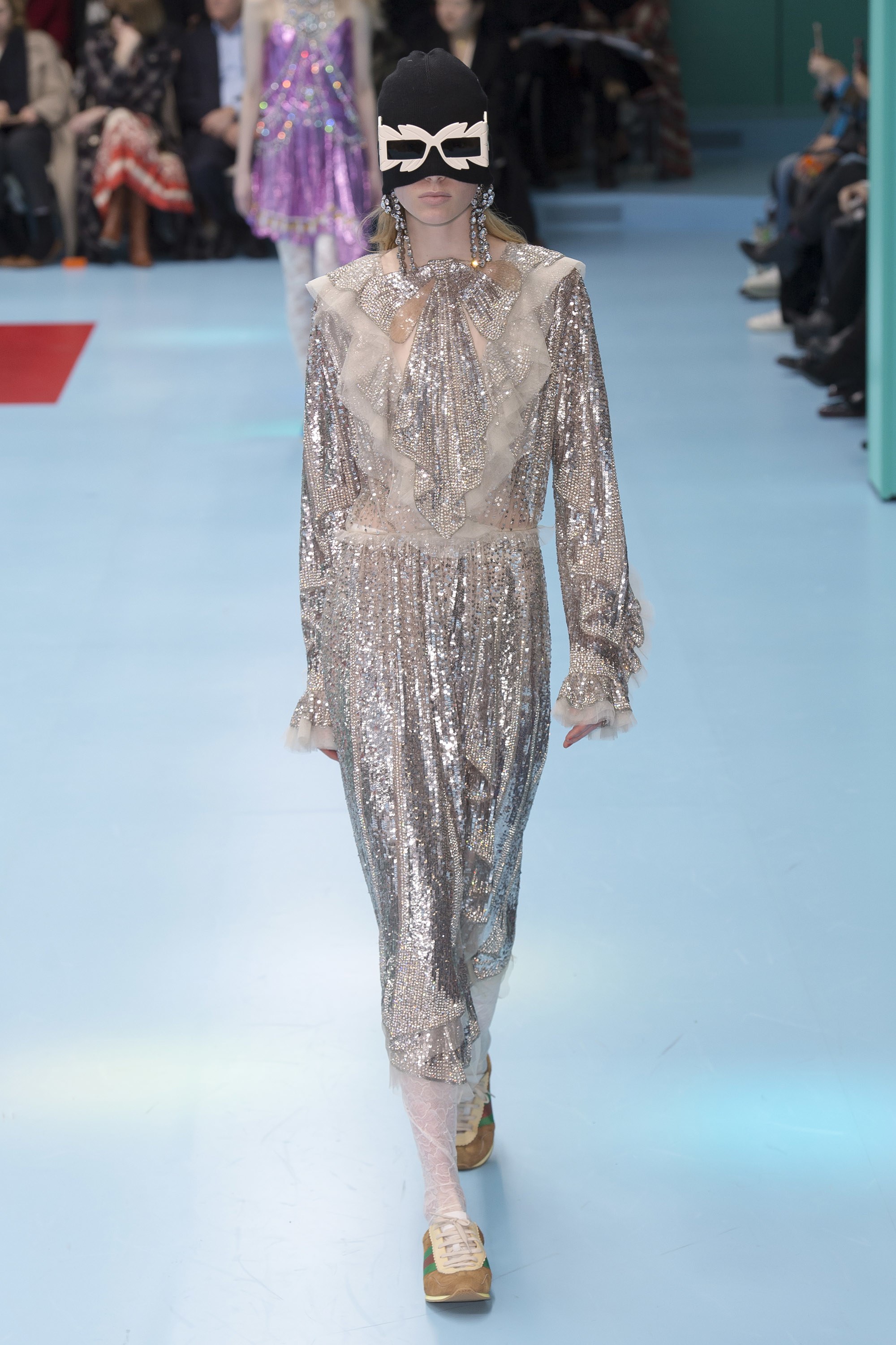 Y luego están, claro, los efectos especiales, que es de lo que está hablado todo el mundo: varios modelos desfilaron con réplicas de sus propias cabezas bajo el brazo, otros llevaban animales exóticos y una modelo incluso paseó a una cría de dragón… Todo ello por cortesía de la empresa romana Makinarium. Así que la gente se ha empezado a preguntar: ¿era esto necesario o es otra fardada más de Michele al frente de Gucci? Pues aquí sí que no admitimos duda alguna: esta decisión de borrar los límites de la realidad y la fantasía es una maravilla que viene a reforzar el imaginario de las últimas temporadas de Gucci.