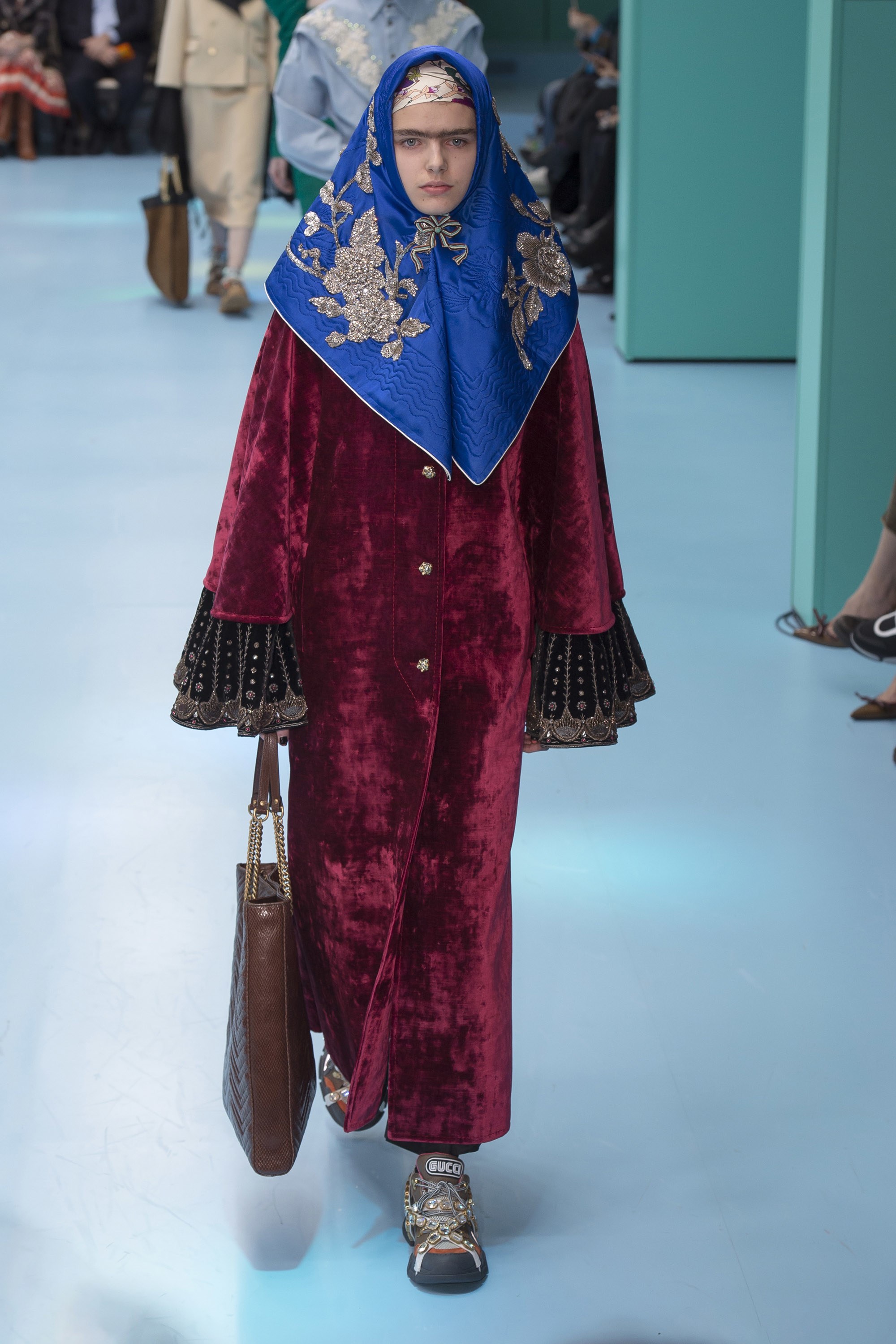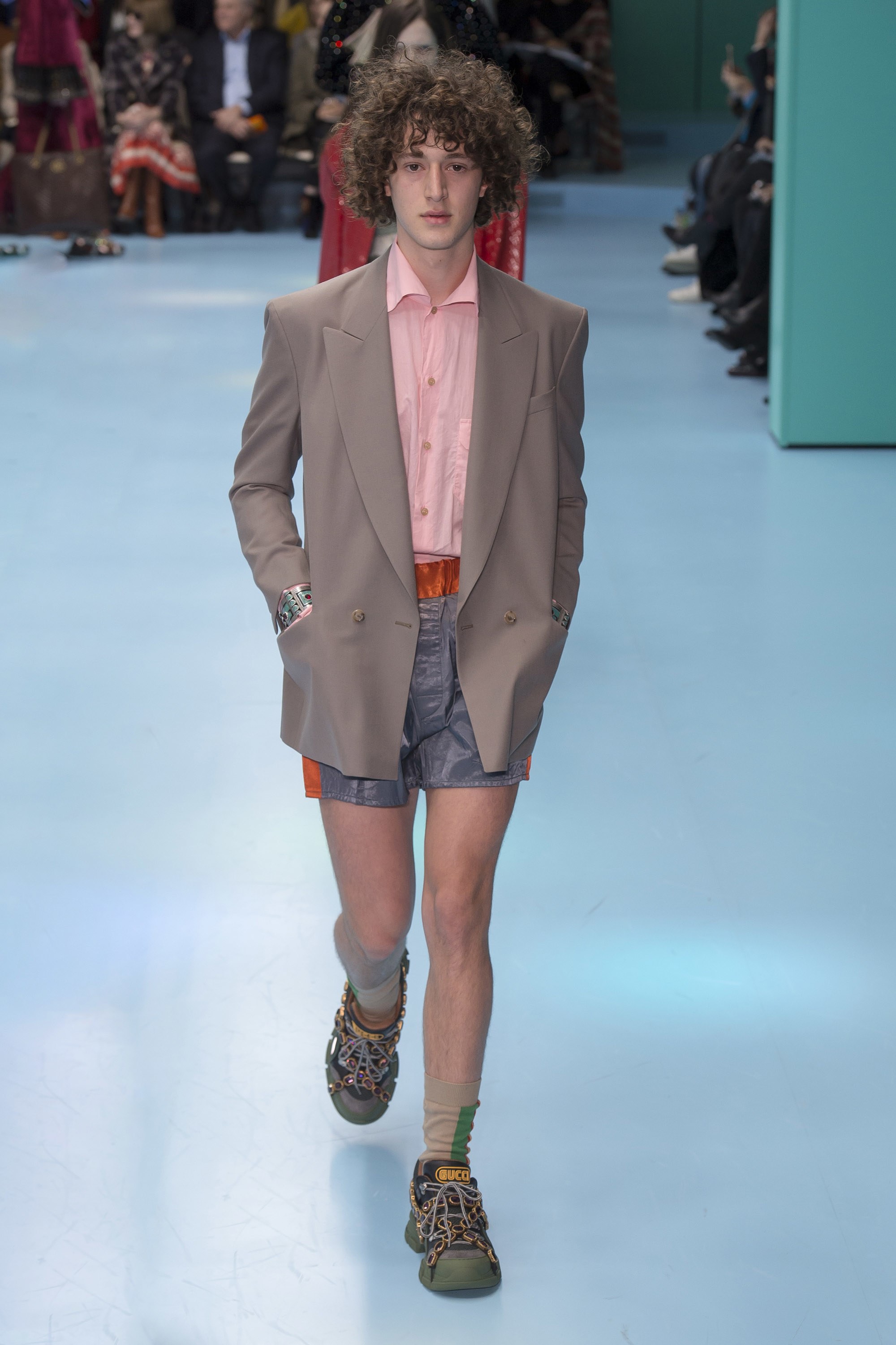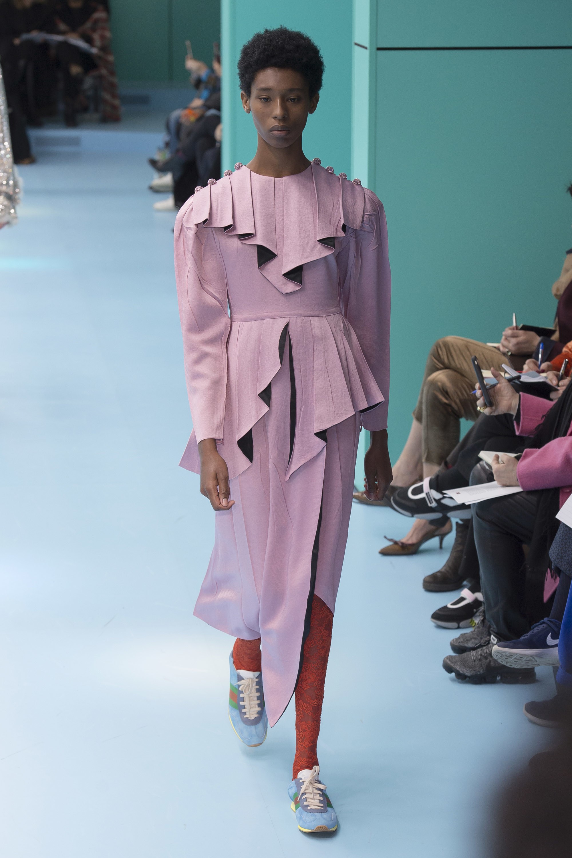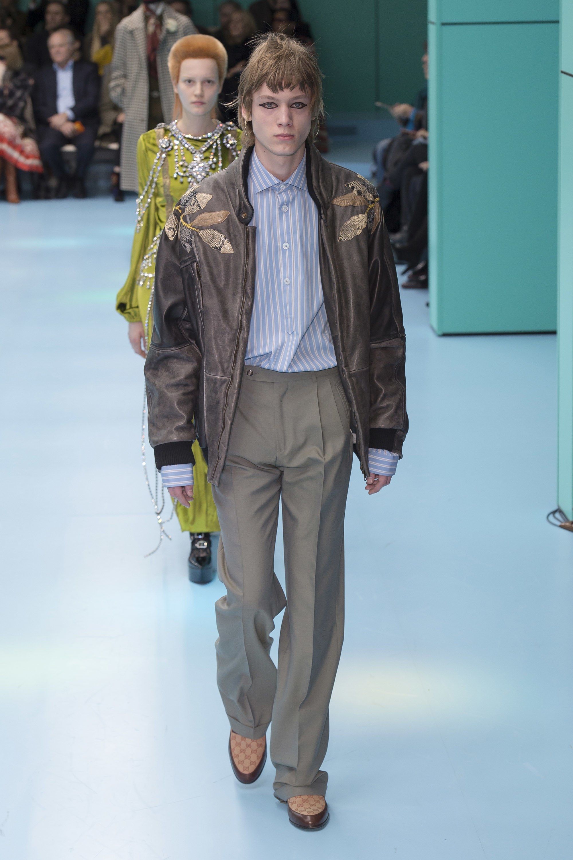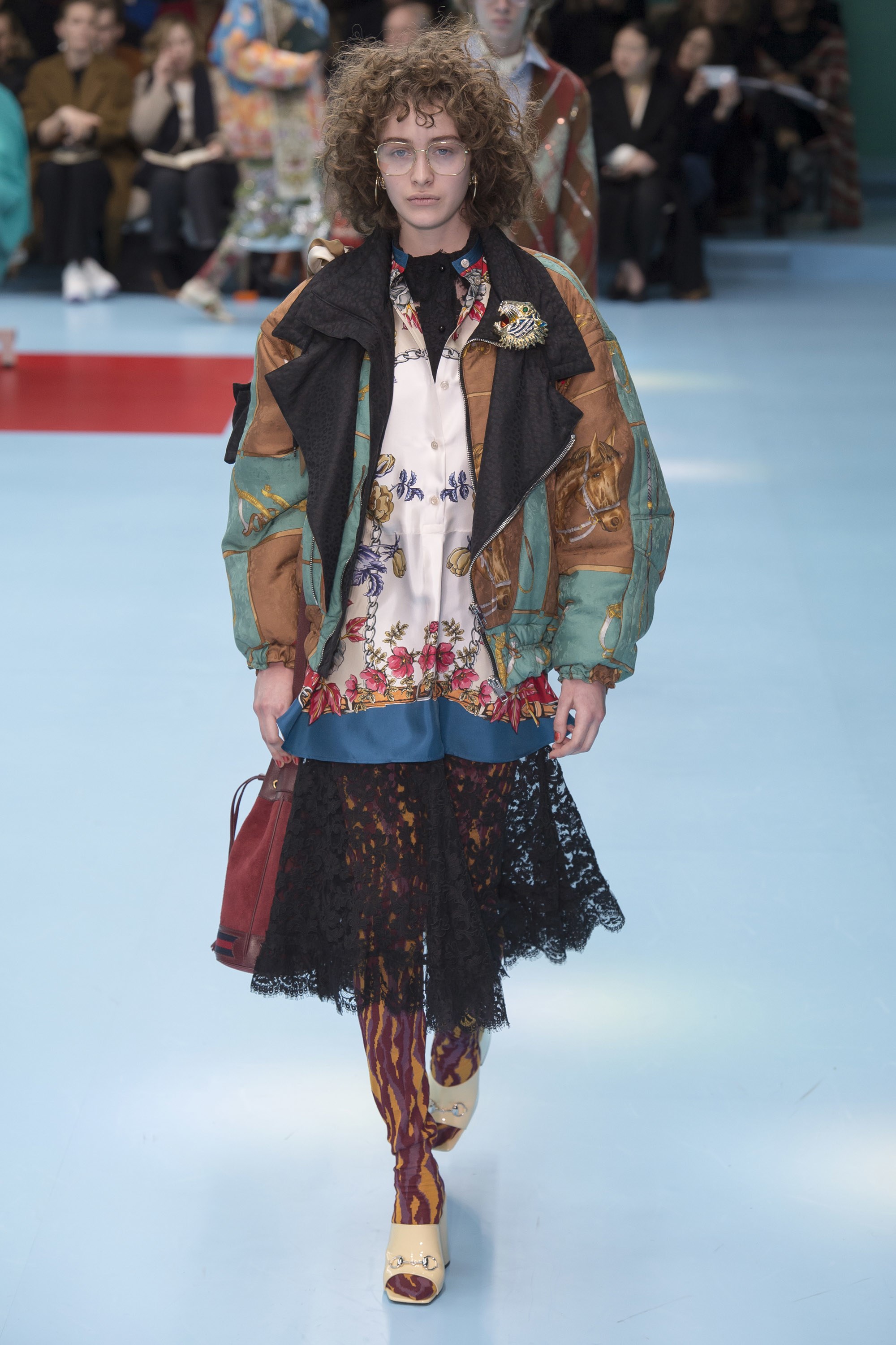Y luego están, claro, los efectos especiales, que es de lo que está hablado todo el mundo: varios modelos desfilaron con réplicas de sus propias cabezas bajo el brazo, otros llevaban animales exóticos y una modelo incluso paseó a una cría de dragón… Todo ello por cortesía de la empresa romana Makinarium. Así que la gente se ha empezado a preguntar: ¿era esto necesario o es otra fardada más de Michele al frente de Gucci? Pues aquí sí que no admitimos duda alguna: esta decisión de borrar los límites de la realidad y la fantasía es una maravilla que viene a reforzar el imaginario de las últimas temporadas de Gucci.