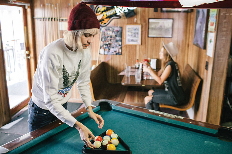 Y ese estilo de vida es el que puede verse perfectamente en la colección de Brixton para este otoño / invierno… O, mejor dicho, ese estilo de vida puede verse perfectamente en las fotos de campaña de esta colección (que, por cierto, también incluyen ropa de la firma californiana): las instantáneas de la línea femenina están protagonizadas por dos chicas que van a convertirse en iconos aspiracionales de cualquiera con un mínimo de estilo, mientras que la línea masculina tiene como protagonistas a todo un conjunto de hombretones lejos de los cánones de modelos de pasarela pero cerca de ti y de mi y de todo lo que nos gusta hacer, ya sea skate, surf, salir con tu bici o quedar con tus colegas para jugar al billar y tomar unas birras.