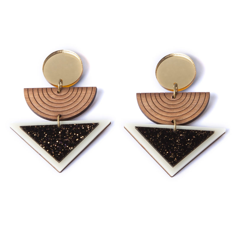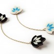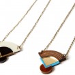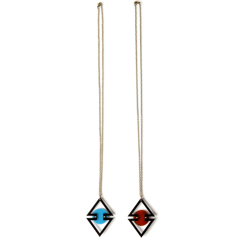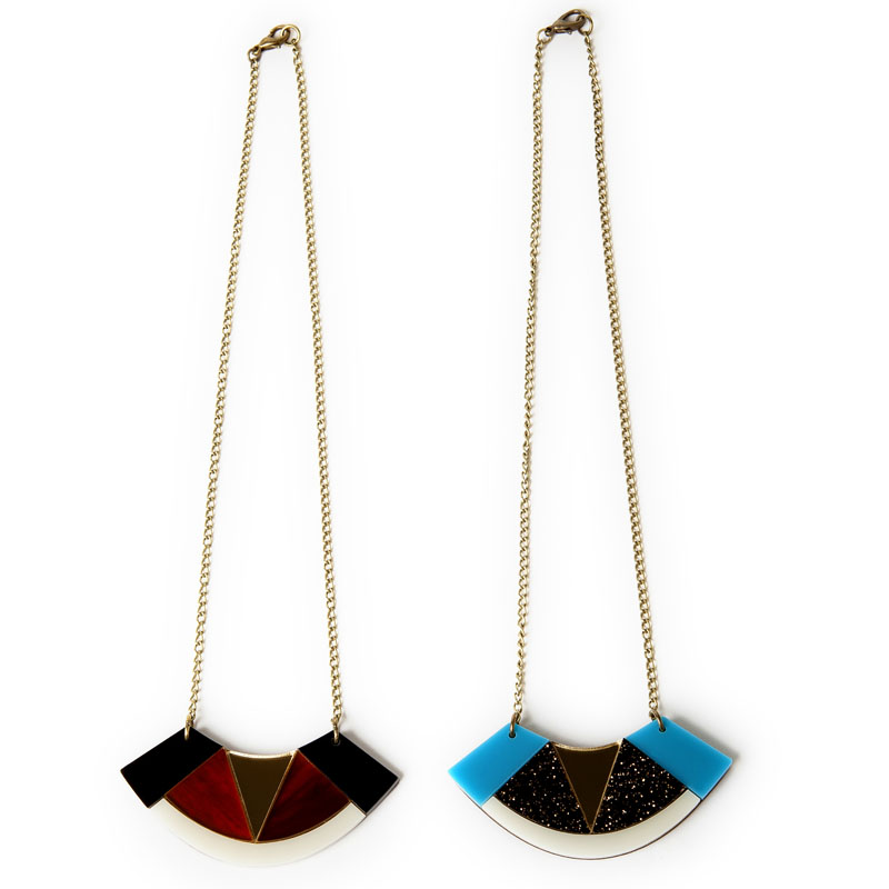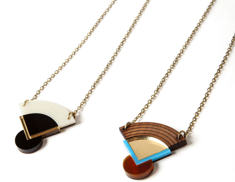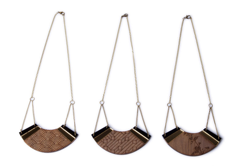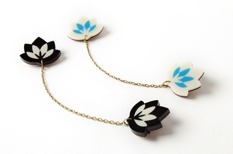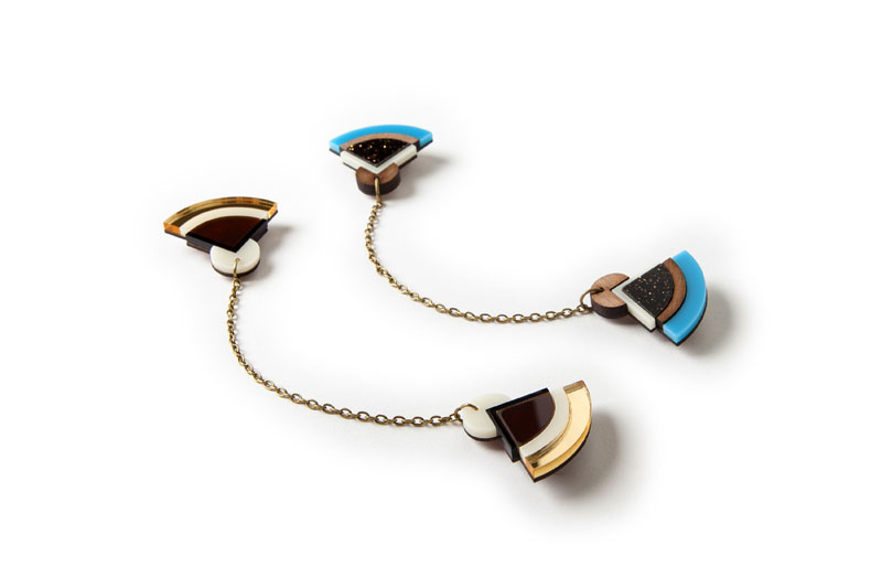 Jennifer se graduó en Diseño Textil, donde aprendió todo el proceso del «lasercutting», y pronto decidió que quería aplicar esos conocimientos al diseño de joyas. Así, las piezas de Nylon Sky parten de una técnica tecnológica, pero el acabado siempre es a mano y combinan el polimetilmetacrilato con la madera y la piel. Con ello consigue un aspecto de perfección notable pero conserva el espíritu del diseño manual y un cierto aire orgánico muy cálido que le dan un toque único. Jennifer incluye los diseños maxi de Holly Fulton entre sus influencias, con la que comparte la pasión por el Art Déco y su formas imbrincandas, además de la pasión por el más es más y el no tener miedo a hacer las cosas a lo grande. Y lo demuestra no sólo en el diseño de sus piezas, sino también en su apuesta por el color, que en su «Turning Japanese» se basa en la combinación de negros con turquesas, blancos con dorados y todo acabado con maderas nobles.