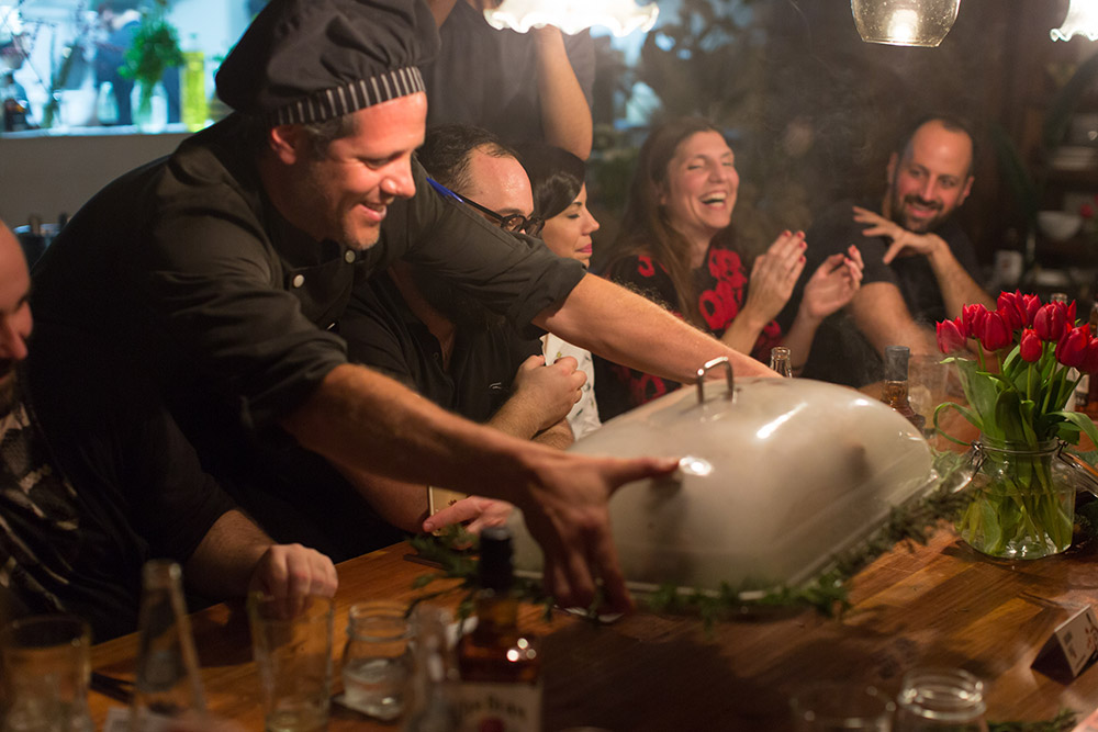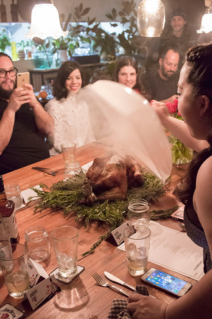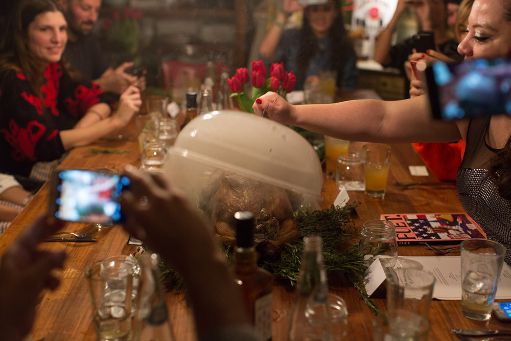 Pero todo el mundo debería aspirar a pegarse un banquete como el que ayer nos metimos nosotros entre pecho y espalda cortesía de Jim Beam y de la siempre sorprendente cocina del Picnic. El protagonista absoluta sólo podía ser uno: un pavo de siete kilos que fue servido dentro de una campana de cristal que, al levantarse, liberó el humo con el que había sido aromatizado para darle el toque final. Y, claro, todo pavo de Acción de Gracias hay que servirlo con su stuffing (tremendo) y con su acompañamiento de puré y verduritas (si no sabéis qué carajo son las zanahorias rainbow, os van a cambiar la vida). Teniendo esto sobre la mesa, ¿con qué cara miro lo que me sirva mi madre en Navidad? (Por favor, que nadie le diga a mi madre que he dicho esto en público.)