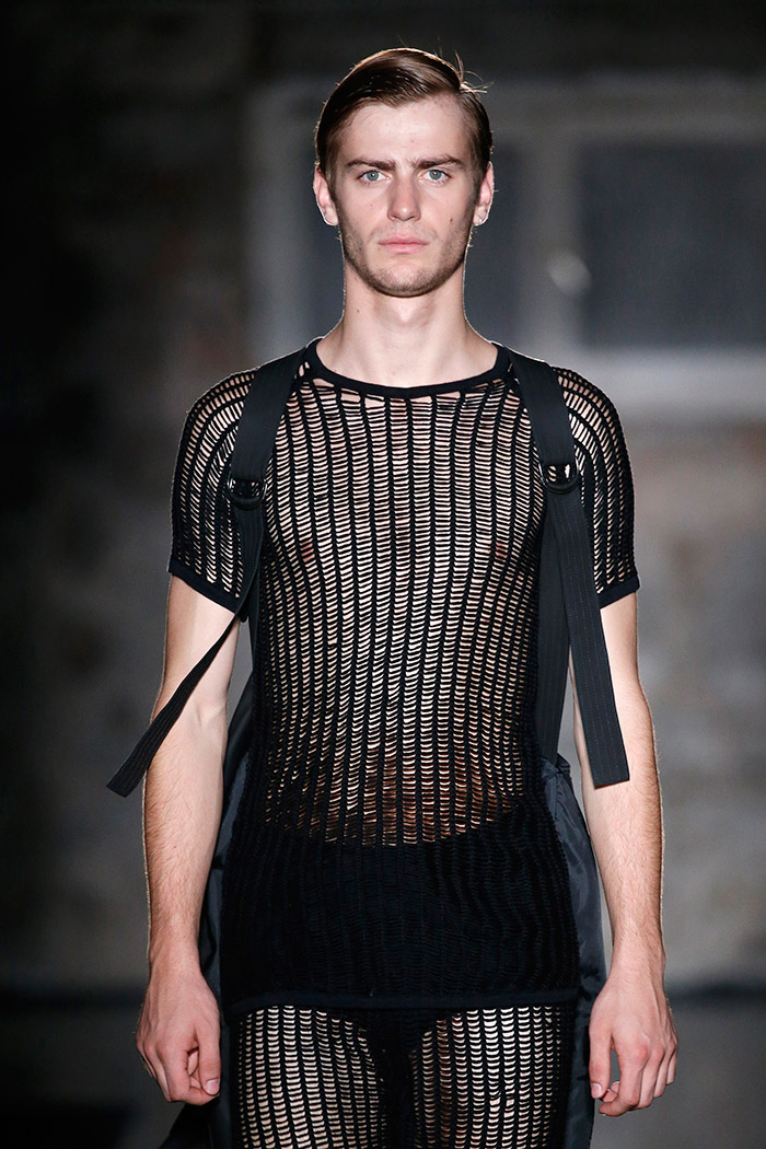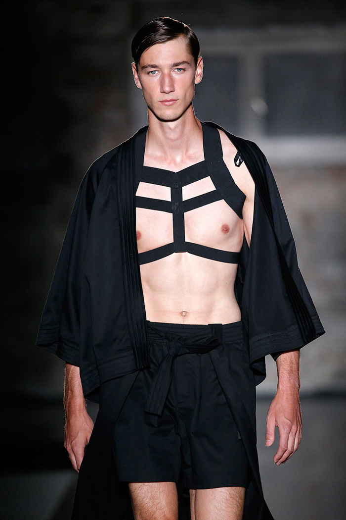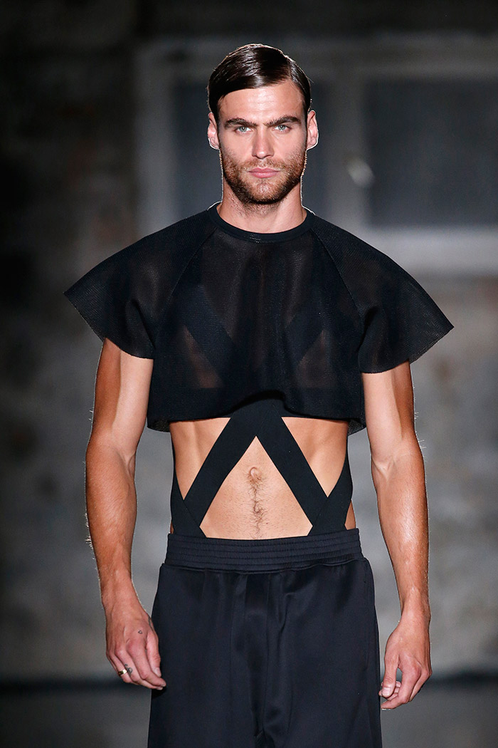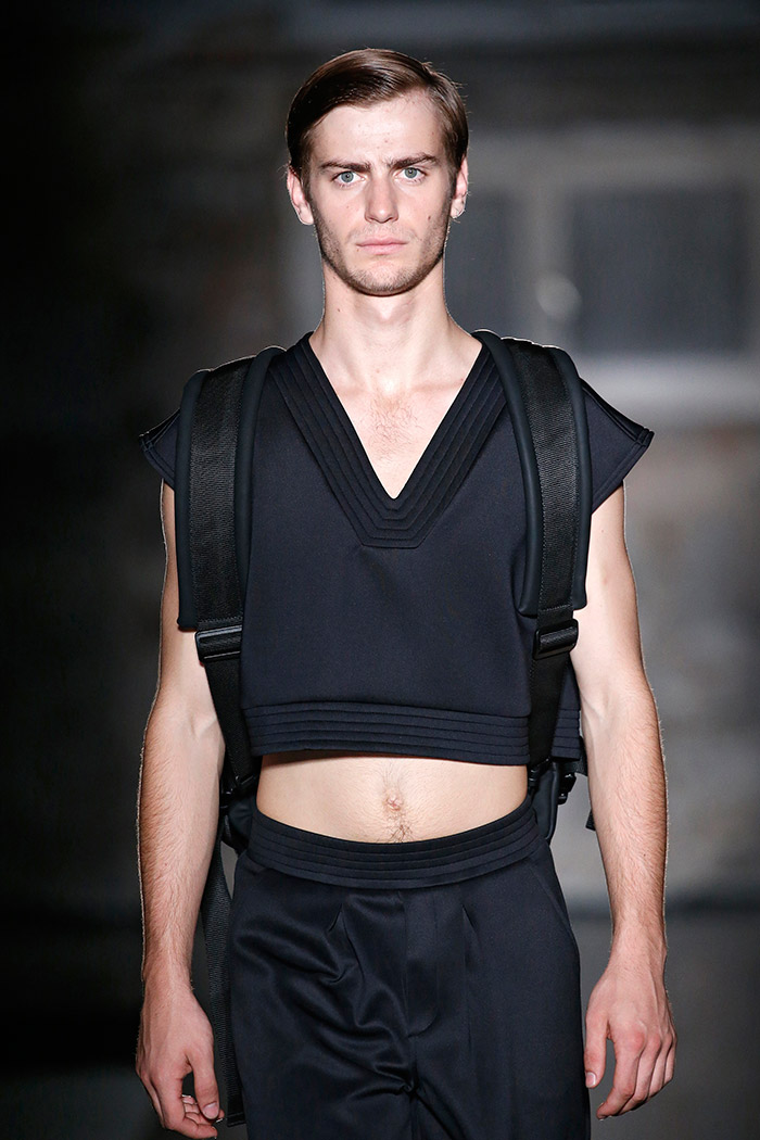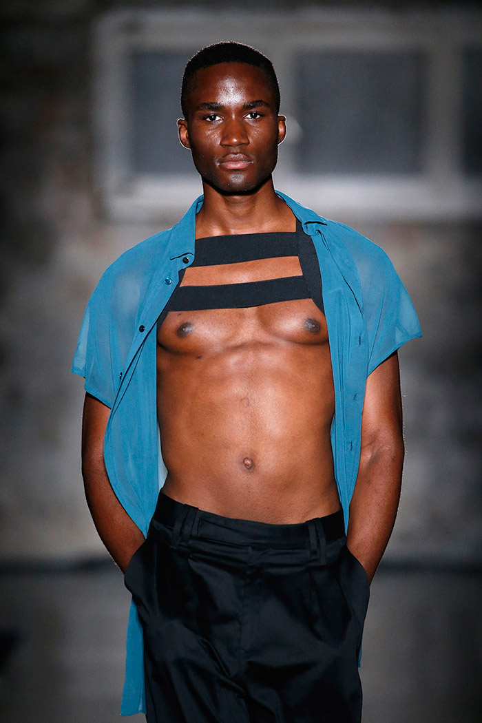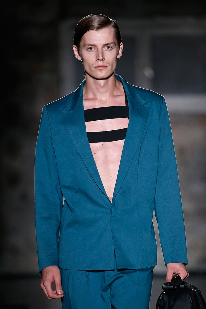 Al fin y al cabo, Javier Girón (que, por cierto, ha trabajado para otras firmas como Jeremy Scott, S. Oliver o Agi & Sam) declina el futuro con una visión de la moda masculina que desafía la tiranía de los géneros por la vía tanto de los tejidos (¡bien de transparencias y satenes!) como de las siluetas, con una gozosa profusión de escotes, cortes que dejan una gran cantidad de carne a la vista ¡e incluso crops! (Sí, ya sabemos que esta es la pieza más odiada de la moda masculina actual, pero hay que reconocer que JNORIG la aplica de forma mucho más que fetén.)