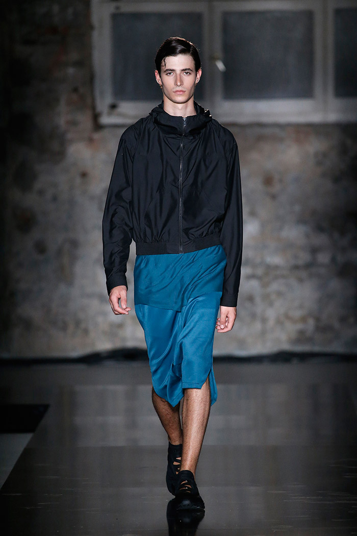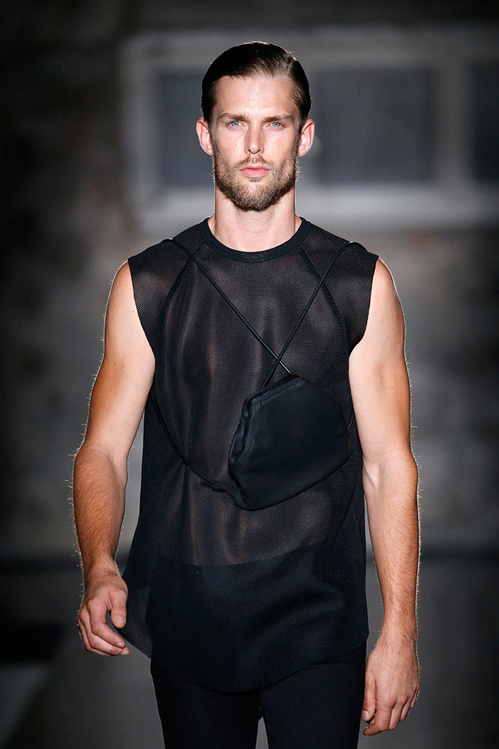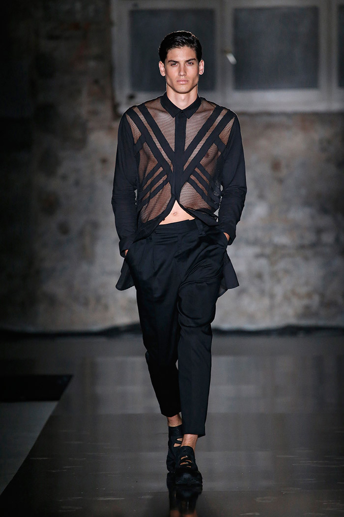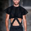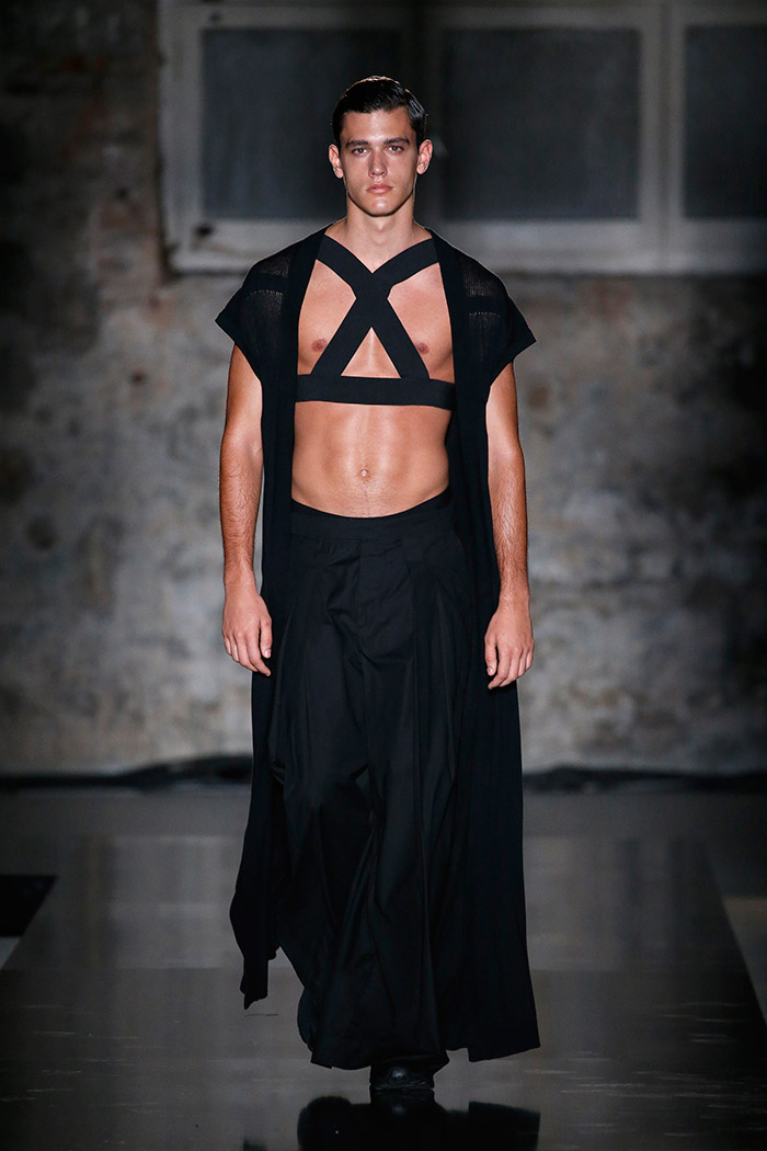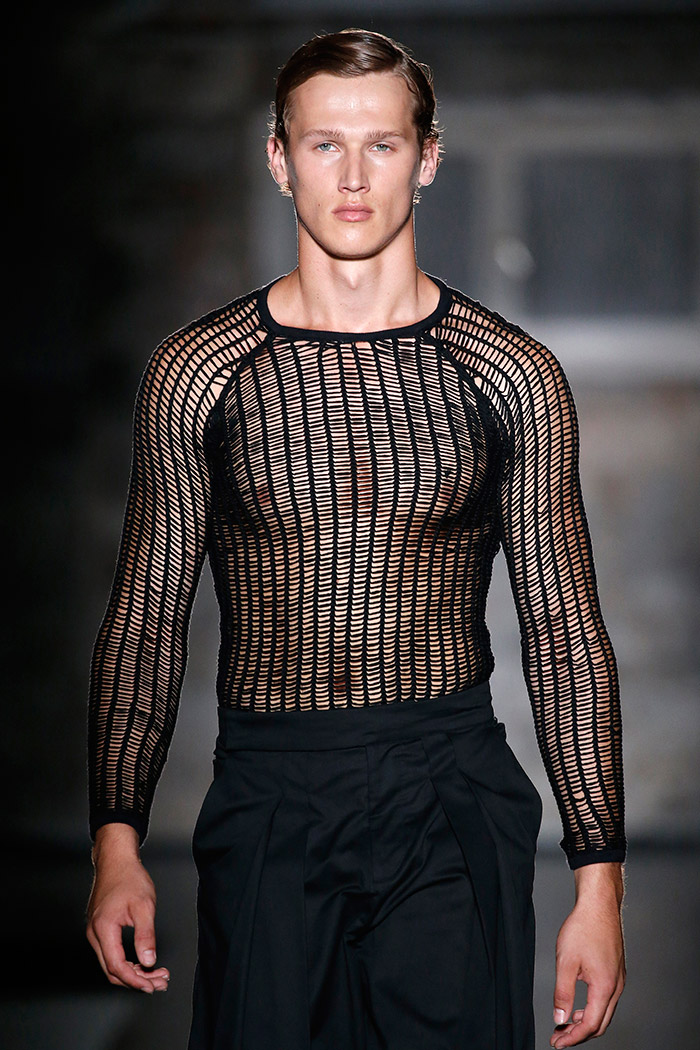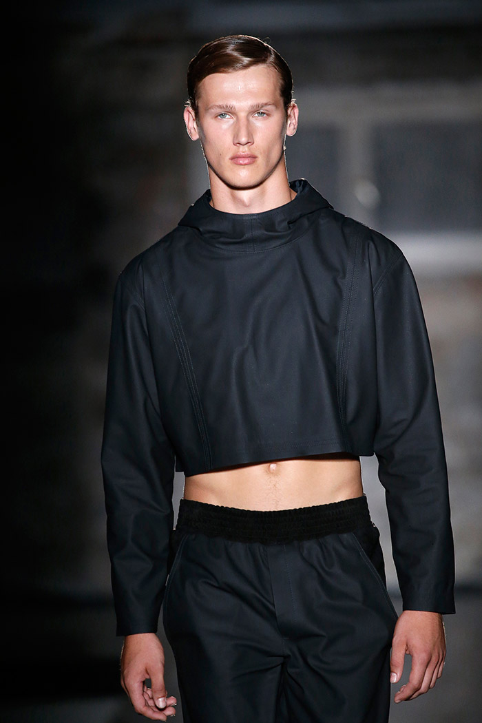 Al fin y al cabo, Javier Girón (que, por cierto, ha trabajado para otras firmas como Jeremy Scott, S. Oliver o Agi & Sam) declina el futuro con una visión de la moda masculina que desafía la tiranía de los géneros por la vía tanto de los tejidos (¡bien de transparencias y satenes!) como de las siluetas, con una gozosa profusión de escotes, cortes que dejan una gran cantidad de carne a la vista ¡e incluso crops! (Sí, ya sabemos que esta es la pieza más odiada de la moda masculina actual, pero hay que reconocer que JNORIG la aplica de forma mucho más que fetén.)