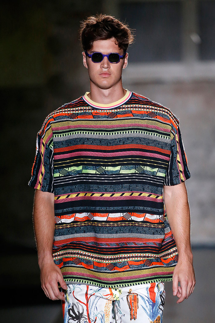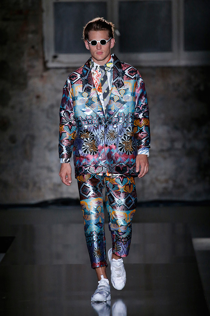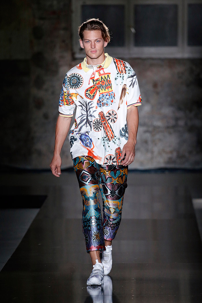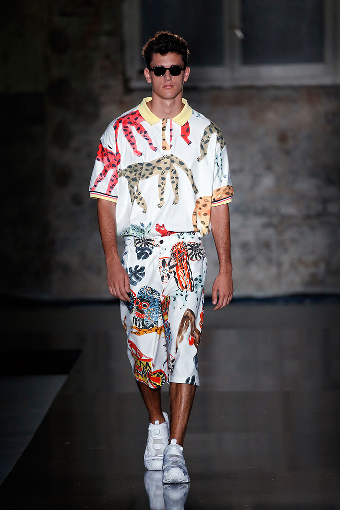 Supongo que a muchos les habrá ocurrido exactamente como a mi: justo antes del desfile de Krizia Robustella en el 080 Barcelona Fashion, bien sentaditos en nuestros sitios, hemos empezado a trastear el flyer que había en cada asiento y en el que se podía leer el nombre de la colección que estábamos a punto de presenciar. «Classy Jungle Brothers«. Espera, un momento, ¿»classy«? El shock es momentáneo: por mucho que con lo que identifiquemos inmediatamente a Robustella sea con el rollo street más irreverente, solo hay que hacer memoria para advertir que en los últimos tiempos ya ha abordado la clase en sus propios términos, ya fuera a través del pimp callejero de su colección «Black Street» o con el outfit de funeral multicolor y celebrativo en «Happy Ending«.