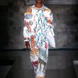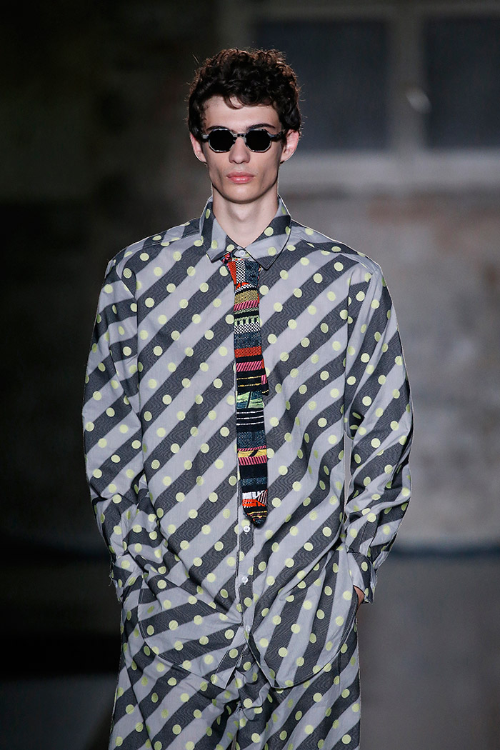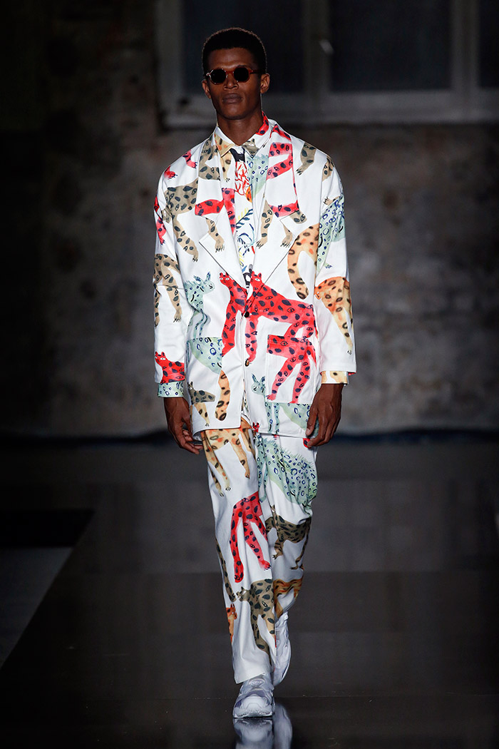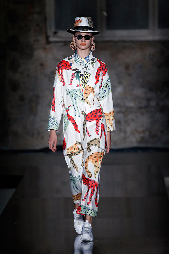 Para empezar, Krizia amplia ostentosamente la paleta de sus patrones. La mujer de estos «Classy Jungle Brothers» se ve agraciada por un toque de sofisticación gracias a siluetas desafiantes como los vestidos con lazo en la cintura, las camisas con bajos en forma de nudos o los impactantes pantalones que convierten el oversize en pura escultura al formalizar una especie de armazón redondeado que nada tiene que ver con la que va debajo. El hombre de esta colección no solo recibe el regalo de camisetas de rejilla y polos oversize, sino que es él quien sale mejor parado de esta revisión de lo «classy» que suma al imaginario de Robustella todo un conjunto de trajes (sí, trajes) y otros patrones más serios, como de sastrería sport.