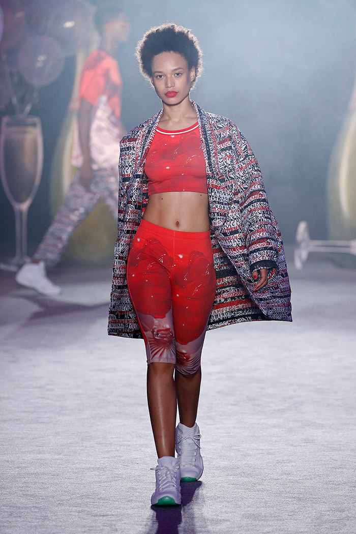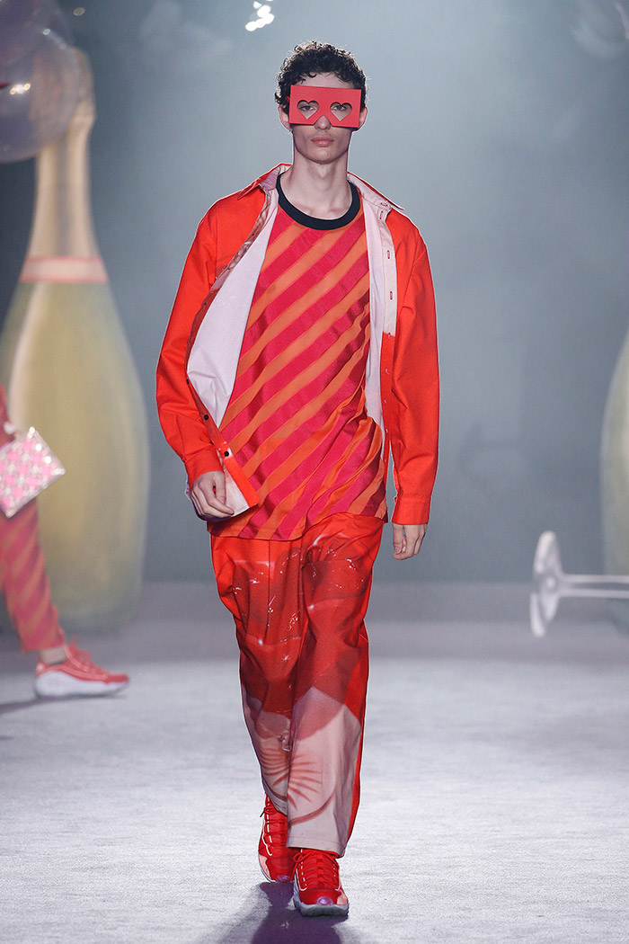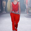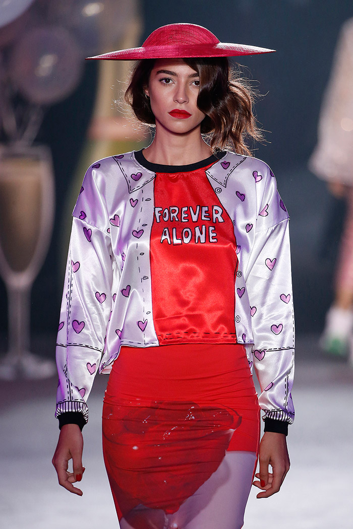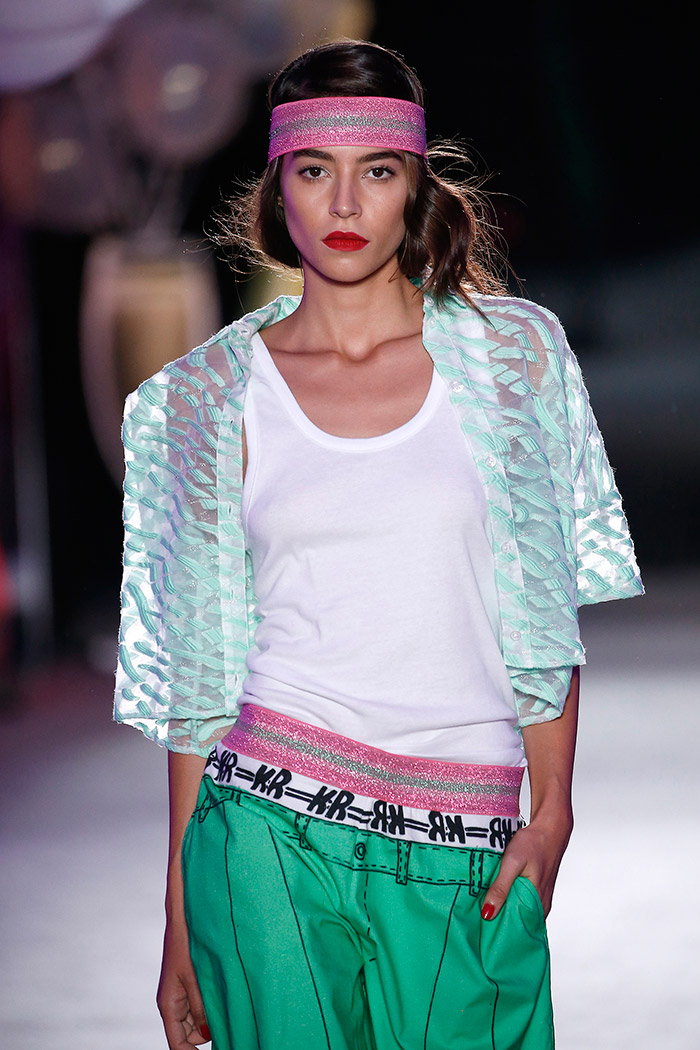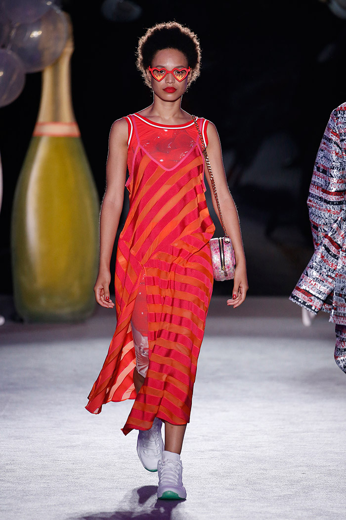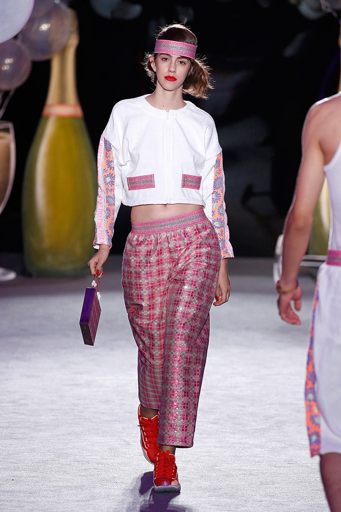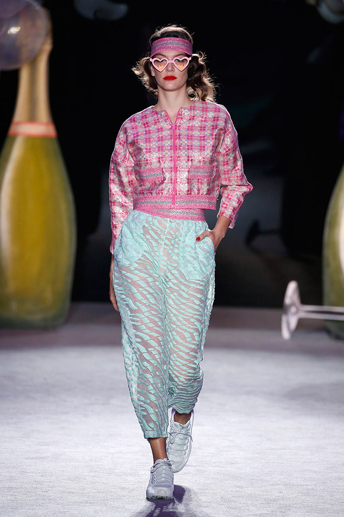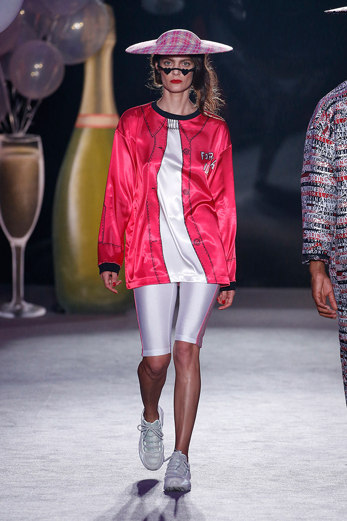 Pero, a la vez, el «Fancy Feast» de la diseñadora es algo que no has visto nunca: el uso de los colores es desafiante y desprejuiciado, los materiales trenzan el bling-bling y lo deportivo con cortes de fiesta (los vestidos vaporosos son, simple y llanamente, una pura maravilla; mientras que la asimilación del corte tipo traje chaqueta sigue haciéndome pensar que, tarde o temprano, Krizia debería regalarnos una colección de pura sastrería o, mejor todadía, de su concepción de la sastrería), los complementos son una locura (mucho ojito a las pamelas, los sombreros o ¡las riñoneras al cuello!)… Y, además, Robustella mantiene sus constantes vitales (un print recurrente como espina dorsal de la colección, ciertos patrones que se repiten gozosamente), pero también las amplía hacia niveles de variedad cada vez más holgados: sus colecciones hace tiempo que no son una variación de un motivo central, sino que cada vez admiten más prints, tejidos, patrones, cortes e incluso autoreferencias a ideas pasadas que rebrotan aquí para añadir capas de sentido a su propuesta.