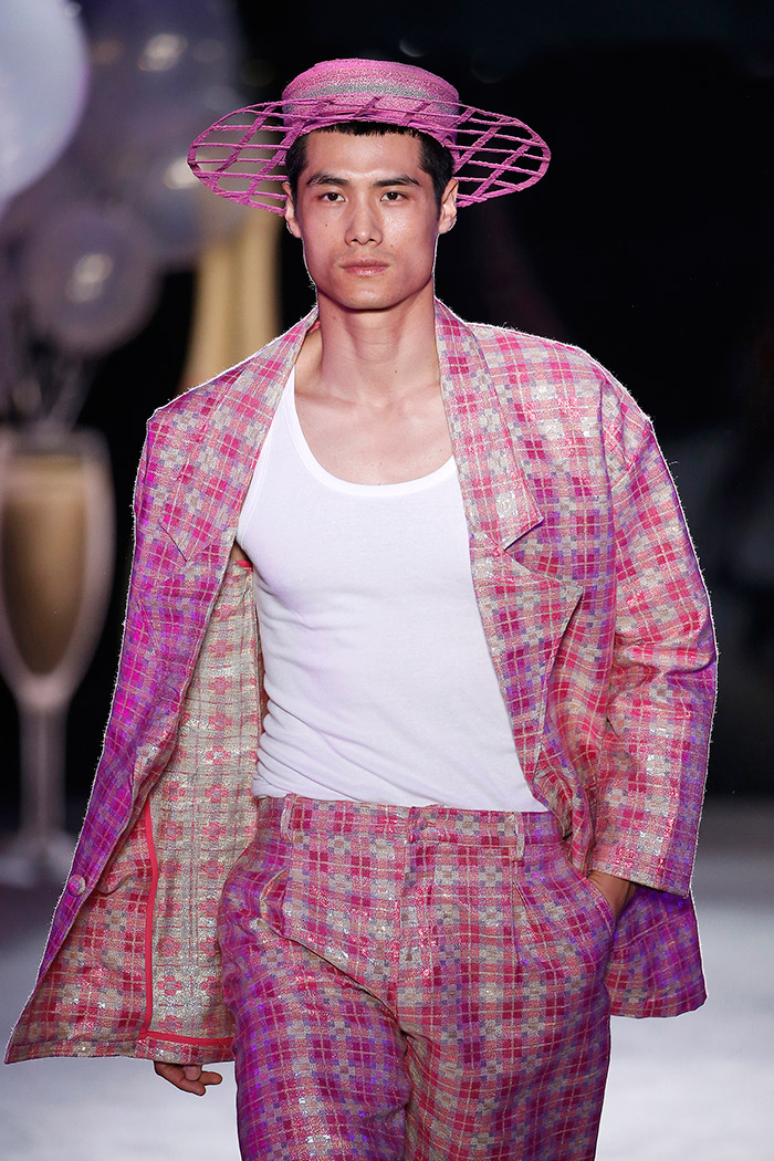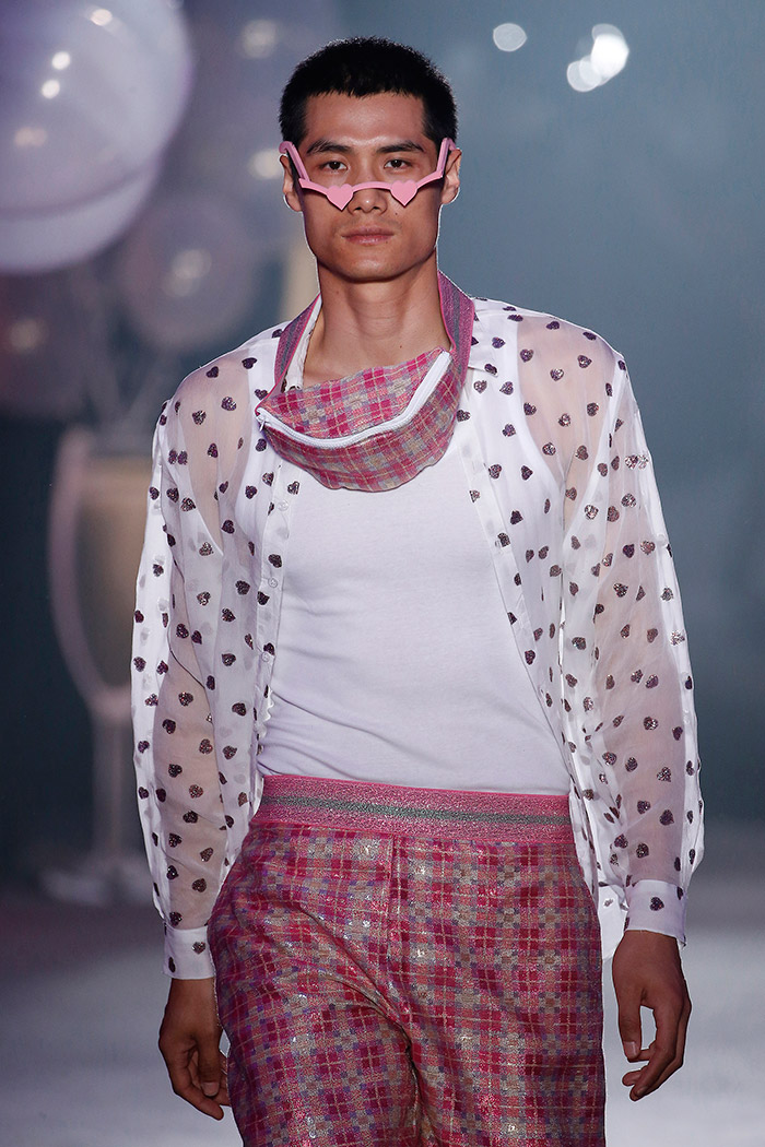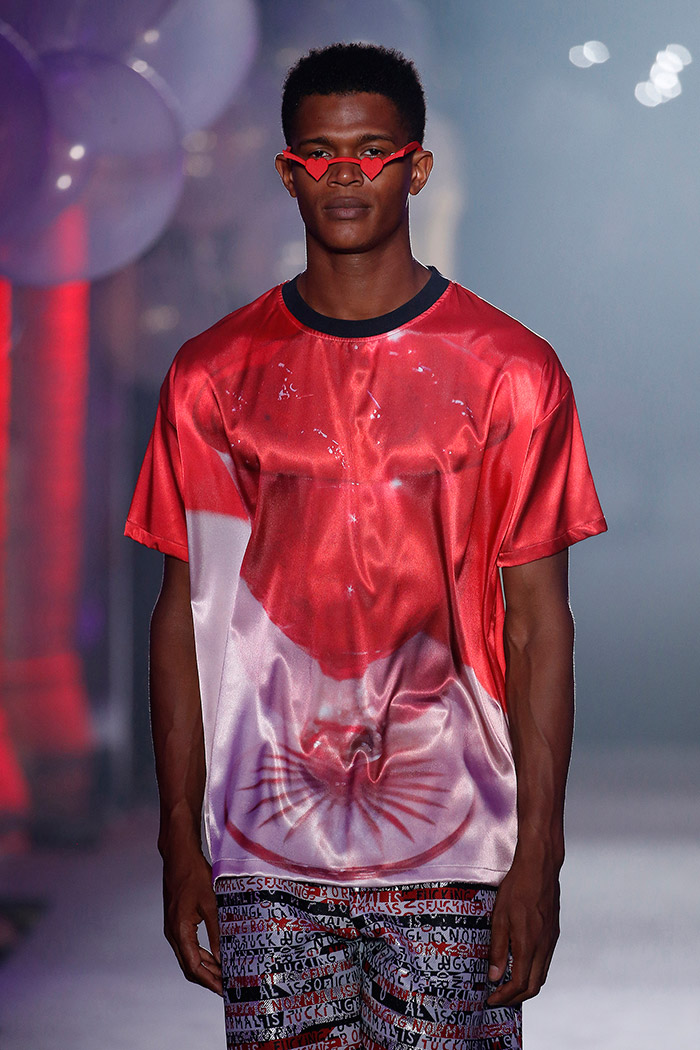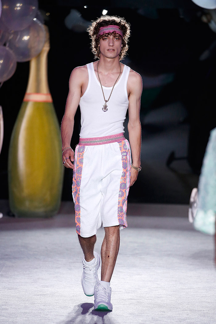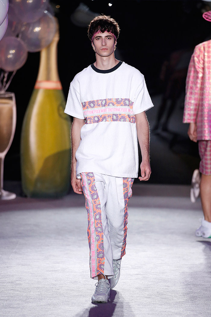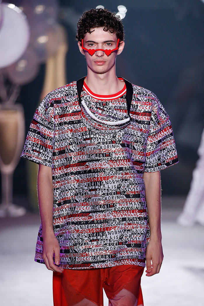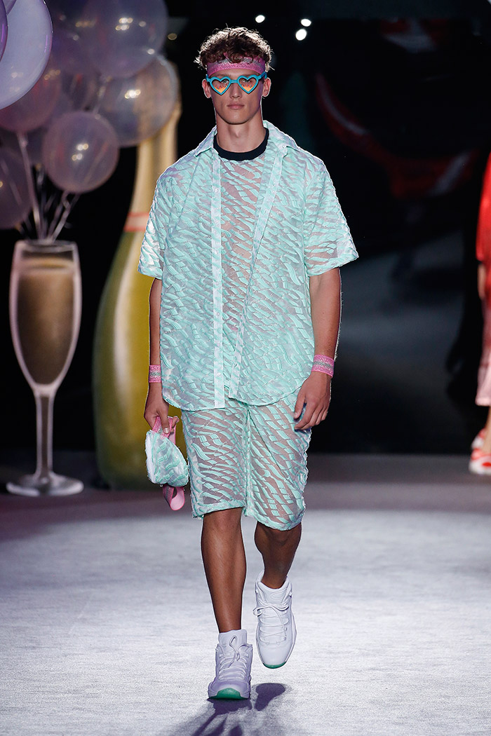 Es este el tipo de moda que practica Krizia Robustella: la diseñadora tiene su propio imaginario, eso no lo puede negar nadie, pero más allá de repetirlo una y otra vez dentro de unos límites cómodos y autocomplacientes, más bien se dedica a redefinir la realidad a nuestro alrededor inyectando un virus colorido y festivo en su ADN. En temporadas pasadas, hemos visto como el lujo deportivo de Robustella se atrevía a reprogramar estéticas más cercanas (el black street yanki, por ejemplo) o más lejanas (los funerales tropicales que se conciben como fiesta y no como drama) e incluso cómo se avanzaba al uso de la nostalgia ochentera en forma de toon (en su caso, con los Osos Amorosos)… Así que a nadie debería extrañar que el nuevo empeño de Krizia sea ni más ni menos que redefinir el dress code del habitual cóctel estival.