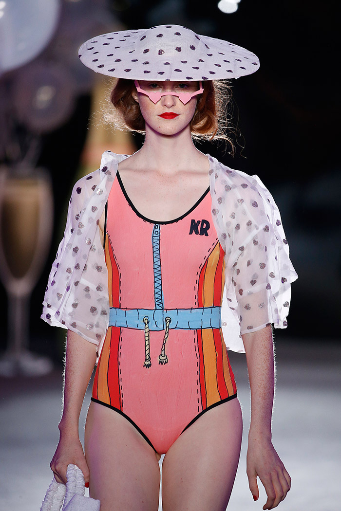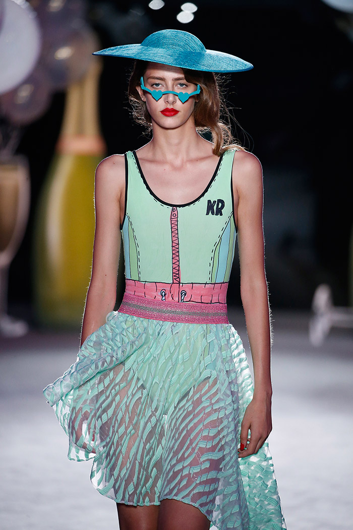 Lo más interesante es que, al fin y al cabo, la diseñadora usa los códigos propios de la estética cóctel para subvertirla y sublimarla de cara a una generación a la que este tipo de eventos le parece excesivamente envarado. El «Fancy Feast» que Krizia Robustella acaba de presentar en el 080 Barcelona Fashion es una colección cóctel en toda regla: vestidos vaporosos, tejidos frescos, elegancia matizada por un punto de informalidad y adoración de los complementos que dejan claro que vas a pasar un rato bajo el sol (es decir: sombreros y gafas de sol).