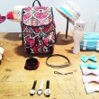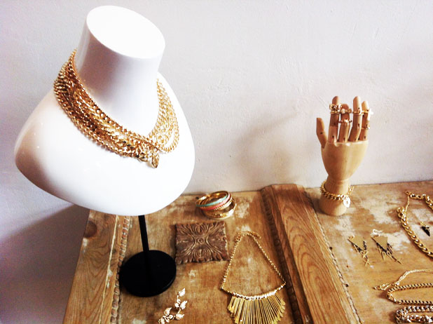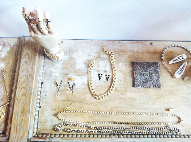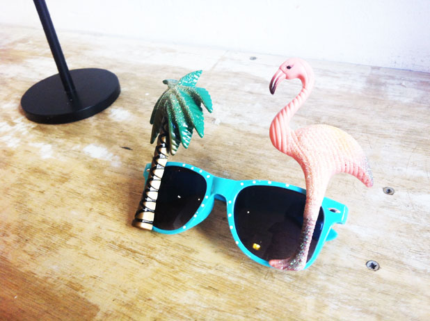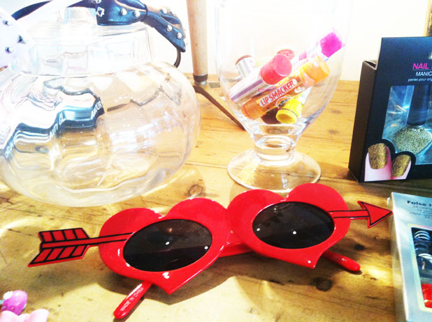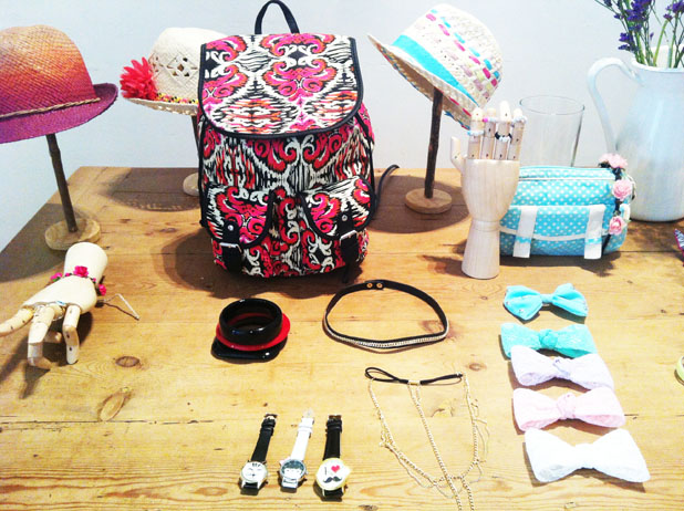 Allí, entre magdalenas con peluca, pasteles con amor y cafés con leche realmente bien preparados (el sitio también tienen buena fama entre los cafeinómanos), descubrimos abalorios preñaditos de Swarovskis falsos, gafas con purpurina, palmeras y flamingos, anillos con onomoatopeyas de cómic, gafas imposibles, también con visera (igual de imposibles), mochilitas para la espalda con su print azteca, colgantes como de indio y totes con estampados rockeros… Todo con un punto a medio camino entre el punkposh y el retro-hippie. Y todo cien cien por festivalero, que esta colección está hecha precisamente para ser lucida entre escenarios y tragos de cerveza y lo mejor de todo: a precios de festipack.