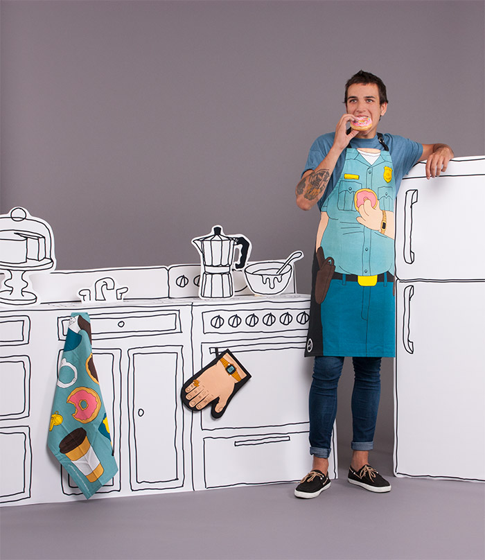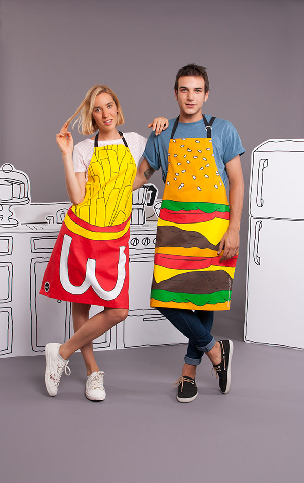 La nueva «Kitchen Collection» está basada en diferentes prints que tienen algo en común: el sanísimo humor tan habitual en la casa Woouf! Los básicos son las figuras de la camarera Wendy y el peli amante de los donuts, pero tampoco habría que dejar pasar algunos estampados de patatas fritas y hamburguesas que parecen salidos del último desfile de Moschino u otros prints que parecen el glaseado de los donuts que se come el policía de más arriba. Al fin y al cabo, cada vez pasamos más tiempo en nuestras cocinas, ¿verdad? Así que ya va siendo hora de que le des un buen meneo a tus trapos (literales y figurados) de cocinero.