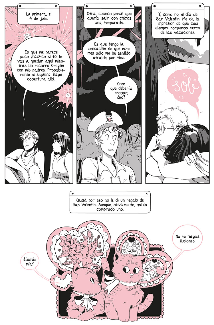 Usando el consultorio de Anna Vice como hilo conductor, Tamaki y Valero-O’Connell consiguen realizar un fascinante y sincero retrato de la realidad de los adolescentes a día de hoy. Adolescentes. Y punto. Sean o no queer. Adolescentes que lidian con sus fiestas de instituto, con sus locales de hamburguesas hipsters (¡con nombres de lesbianas ilustres!), con sus trabajos para sacarse un dinero extra, con sus movidas familiares… Y con ese momento tan extraño pero crucial en el que tenemos que tomar decisiones que afectarán a toda nuestra vida. Tenemos que decidir quién queremos ser. Y, muchas veces, decidir quién queremos ser pasa por decidir también quién no queremos ser.