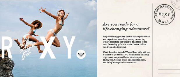 Con el claim “let the sea set you free” («deja que el mar te libere», que suena un poco a «Liberad a Willy» pero mola), los organizadores del concurso buscan a la chica que represente el espíritu Roxy en Europa. Lo que viene a significar una chica alegre, divertida, fresca, natural, que no se corte y que quiera representar a la marca durante este 2012. Pero el premio no es sólo este (que es suculento pero aún hay más). Las tres ganadoras podrán disfrutar de un viaje a Biarritz (Francia) para presenciar el campeonato de surf Roxy Pro, donde tendrán la oportunidad de aprender a surfear las mejores olas del mundo y de conocer a las riders profesionales del team Roxy. Además, recibirán un premio de 5.000 € y un segundo viaje sorpresa lleno de aventura, que apunta a planazo de verano… y de todo el año.