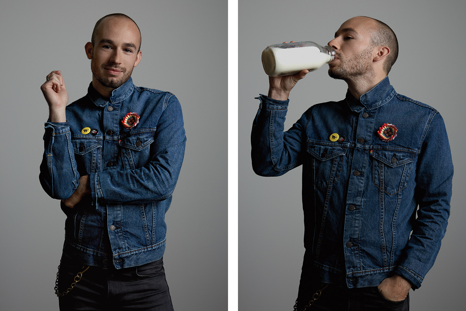 También hay otras locuras preciosas como la «medalla» realizada con etiquetas de Levi’s con la bandera del arcoiris, múltiples parches que hacen referencias de muy diferente calado a la figura de Harvey Milk o una maravillosa camiseta que por delante lleva estampada una botella de leche y por detrás tiene una lista cronológica de los logros que la comunidad LGBTQ ha ido conquistando año tras año con el sudor de su frente.