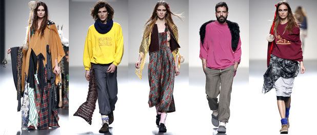 La colección estaba inspirada en un viaje que Maria y Jacobo habían hecho a Hungría, y al rollo folklore balcánico supieron añadirle muy sabiamente un toque muy jovial urbanita. Abrieron con un curioso chumachumba de los Balcanes (la música corrió a cargo de Svetlana Spajic Group, un grupo que descubrieron en el la obra de teatro «Vida y Muerte de Marina Abramovic«), y apareció una modelo que parecía que paseaba un botafumeiro en miniatura y que iba acompañada de lo que parecía una cabra salida de «El Cristal Oscuro«, vestida con un montón de harapos que hubieran hecho la delicia de cualquier protagonista de una peli de Kusturica. Y, a partir de ahí, empezó el desfile de modelos vestidos con telas chandaleras, sudaderas con el original logo de la marca (que por momentos hacía gritar «want!«), maxi jerseys de punto, pantalones abombados, faldas rodilleras y superposiciones en tartán, terciopelo, algodón grueso, pieles y pañuelos. Hay que decir que, según los diseñadores, todos las telas fueron compradas en tiendas de barrio y mercadillos.