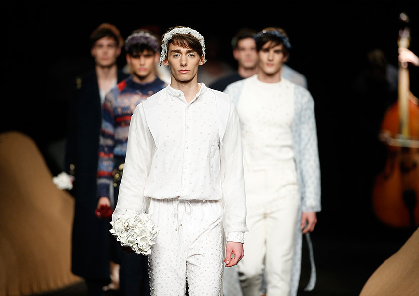Los diseños de la colección «Romeo’s» de Pedro Covelo fueron los primeros en desfilar entre las estructuras de cartón con las que estaba decorada la pasarela, que acompañaron las tres colecciones haciéndolas destacables a nivel escenográfico respeto a los desfiles de otros diseñadores. Tejidos sintéticos y punto se fundían en una delicada vaporosidad, e incluso los diseños menos ligeros y de corte más recto -como abrigos o pantalones slack– seguían conservando un aura poética. Como su nombre mismo indica, la colección está claramente inspirada en el universo shakespeariano. «La rosa no dejaría de ser rosa, y de esparcir su aroma, aunque se llamase de otro modo» clamaba Julieta en el la tragedia del dramaturgo, y aunque la colección de prendas puramente masculinas no dejara espacio para doncellas, su frescura y pasión estaba presente en todo momento en más que en las rosas que todos los modelos llevaban en la mano.