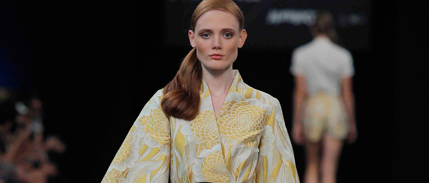 Algo de esto parece haberse planteado Yono Taola en su colección para esta primavera / verano 2016, titulada «El Viaje de Paulet» y presentada en la anterior edición de MBFW: la principal inspiración aquí ha sido el viaje estético y cultural de una mujer europea, cosmopolita y sofisticada a lo largo y ancho de diferentes paisajes del continente asiático. Lo dicho puede verse reflejado en la contraposición de materiales fluidos como la viscosa o la seda con otros rígidos como los brocados dorados o la rejilla. Las organzas de seda, por su parte, refuerzan las siluetas orientales junto a los motivos florales y las lentejuelas. Priman los colores blanco y azul, remitiendo así a la primavera asiática.