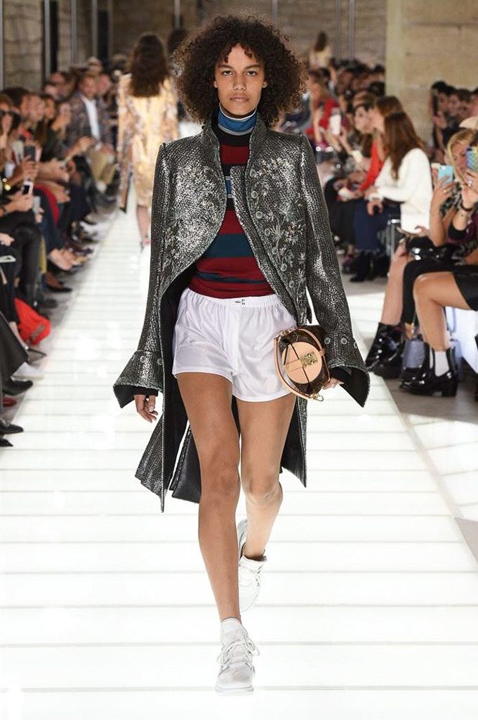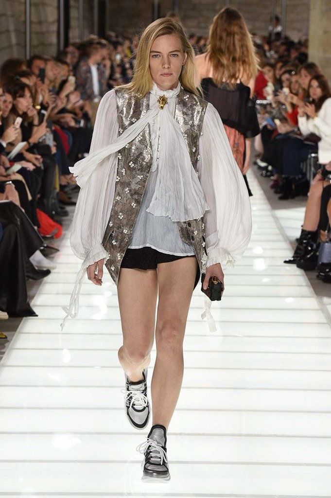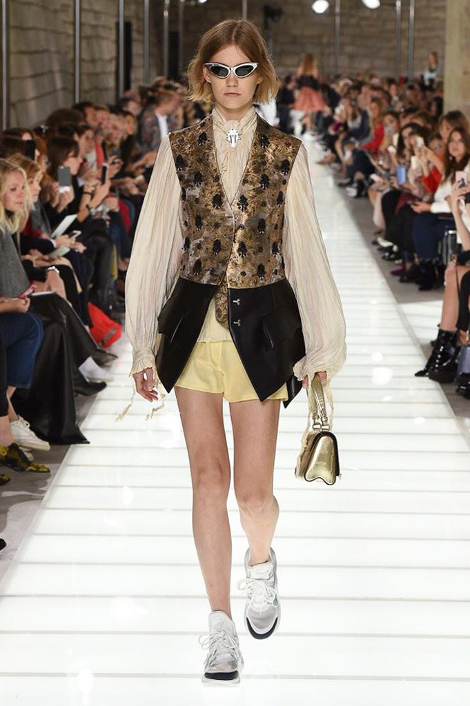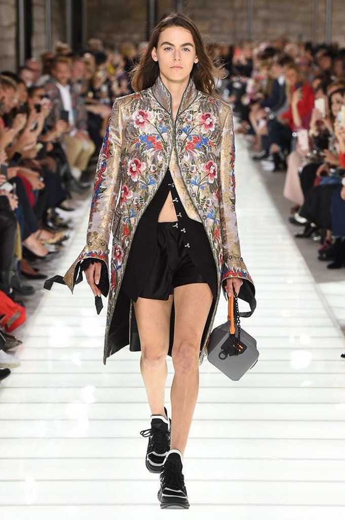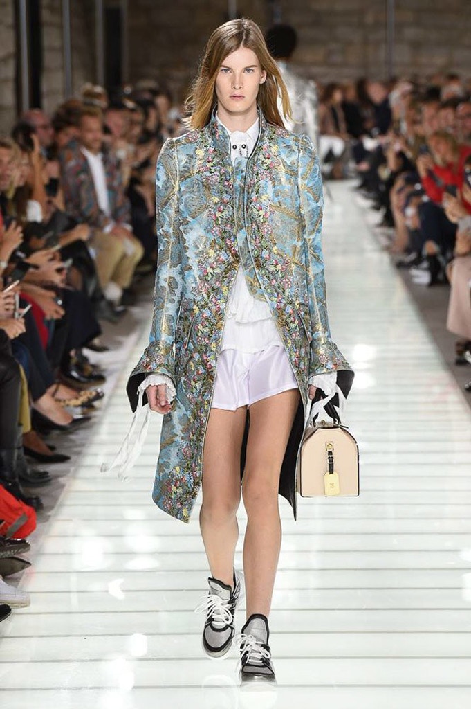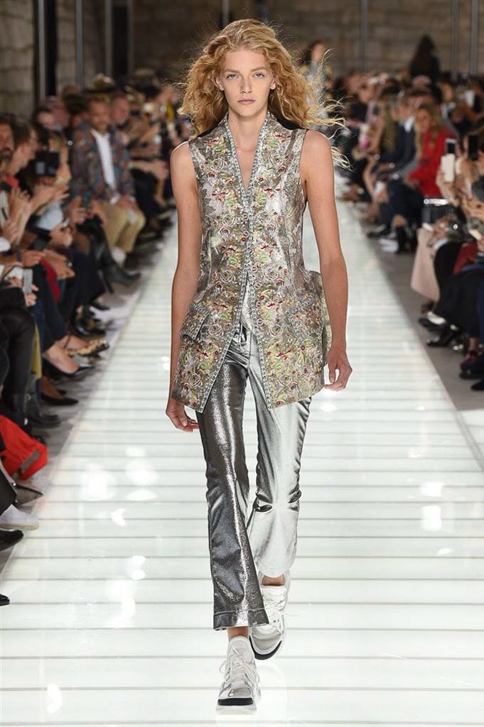 Las magnánimas casacas palaciegas abiertas aportaban con sus churriguerescos diseños el toque barroco contrapuesto a un minimalismo de colores y formas que parecía escurrirse por debajo de estas prendas que más que prendas son declaraciones de intenciones. Faldas con volumen, gasas, puños de corsario, bordados florales… Todo suma en una colección que podría haber sido muy aparatosa pero que Ghesquière consigue convertir en un ejemplo de fluidez que parece pensado para ser ponible tanto por la calle como en las alfombras rojas más estrictas.