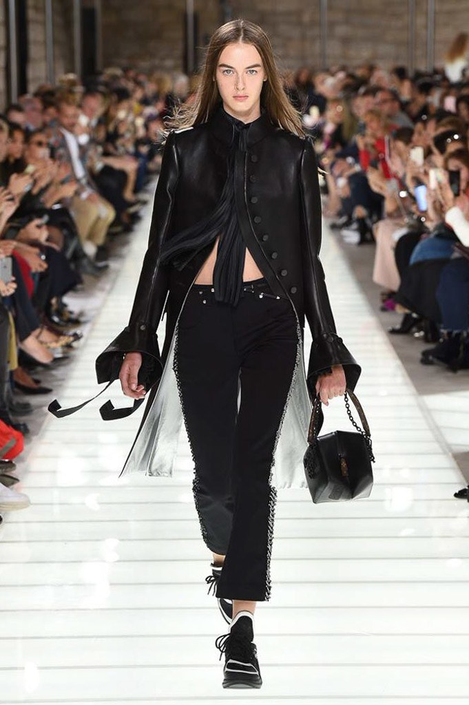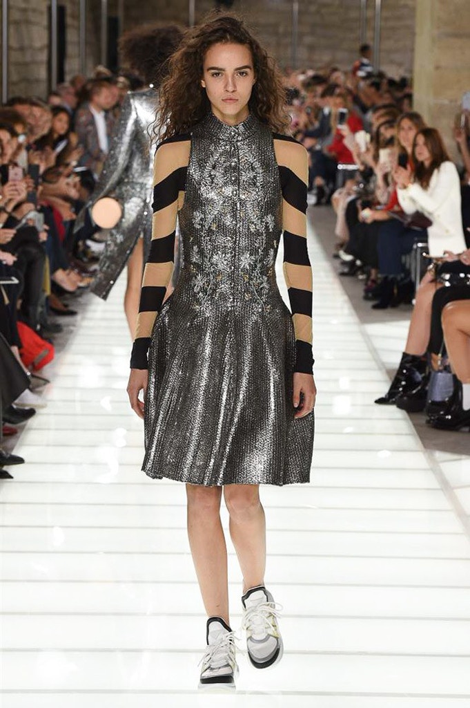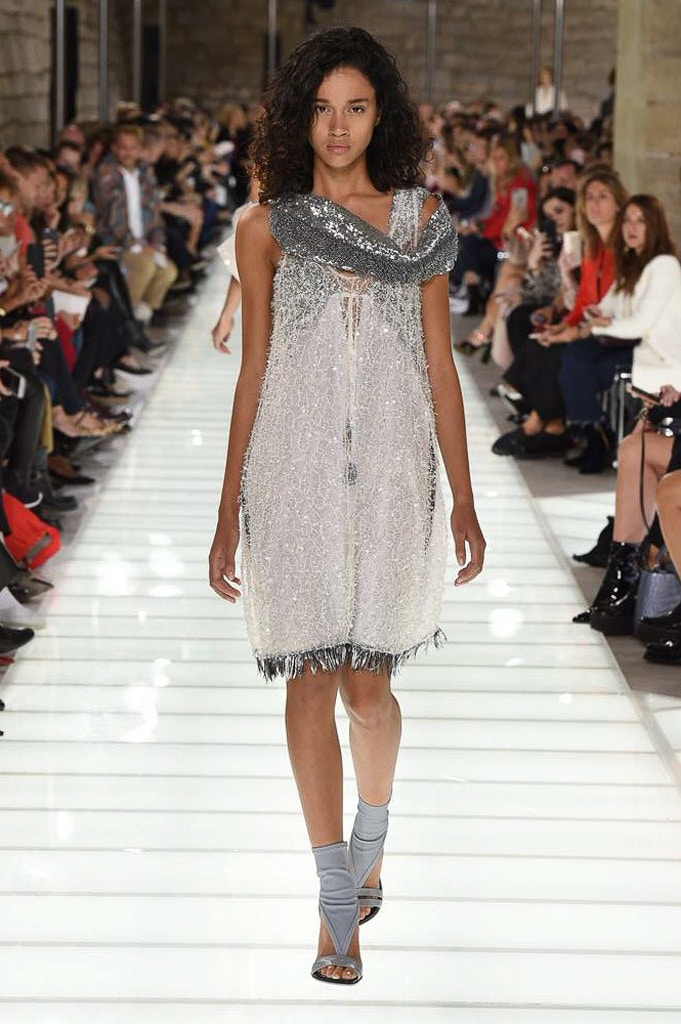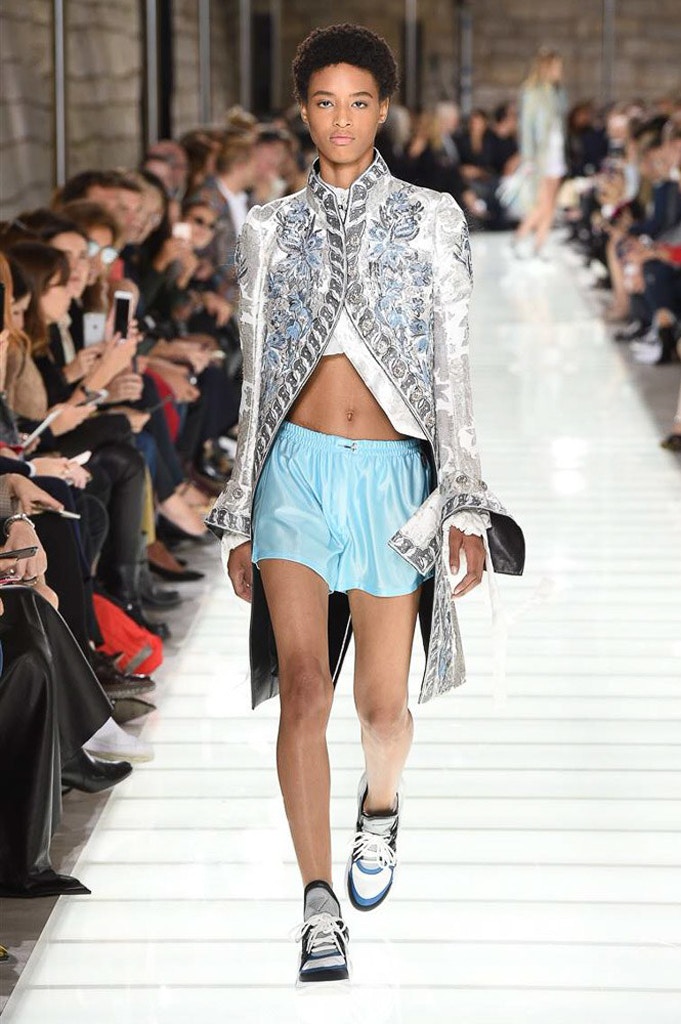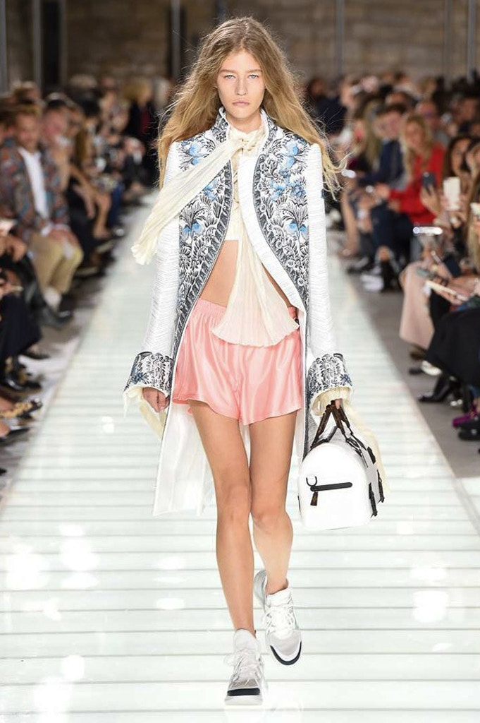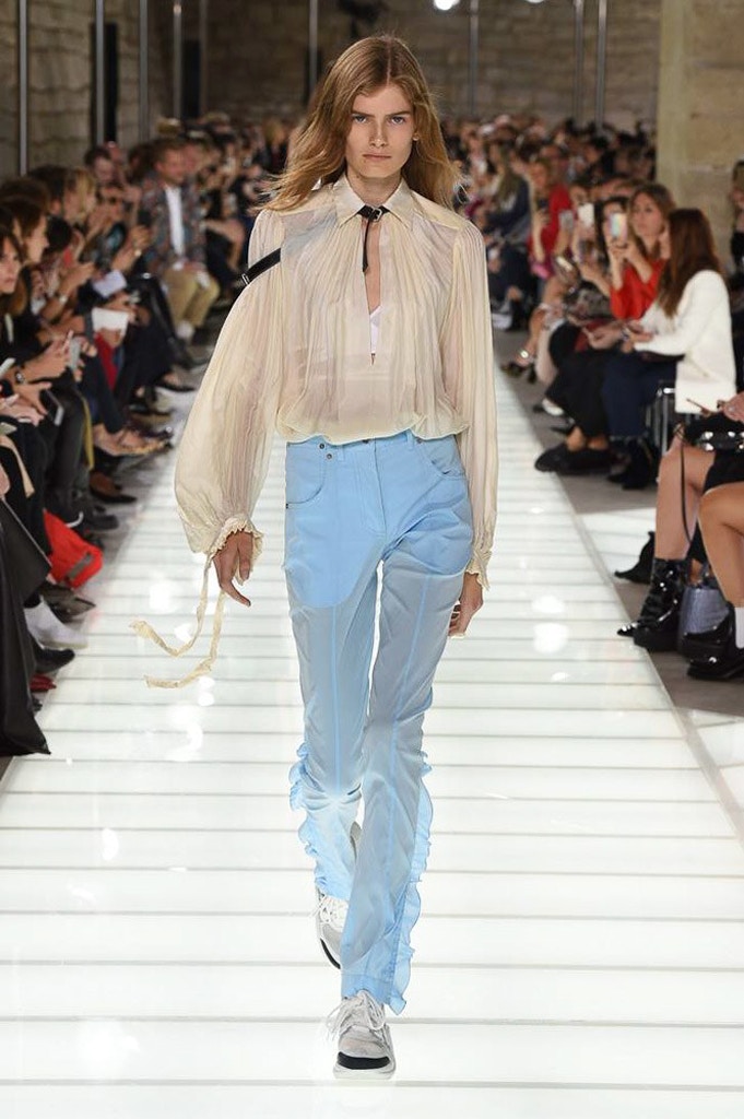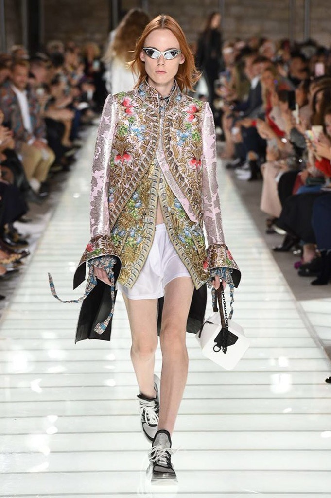 Las magnánimas casacas palaciegas abiertas aportaban con sus churriguerescos diseños el toque barroco contrapuesto a un minimalismo de colores y formas que parecía escurrirse por debajo de estas prendas que más que prendas son declaraciones de intenciones. Faldas con volumen, gasas, puños de corsario, bordados florales… Todo suma en una colección que podría haber sido muy aparatosa pero que Ghesquière consigue convertir en un ejemplo de fluidez que parece pensado para ser ponible tanto por la calle como en las alfombras rojas más estrictas.