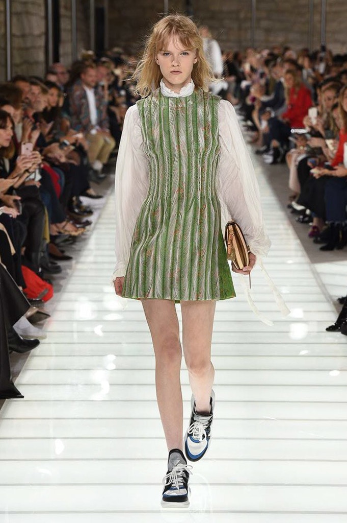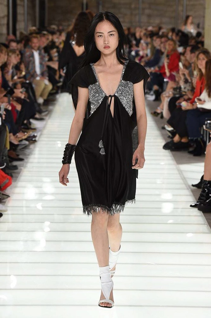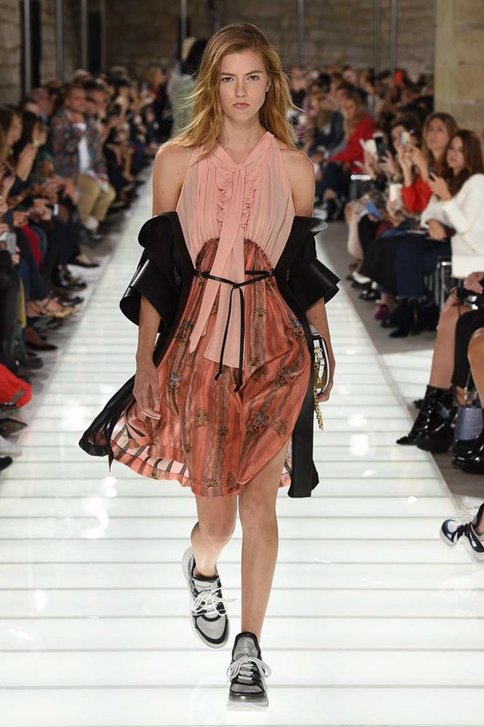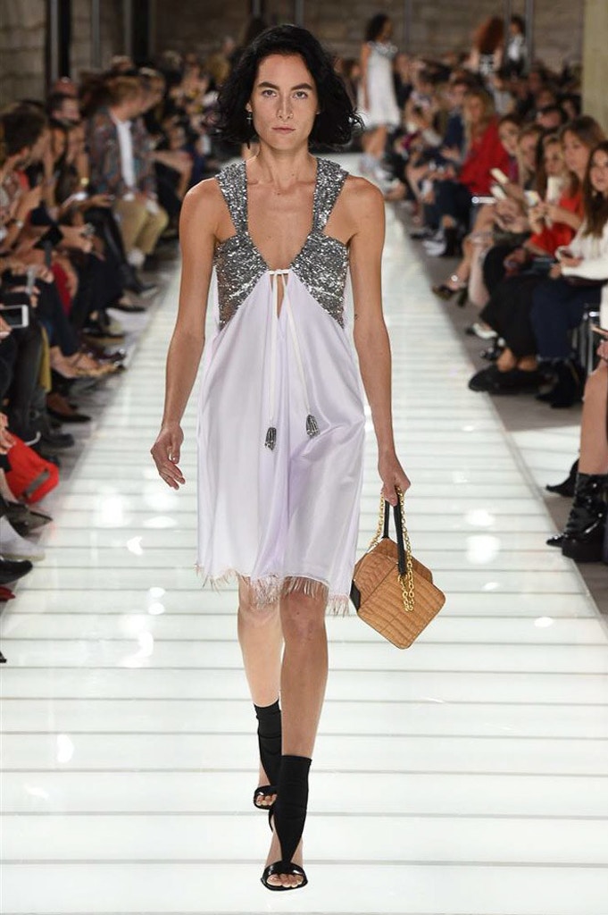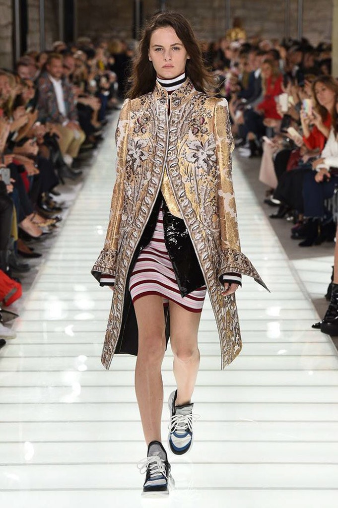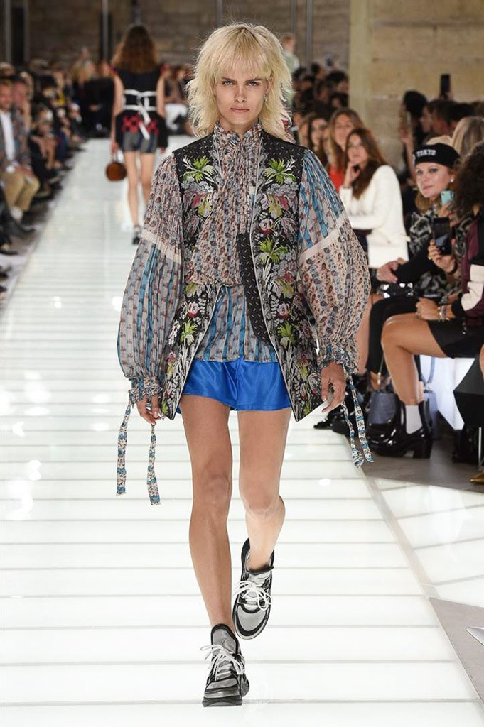 Las magnánimas casacas palaciegas abiertas aportaban con sus churriguerescos diseños el toque barroco contrapuesto a un minimalismo de colores y formas que parecía escurrirse por debajo de estas prendas que más que prendas son declaraciones de intenciones. Faldas con volumen, gasas, puños de corsario, bordados florales… Todo suma en una colección que podría haber sido muy aparatosa pero que Ghesquière consigue convertir en un ejemplo de fluidez que parece pensado para ser ponible tanto por la calle como en las alfombras rojas más estrictas.