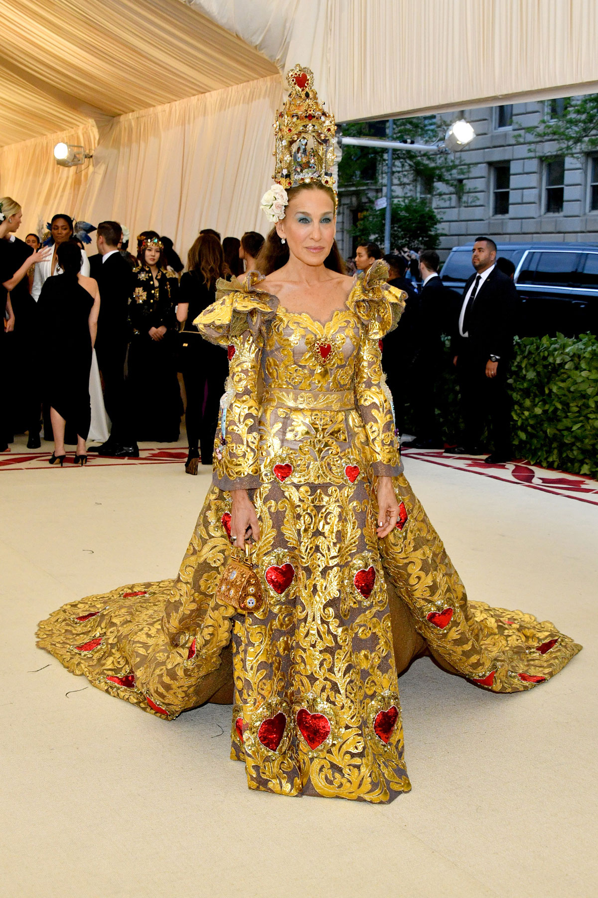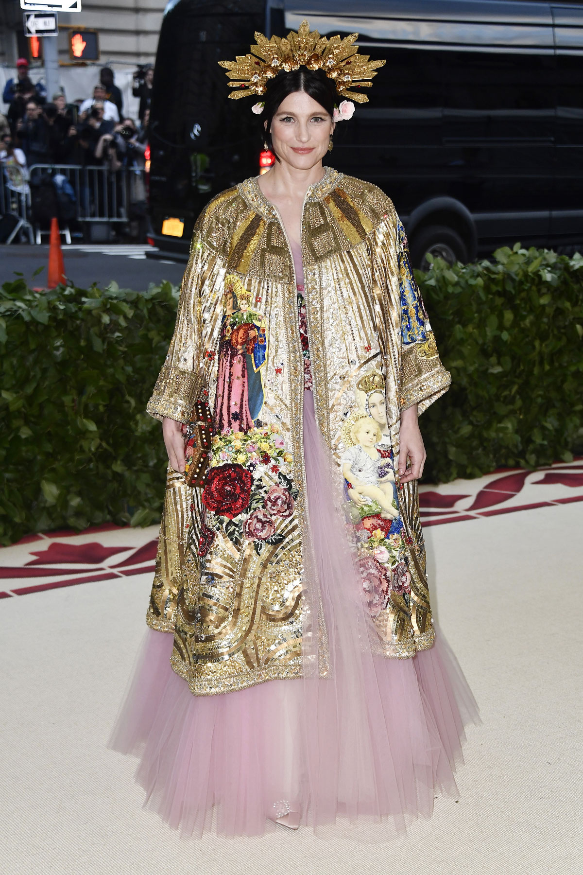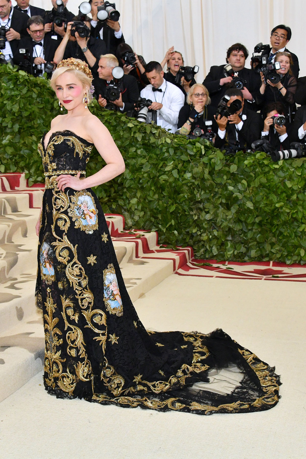 El pecado más común de todos es, de hecho, el exceso… Y de eso han pecado precisamente Donatella Versace (que tan bien ha vestido a otros y, sin embargo, ha decidido pornerse unas botas hórridas que parecen salidas del peor capítulo de «RuPaul’s Drag Race«), Sarah Jessica Parker (Dolce & Gabbana) luciendo una procesión en la cabeza, Emilia Clark con un Dolce & Gabbana que es way too much, Jennifer López en un Balmain que molaría si no fuera por la cola de plumas que no pintan nada ahí, Madonna en un Jean Paul Gaultier que confunde la «gótica realness» con el catolicismo, Juliette Binoche enfundada en su particular muerte por dorados, Salma Hayek diciendo que lleva estampado el Paraíso cuando en verdad lleva estampado el cuadro que todas nuestras abuelas tienen en sus salones, Lena Dunham con un maquillaje que tiraba al traste un vestido más que aceptable, Shailene Woodley cagándose en Zendaya al ver que su Juana de Arco parece un disfraz, Stella Maxwell (Moschino) con demasiadas vírgenes encima, Susie Bick (Gucci) como La Dama de las Espinas y Taylor Hill con un disfraz de obispo sacado de la sección «secretarias cachondas» del Party Fiesta.