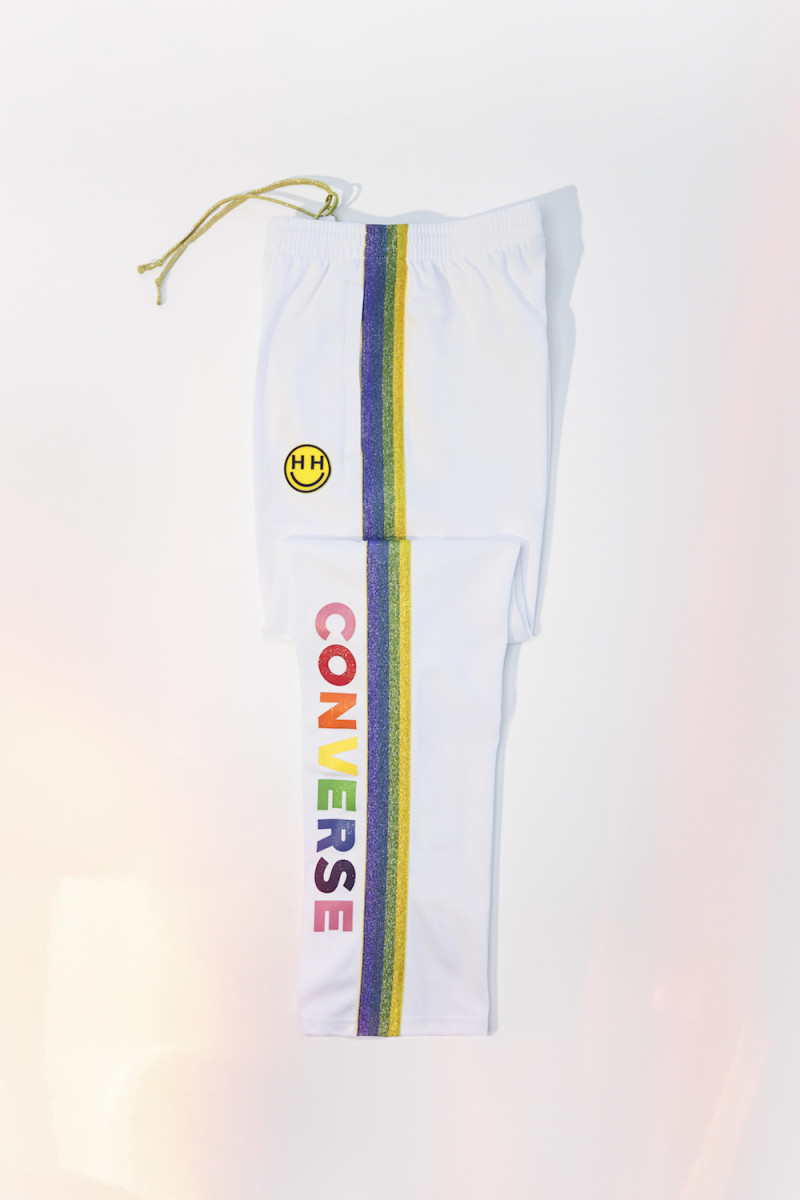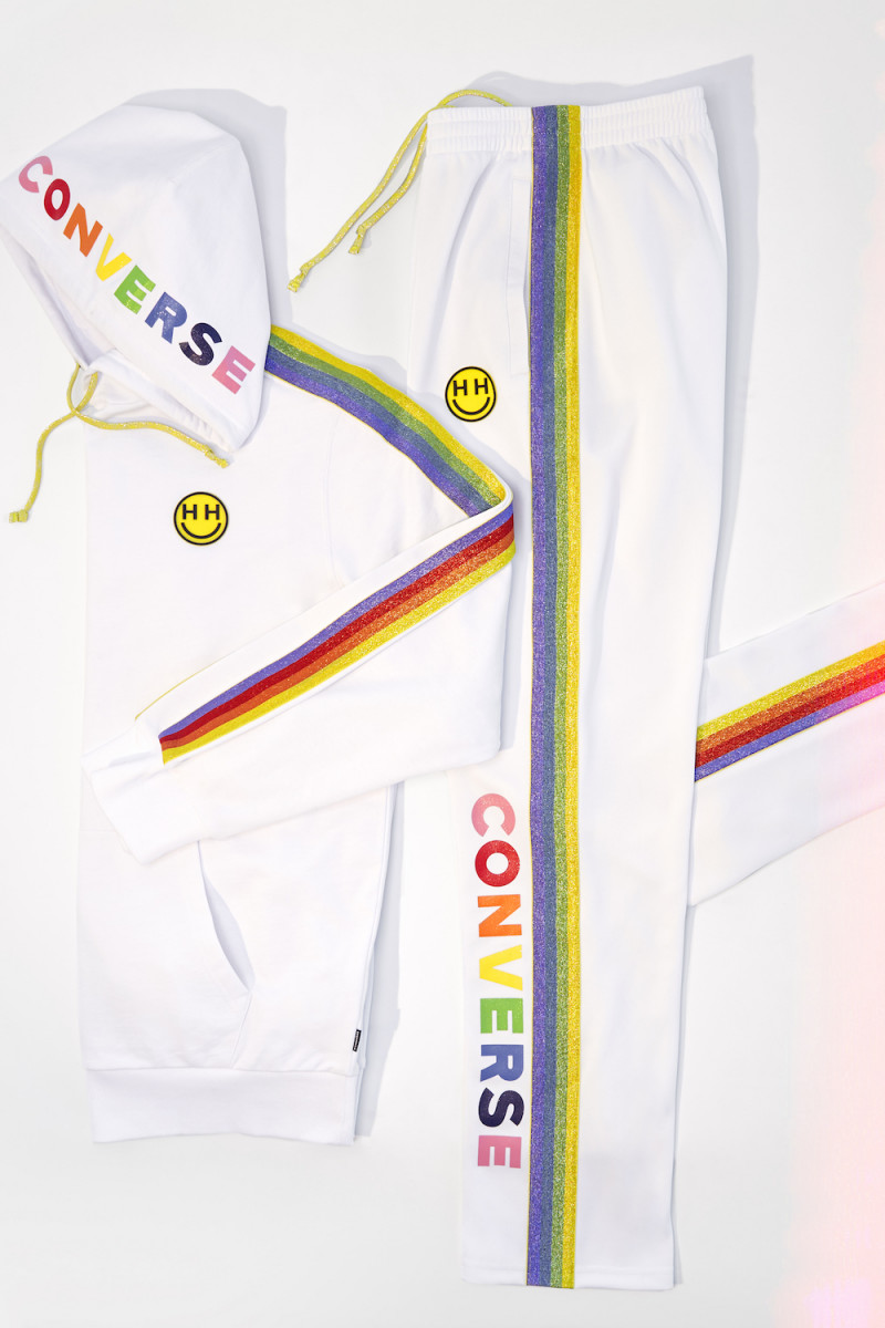 Son prendas que apuestan por la sencillez (lo que, la verdad, se agradece en un este mes que a veces se encirca demasiado), pero que también se permiten pequeños excesos como el chándal de dos piezas con las bandas laterales de arcoíris o, sobre todo, los plataformones en forma de rainbow infinito. También aparece aquí y allá un parche en el que podemos leer las dos letras HH, que son las siglas de Happy Hippie Foundation, la ONG de ayuda a la comunidad LGBTIQ a la que irá a parar parte de la recaudación de esta colección junto a otras asociaciones como It Gets Better Project, Minus 18 o RainbowYOUTH.