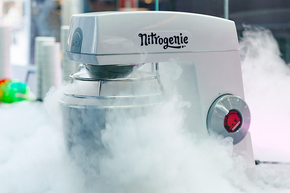 En mi caso, quien tuvo a bien invitarme a preparar mi propio helado con nitrógeno líquido fue la buena gente de Nitrogenie, que acaban de importar a España esta marca nacida ni más ni menos que en Australia con la finalidad de popularizar este tipo de helado que, hasta el momento, parecía reservado para las preparaciones complejas de los restaurantes con varias estrellas Michelin. Al fin y al cabo, el helado preparado con nitrógeno líquido es una creación de los hermanos Adrià para el ya difunto El Bulli. Desde entonces, otros restaurantes lo ha incorporado a su carta de postres… Pero, claro, ¿quién tiene el bolsillo lo suficientemente ancho como para permitirse este tipo de restaurantes día sí y día también?