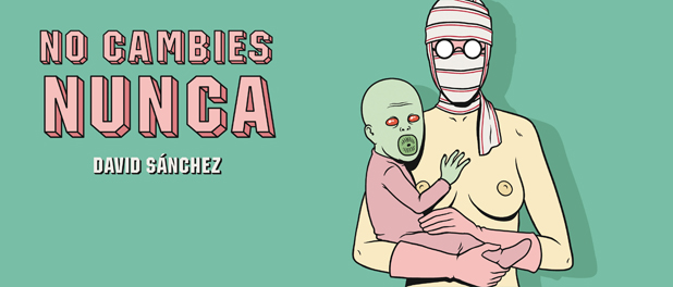 Zoofilia, transexuales, monstruos alienígenas verdes, experimentos en laboratorios secretos y chinos drogadictos. No, no es el último proyecto de David Lynch ni un nuevo cómic de Charles Burns. Pero podría serlo -salvando las distancias-, ya que David Sánchez y su reciente «No Cambies Nunca«, de la misma manera que su «Tú Me Has Matado» (Astiberri, 2010), beben de esos dos grandes maestros de lo terrorífico y retorcido como son el director de «Corazón Salvaje» y el autor de la eterna «Agujero Negro«. Con sus segunda obra, David Sánchez lo ha vuelto a conseguir. A través de una paleta de colores fríos y planos nos presenta una historia surrealista a la par que potente, con imágenes que se te quedan grabadas a fuego en la retina desde el primer momento como la rata muerta que aparece en la primera viñeta o las deformaciones faciales que afectan a algunos personajes que recuerdan al pobre Joseph Merrick, más conocido como El Hombre Elefante.