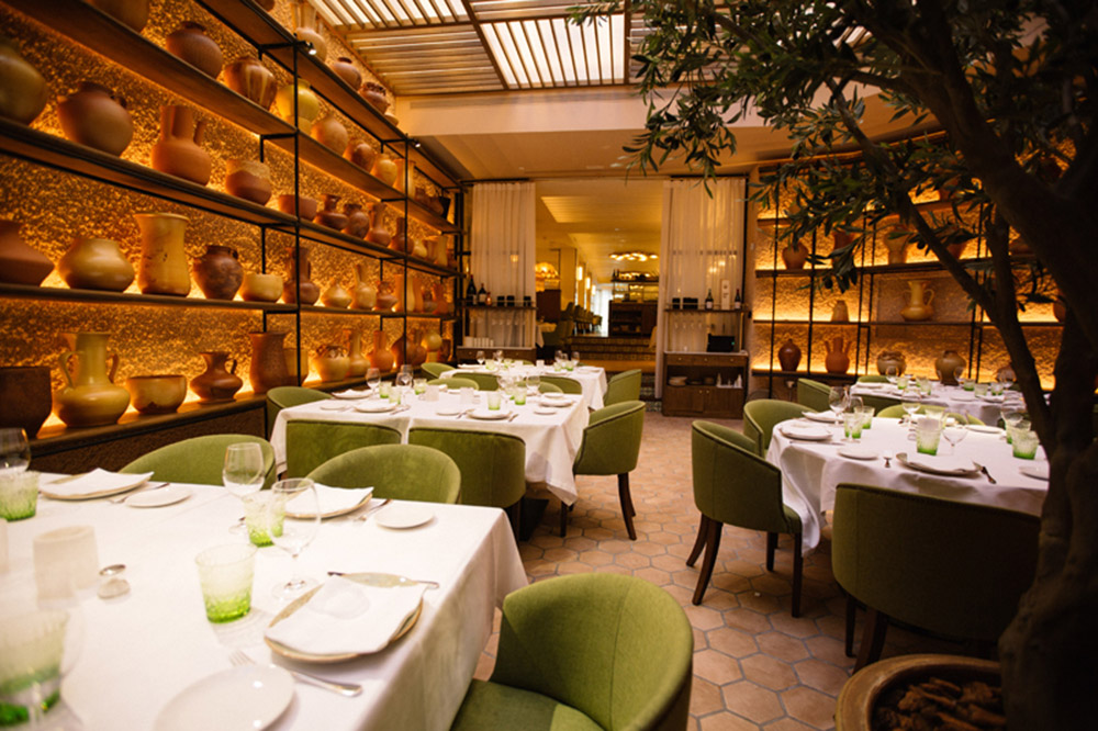 Una de las partes más curiosas de la experiencia que supone el nuevo L’Olivé es, precisamente, mirar a tu alrededor y darte cuenta de los comensales tan diversos que atrae. Por un lado están los señores y señoras de toda la vida, que sabes que tienen sus platos favoritos en la carta y que siguen viniendo porque esos platos se han conservado en versión mejorada. Y, por otro lado, están los que, como tú y como yo, vamos a L’Olivé porque, entre tanta gastronomía avant la lettre, de vez en cuando necesitamos un chutazo de sabores tradicionales en el paladar. Ambas tipologías de comensales se juntan bajo el techo del local renovado por el estudio Lázaro Rosa-Violán, que ha reservado un espacio amplio y acogedor para una entrada con la cocina a la vista y que, sobre todo, ha abierto el salón interior a un espacio con luz solar que entra por una claraboya y que baña un rincón de paz rodeado de ánforas.